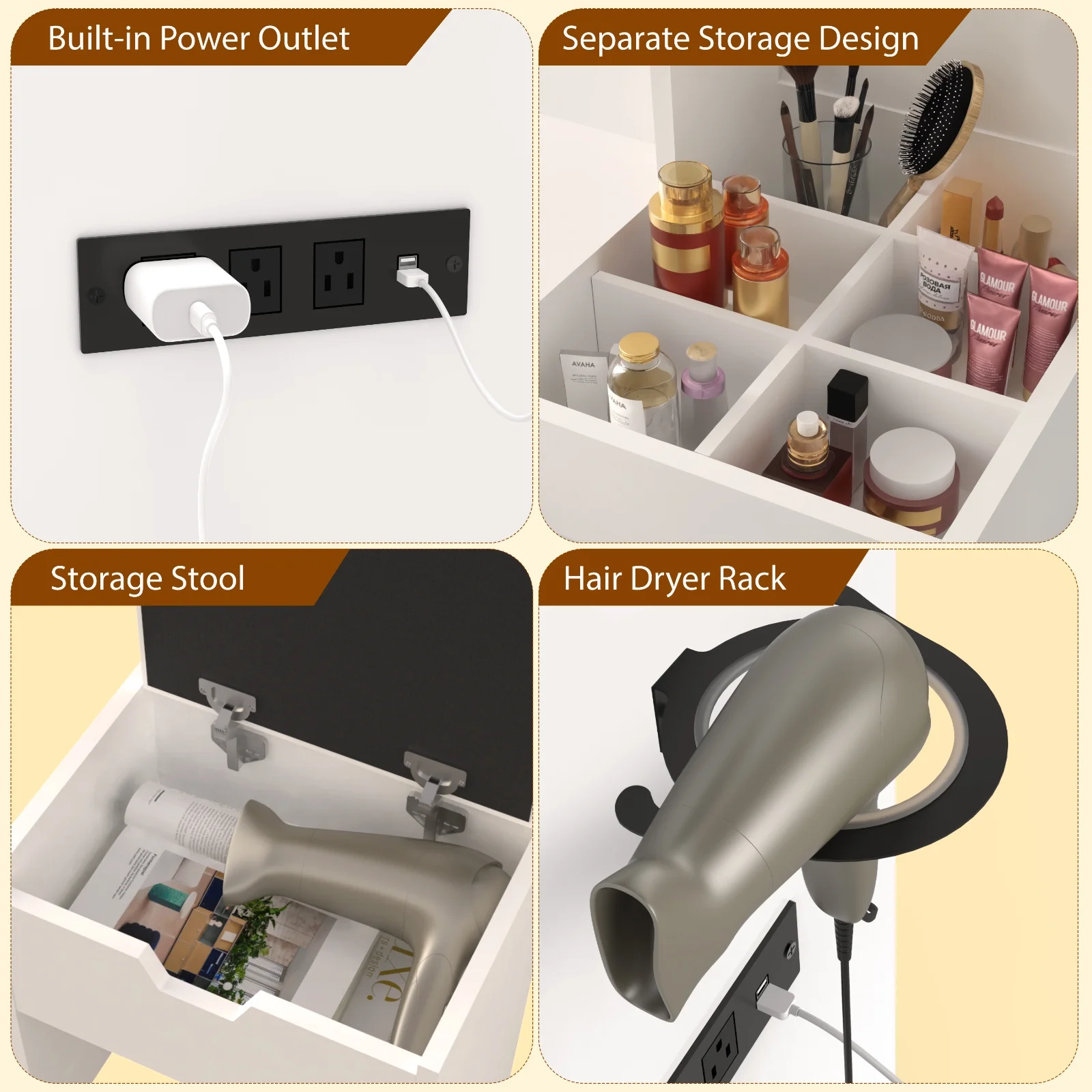 - This vanity desk comes complete with a charging station featuring 3 standard power outlets and 2 USB ports, keeping your devices powered up.