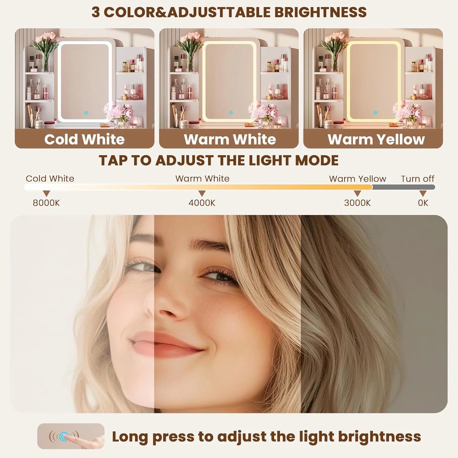 - Enjoy 3 adjustable brightness levels for the 10 Hollywood-style plastic light bulbs, offering warm, natural, and cool color modes to suit your preferences.