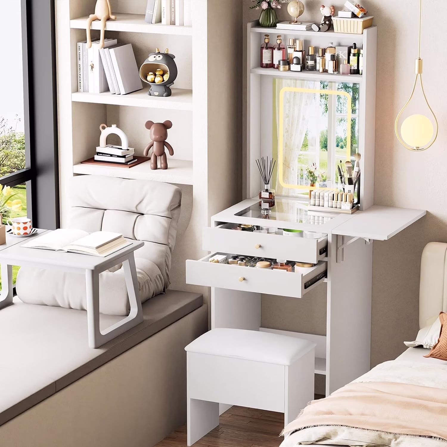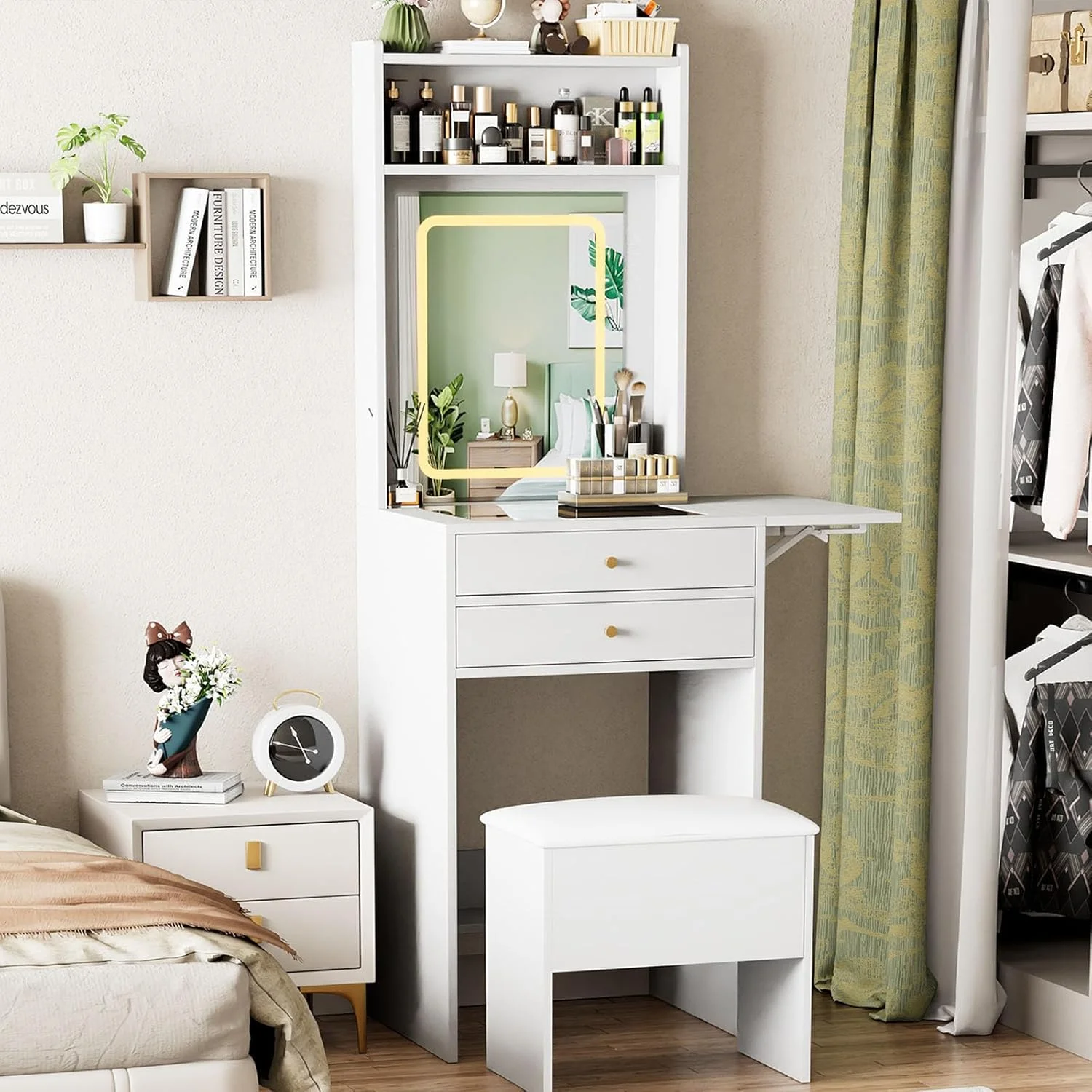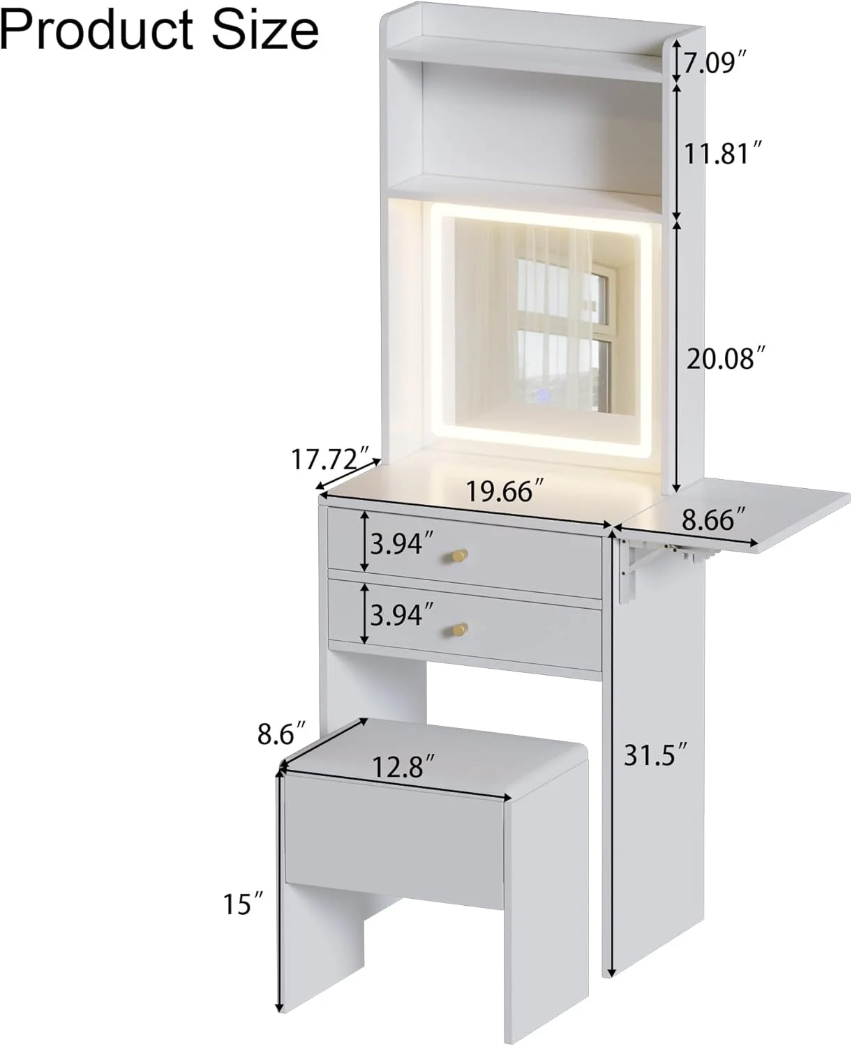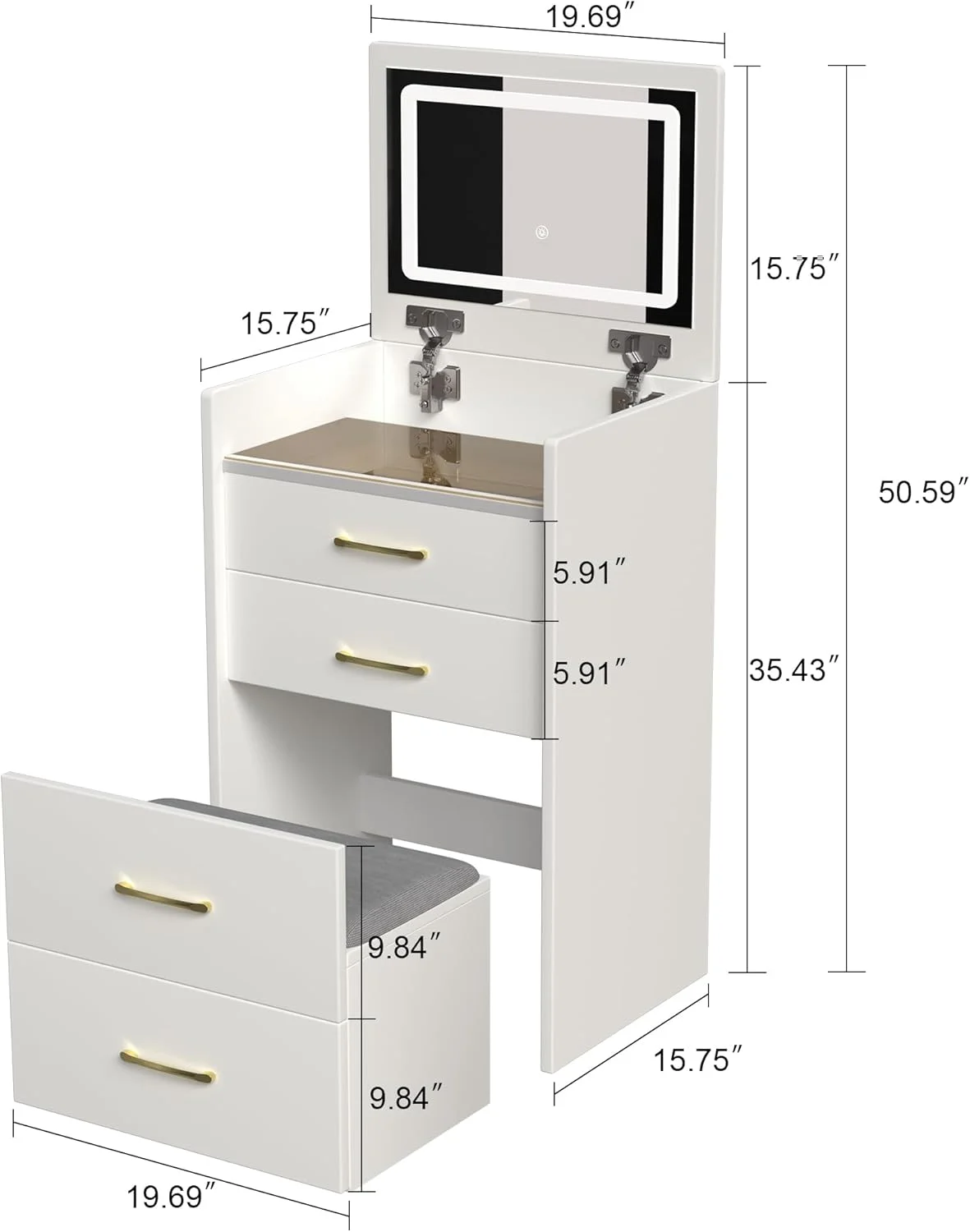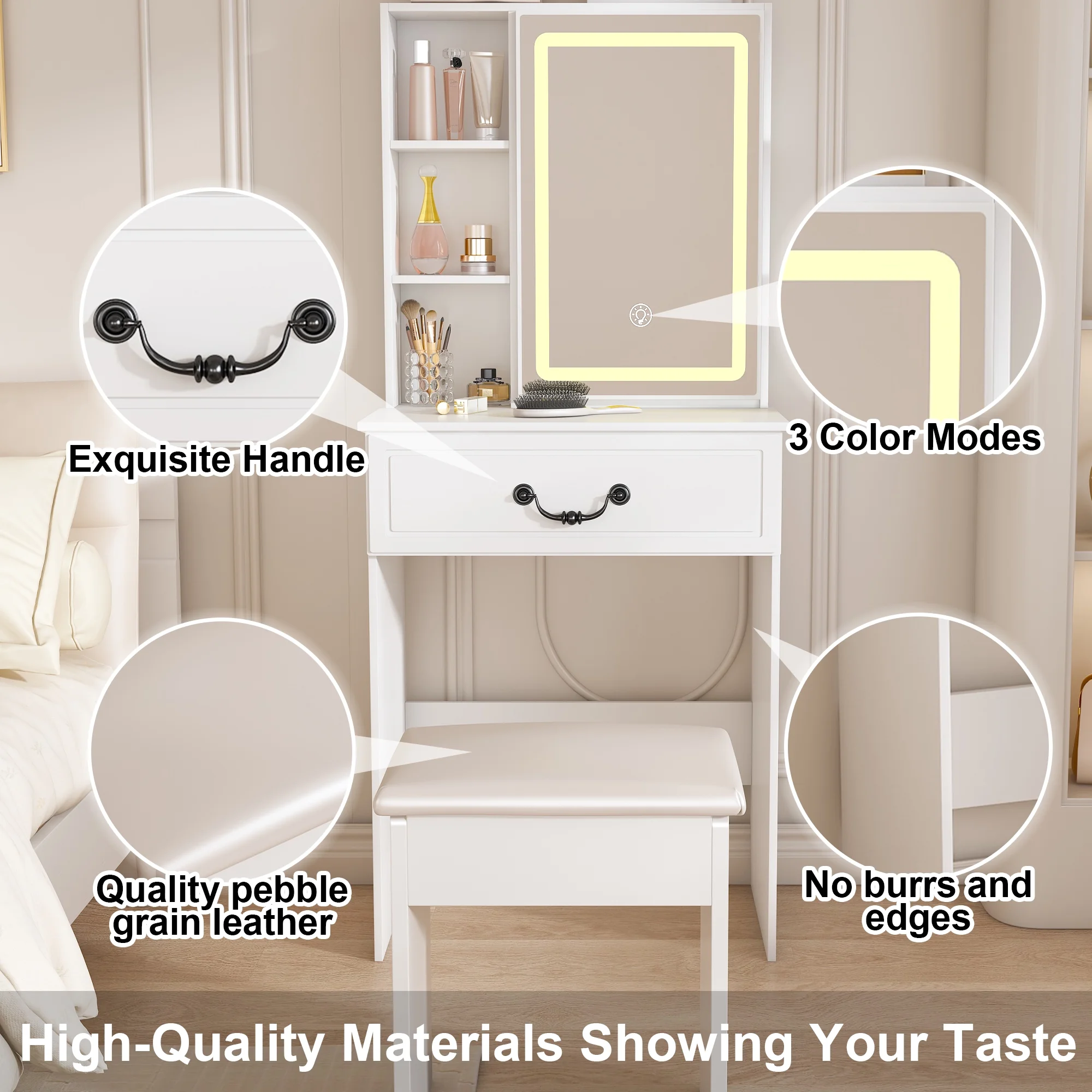 Montary Modern Mini Vanity Set w/Adjustable LED Mirror - Space-Saving Makeup Station & Hidden Storage (White)