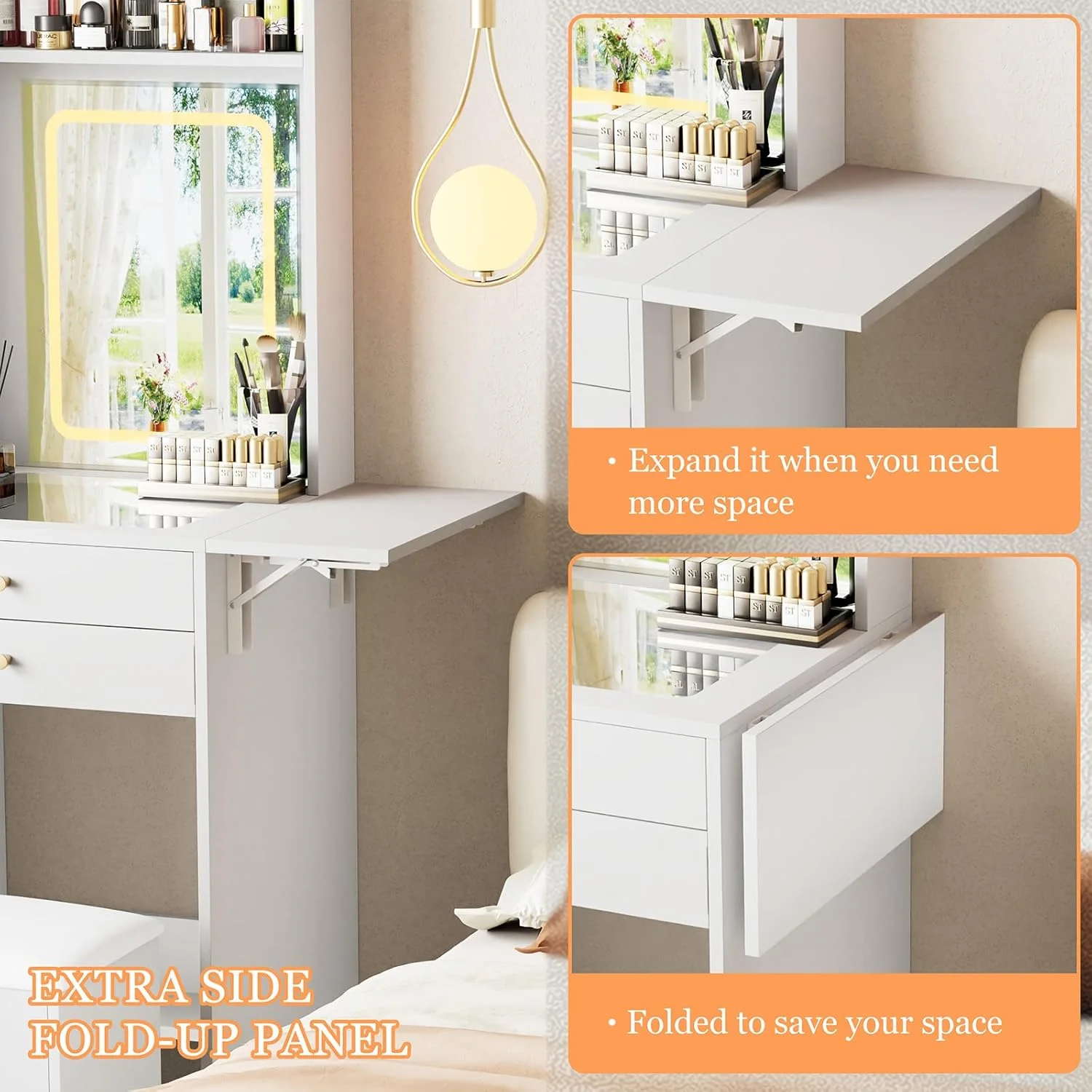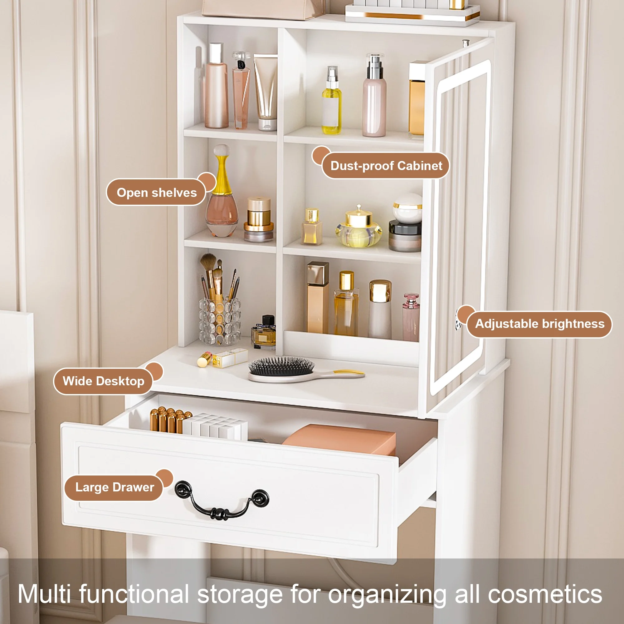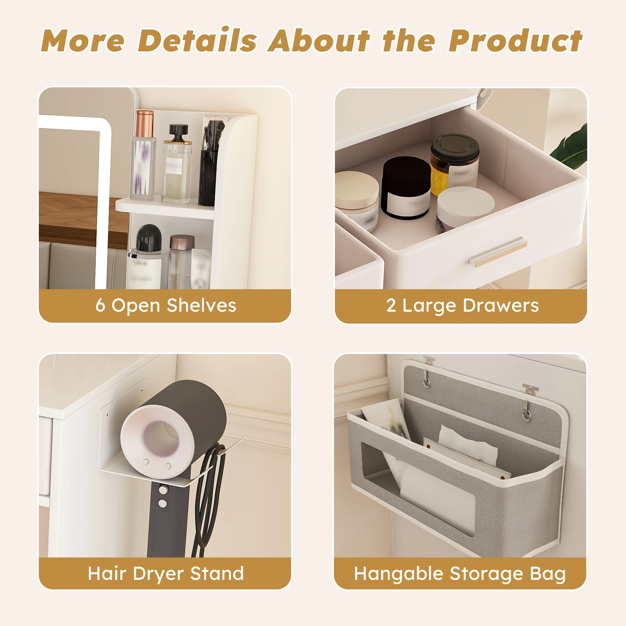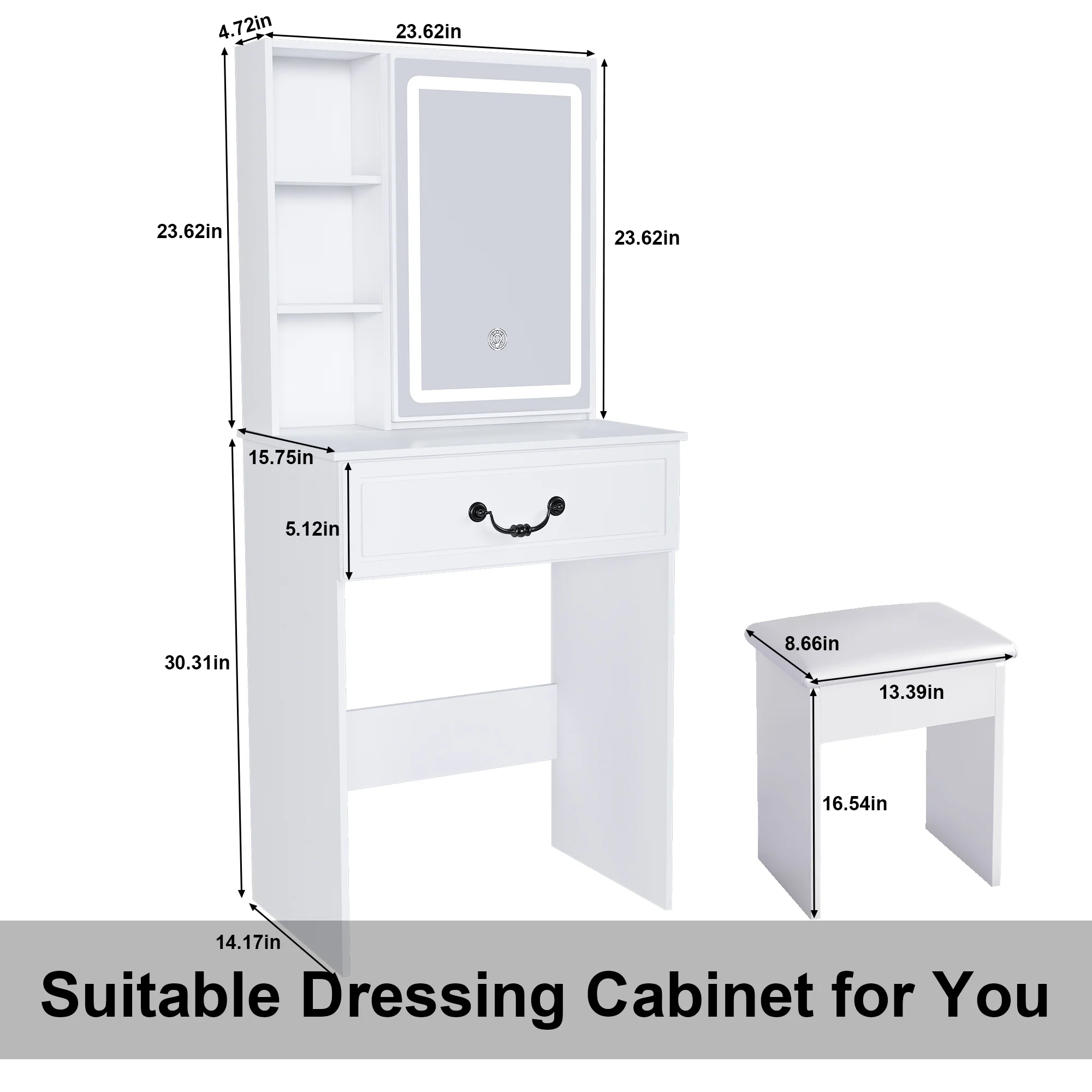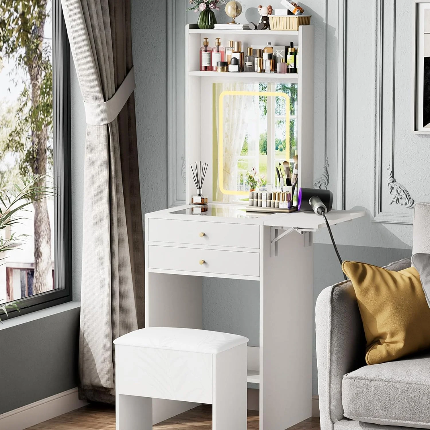 Montary Modern Mini Vanity Set w/Adjustable LED Mirror - Space-Saving Makeup Station & Hidden Storage (White)