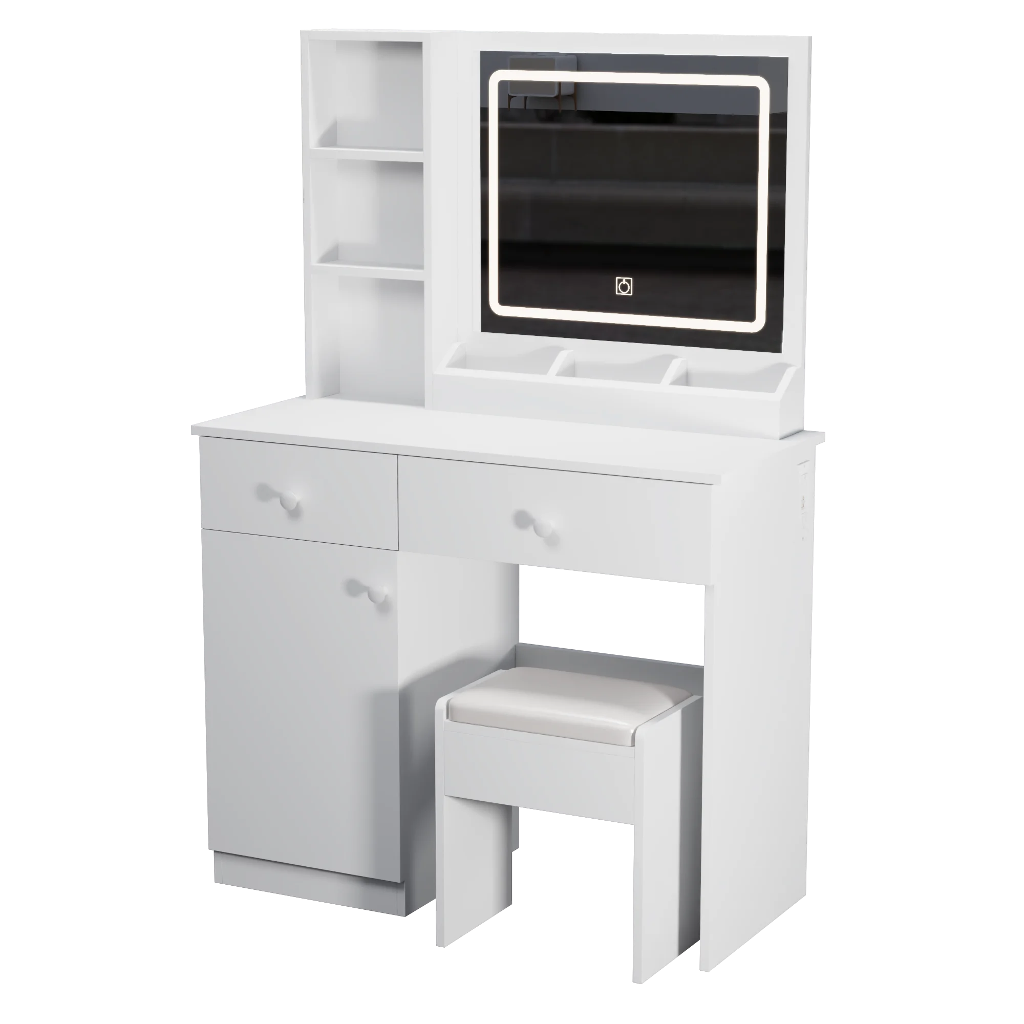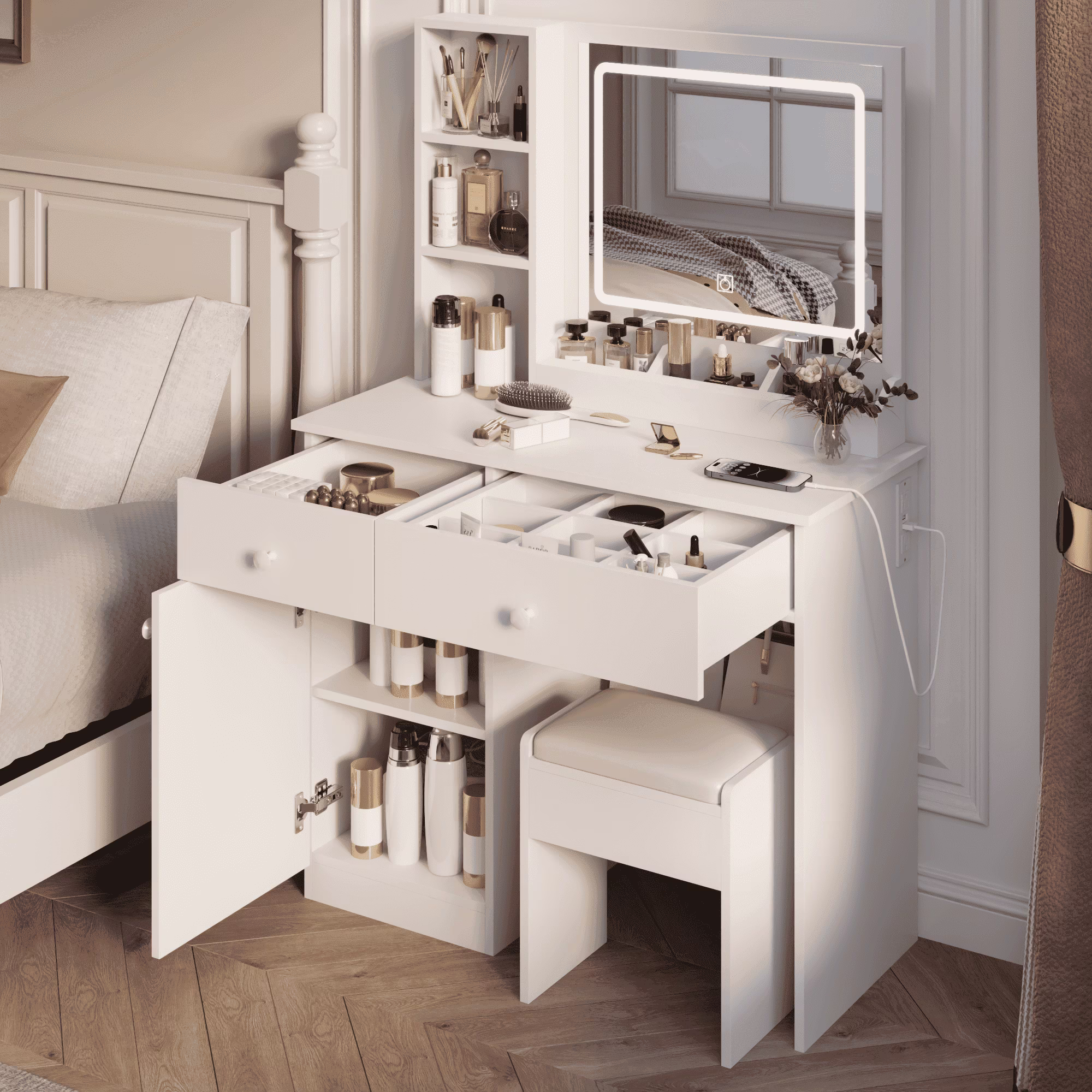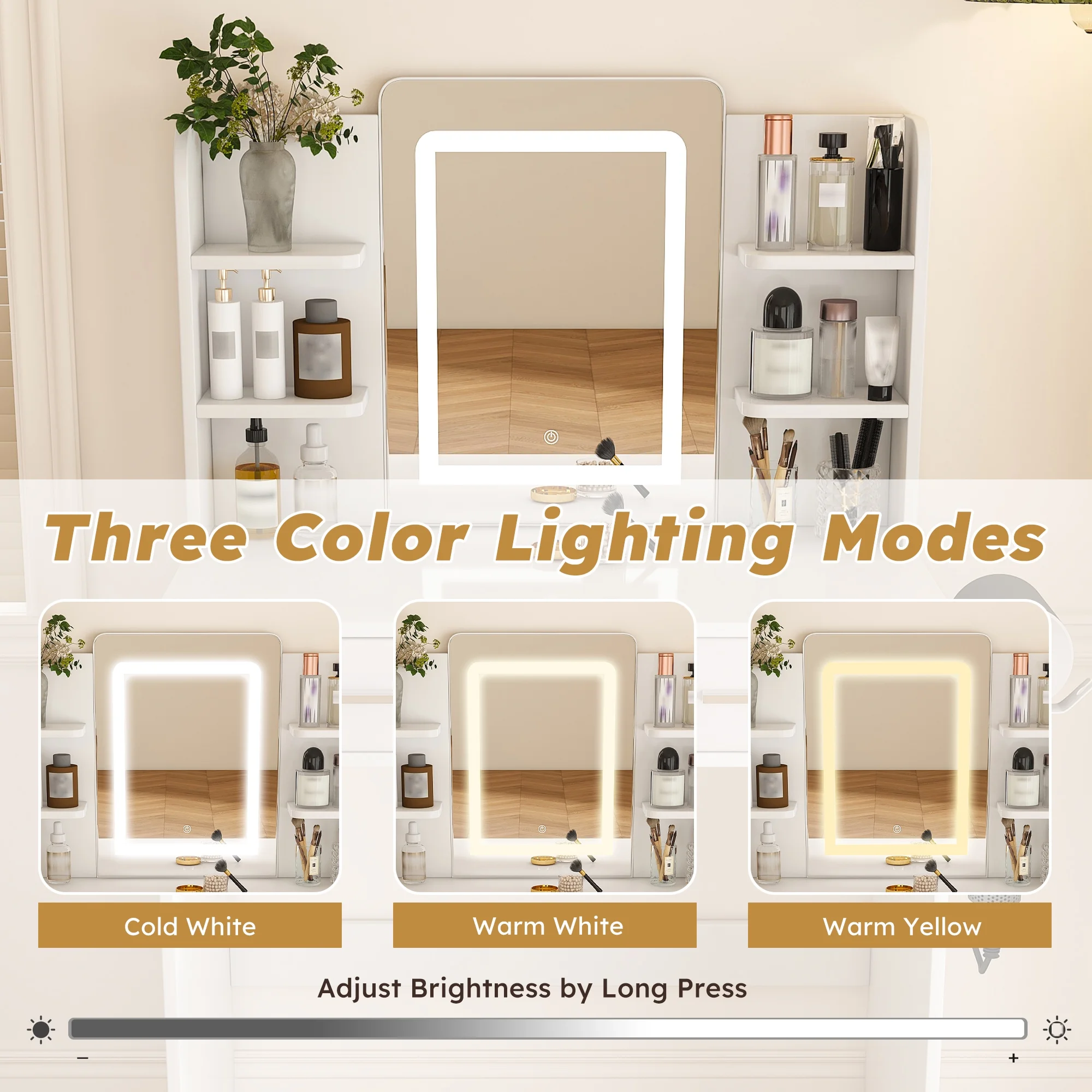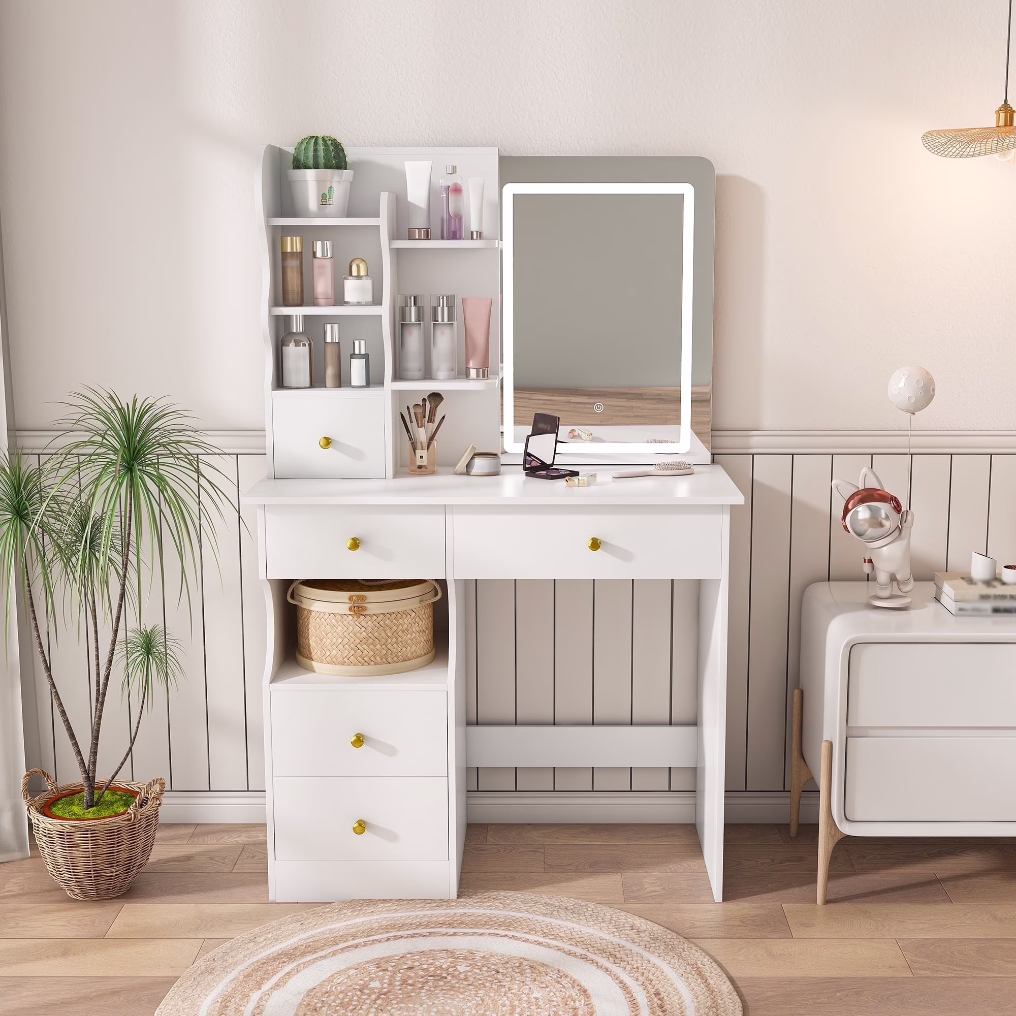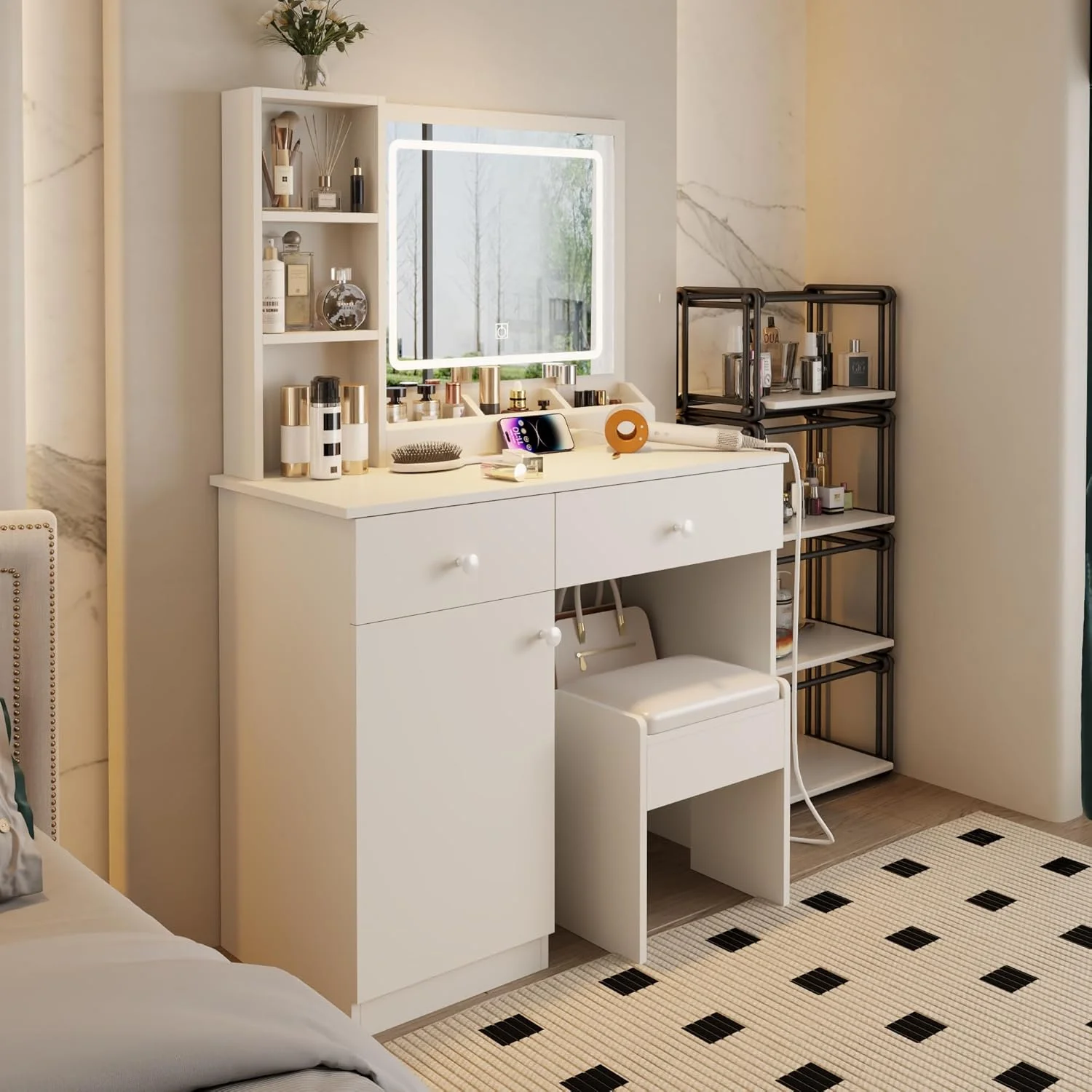 Montary Modern Mini Vanity Set w/Adjustable LED Mirror - Space-Saving Makeup Station & Hidden Storage (White)