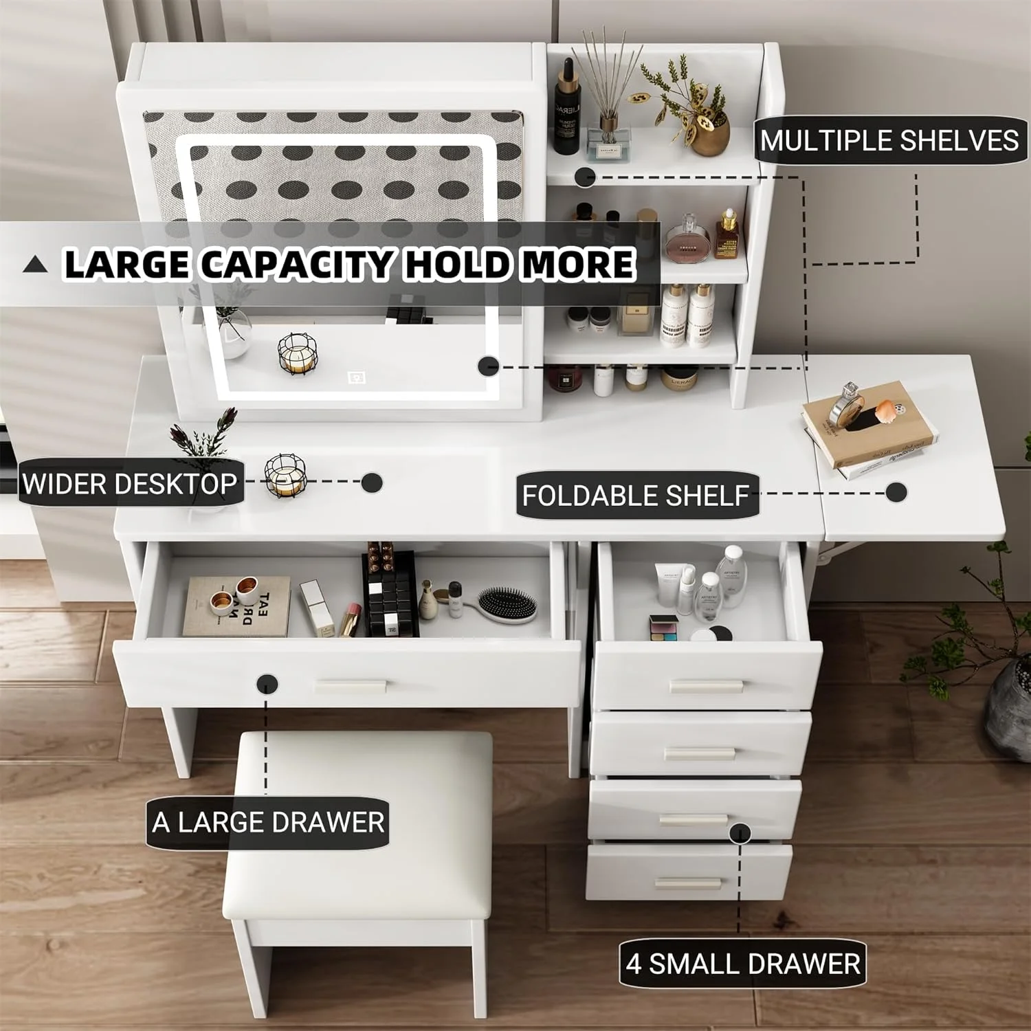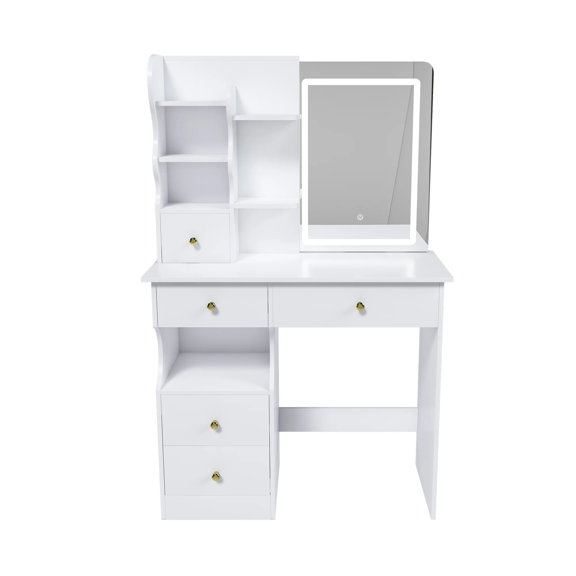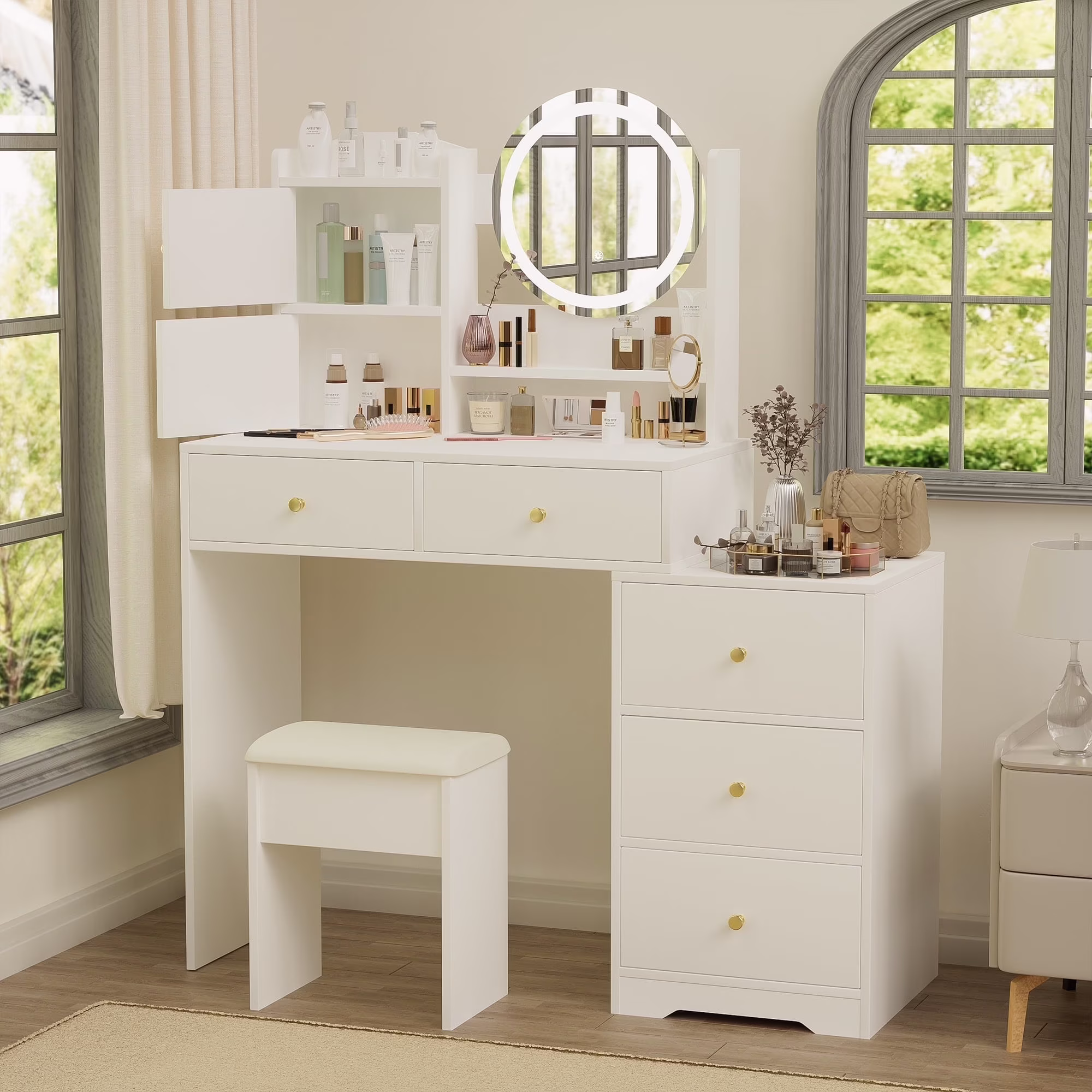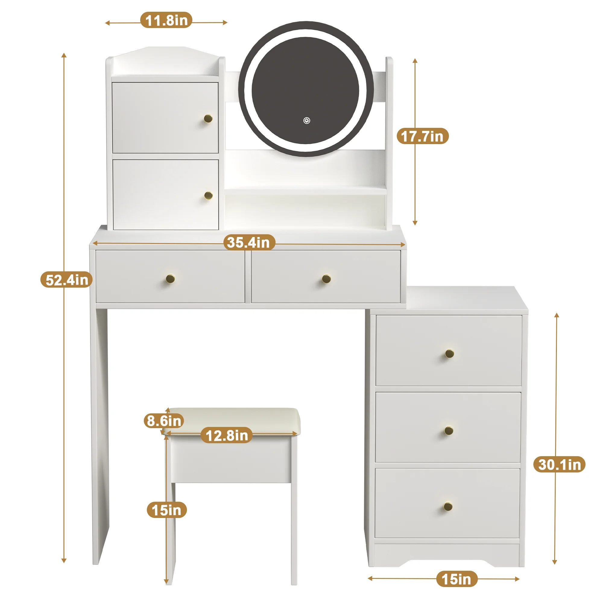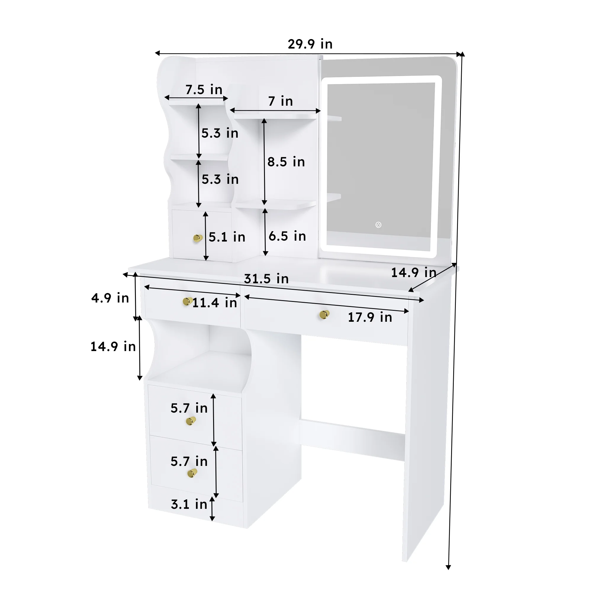 Montary Modern Mini Vanity Set w/Adjustable LED Mirror - Space-Saving Makeup Station & Hidden Storage (White)