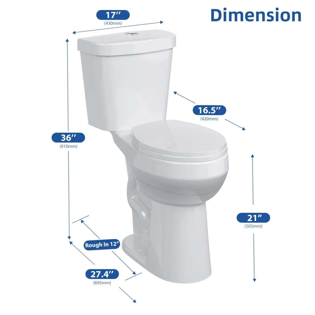 • 21" Height Toilet: ADA Compliant. The height of the 2-piece toilet from floor to seat is 21 inches. It makes sitting down and standing up easier and more comfortable for those who have difficulty getting up from a low toilet, making it ideal for seniors, people with disabilities, and tall people