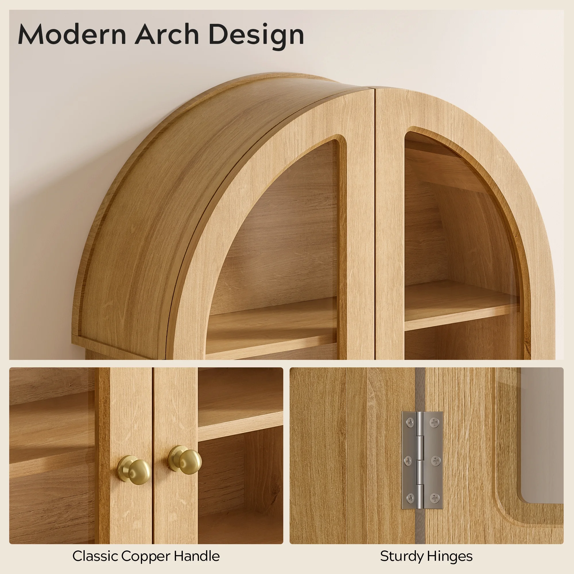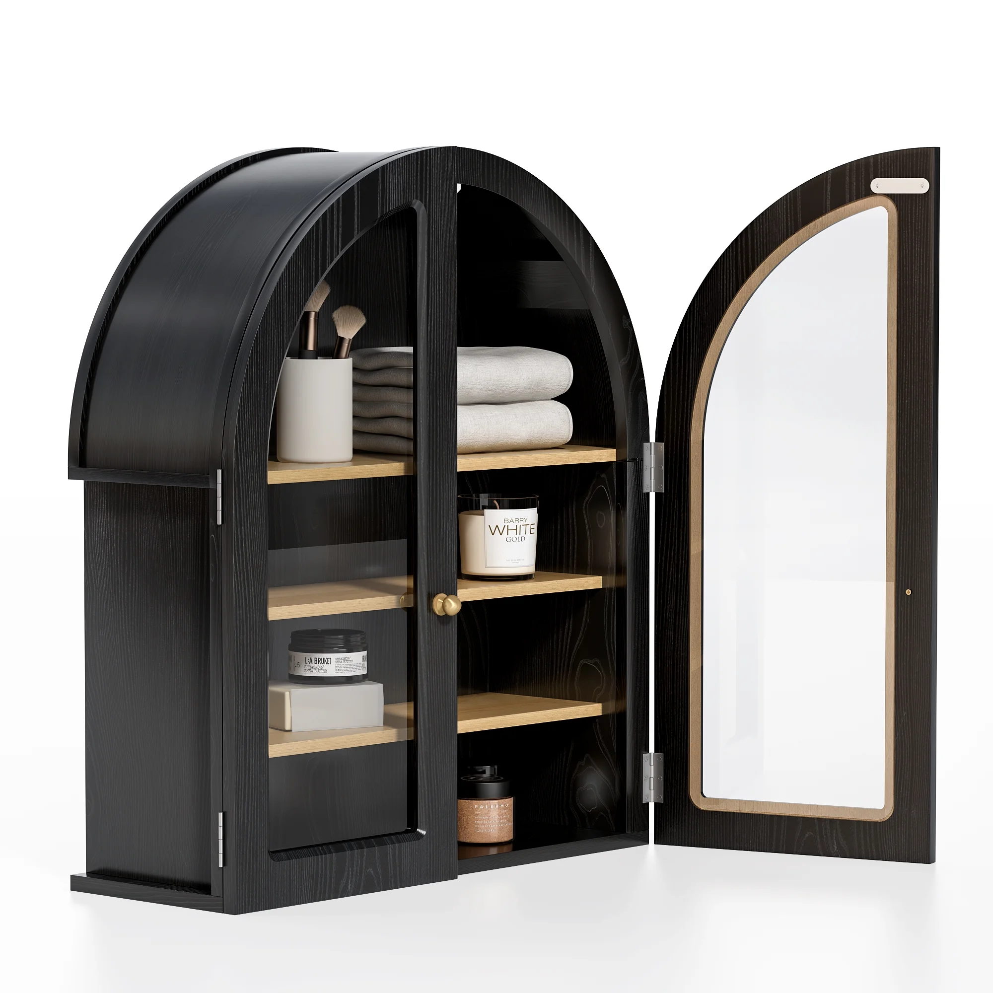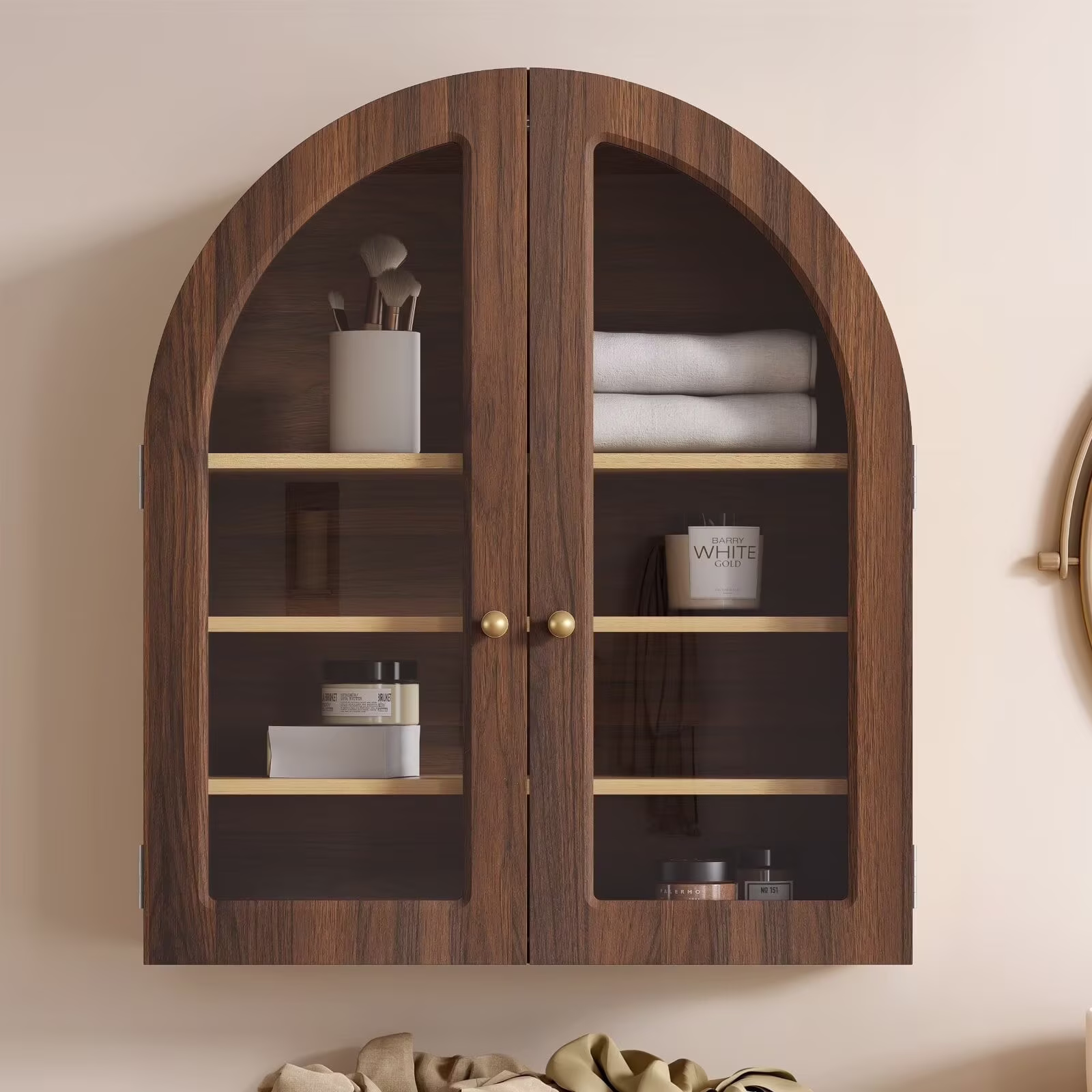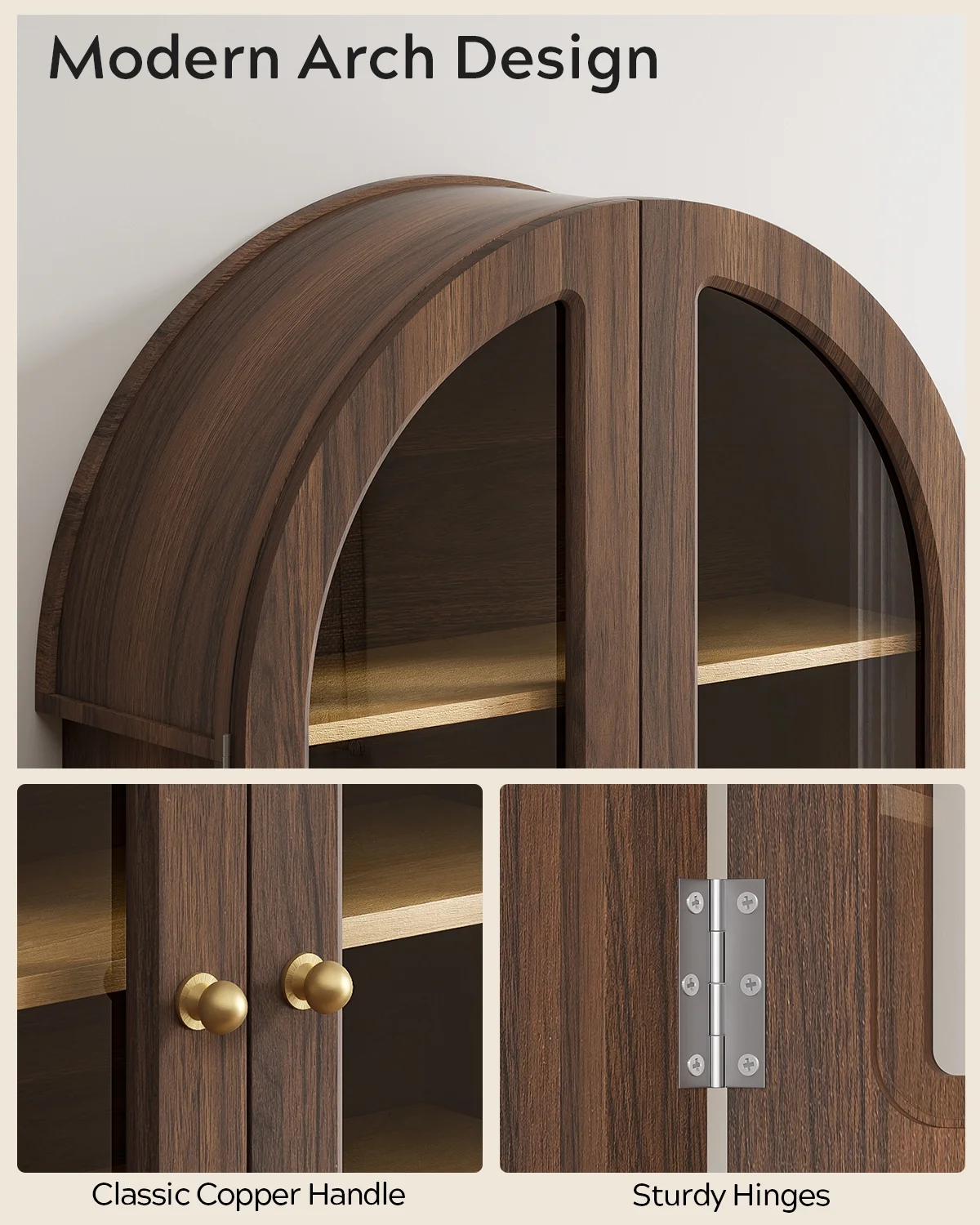 - Modern arched design with farmhouse paneling and brass accents creates a warm, contemporary aesthetic