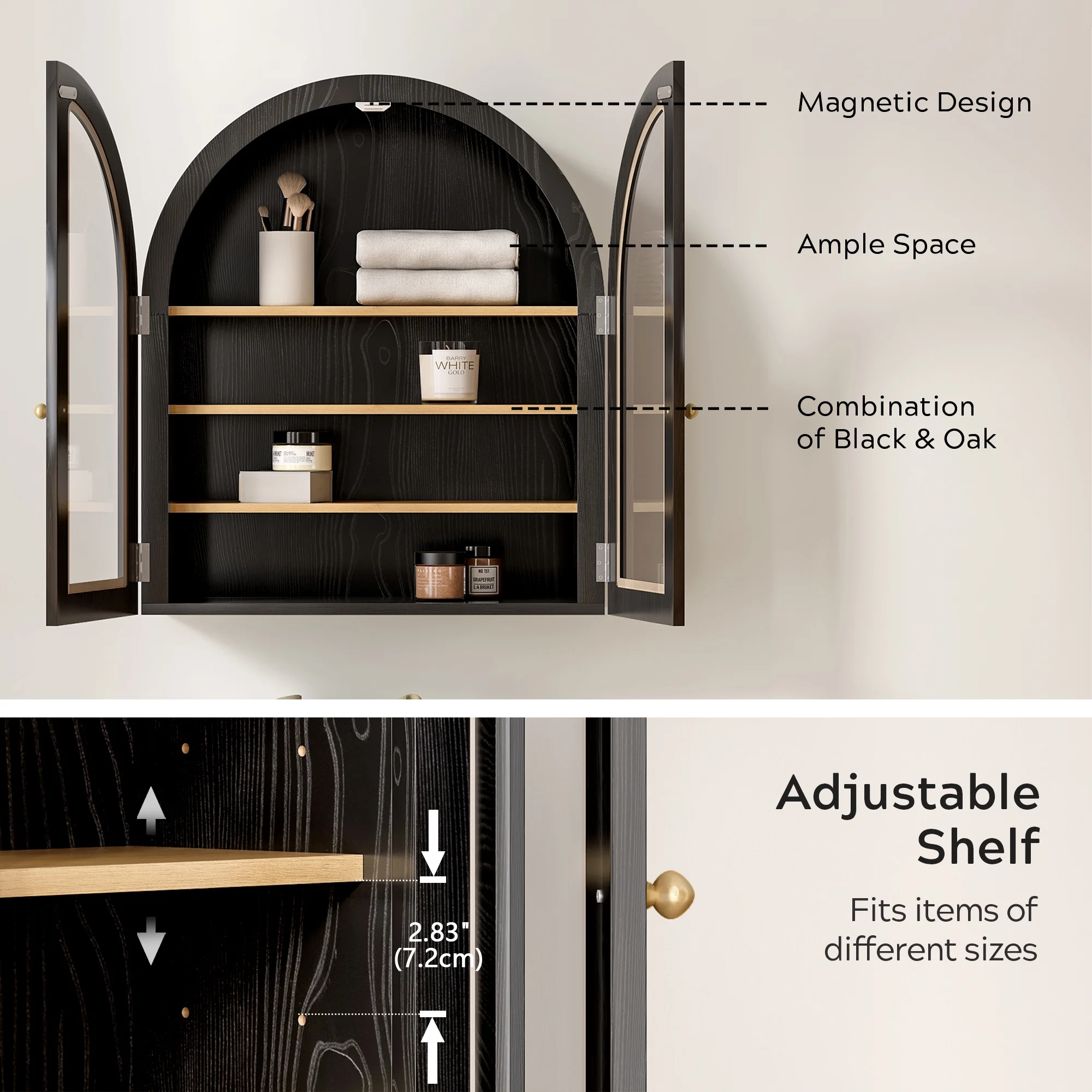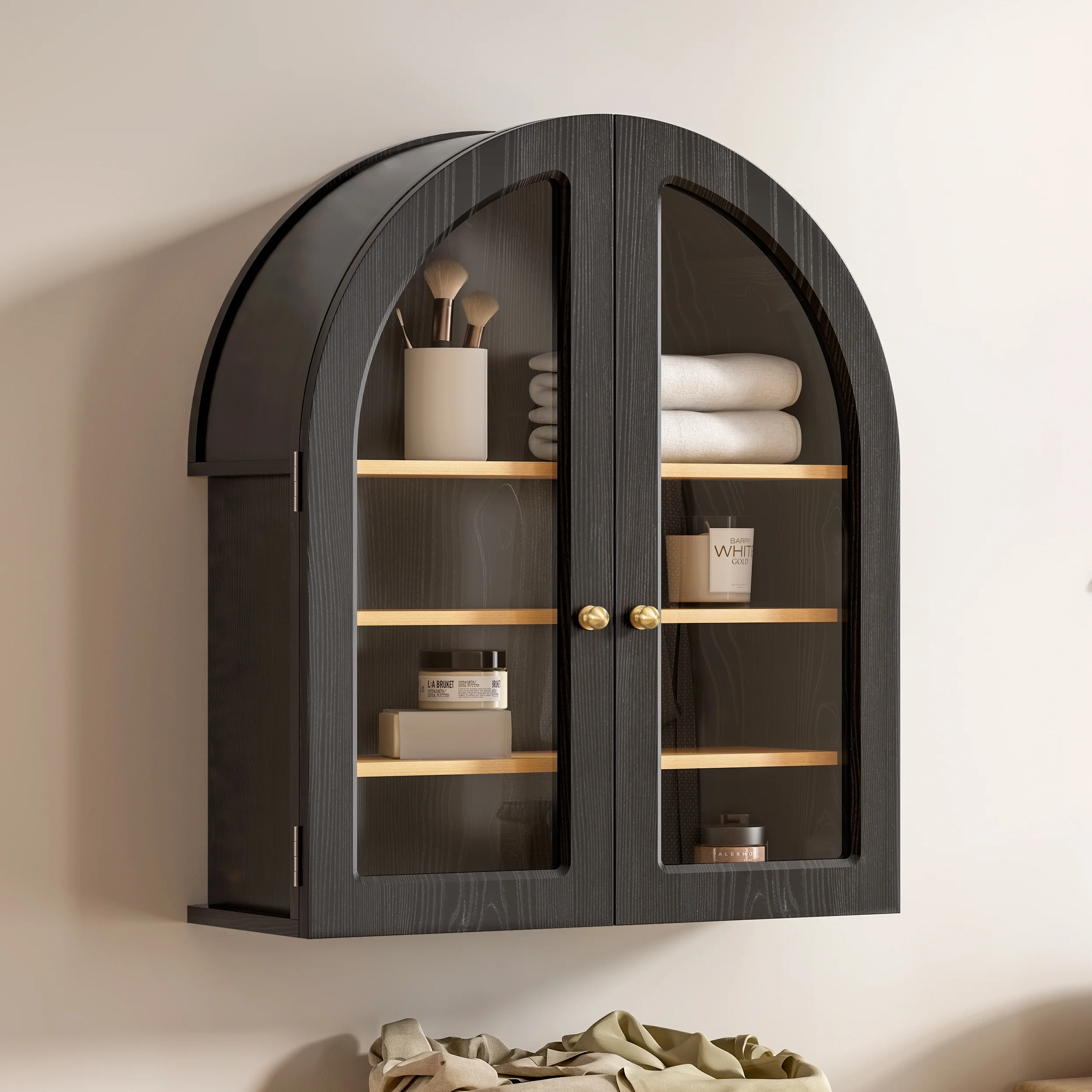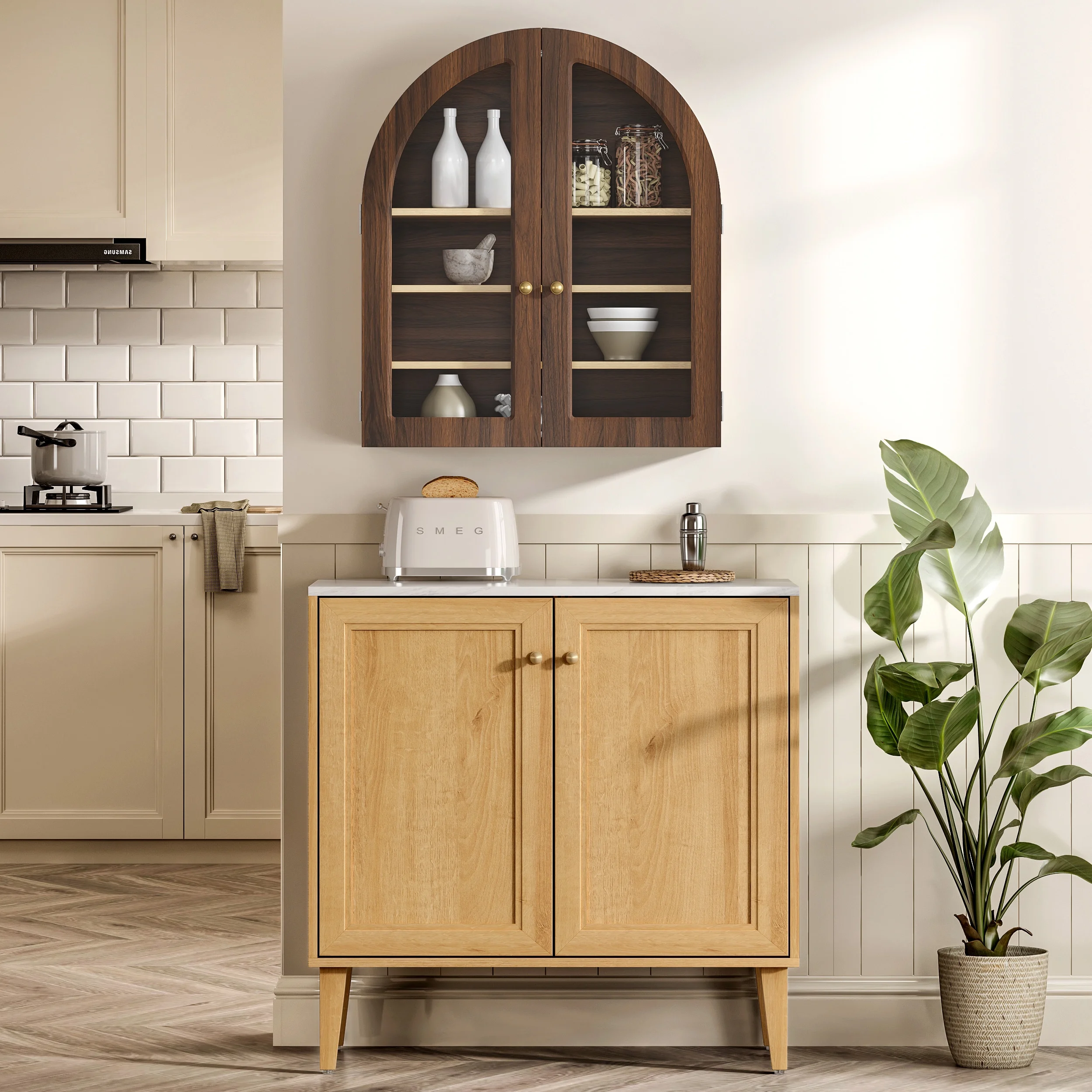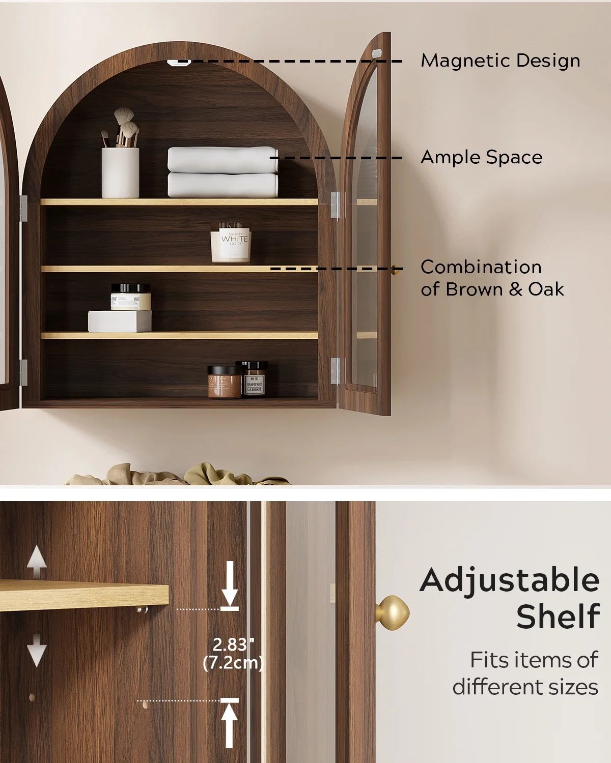 - Modern arched design with farmhouse paneling and brass accents creates a warm, contemporary aesthetic