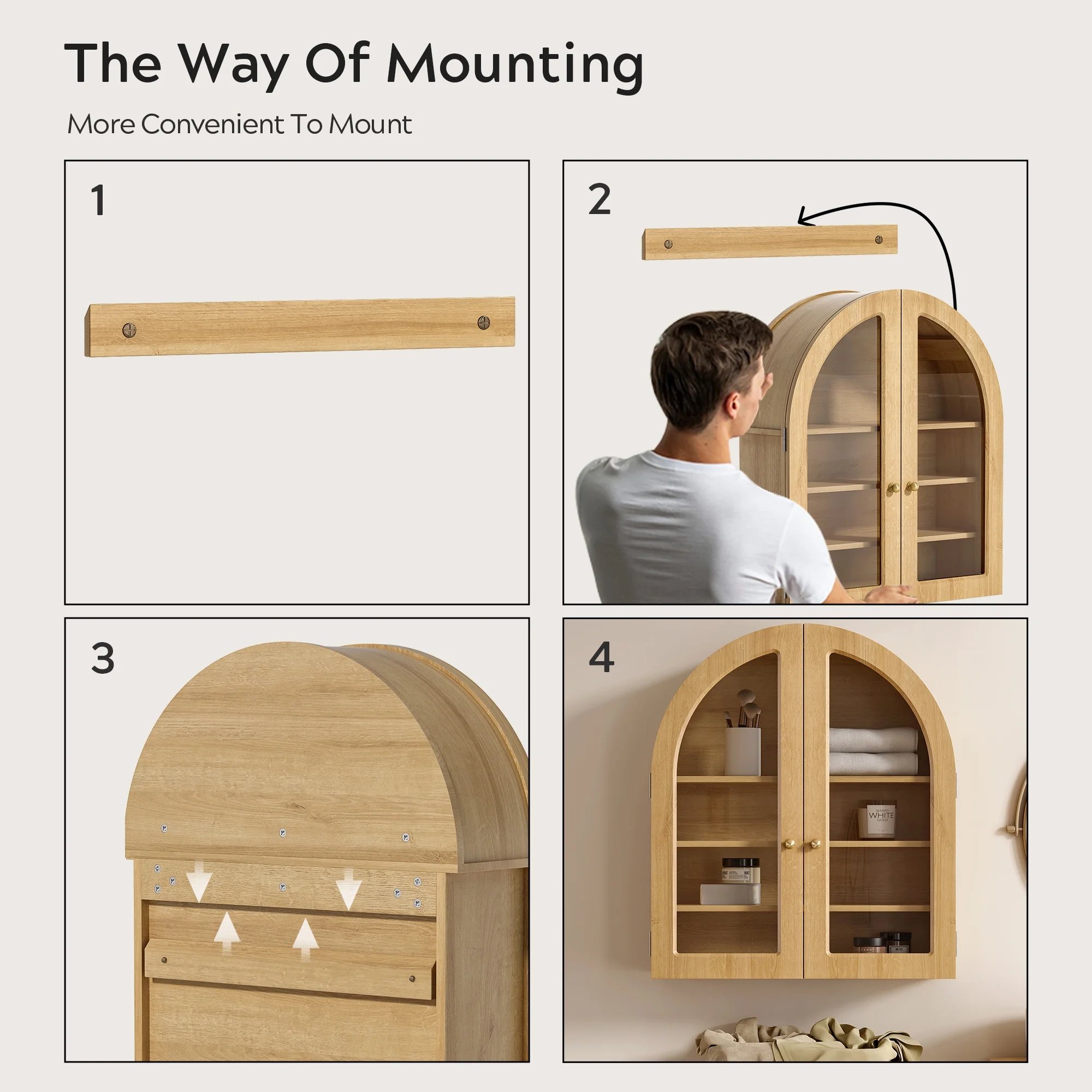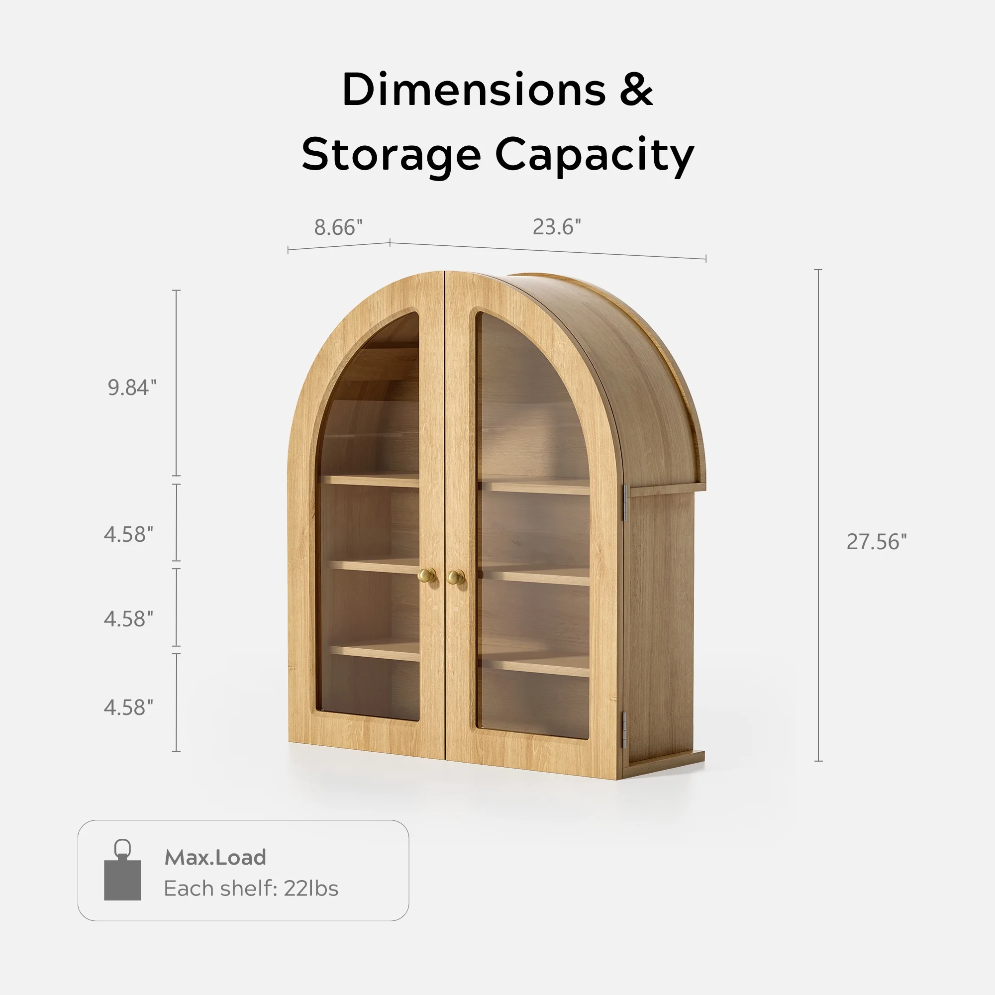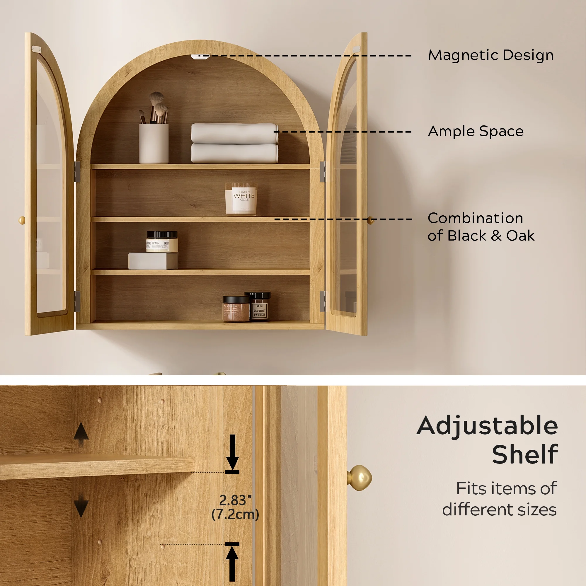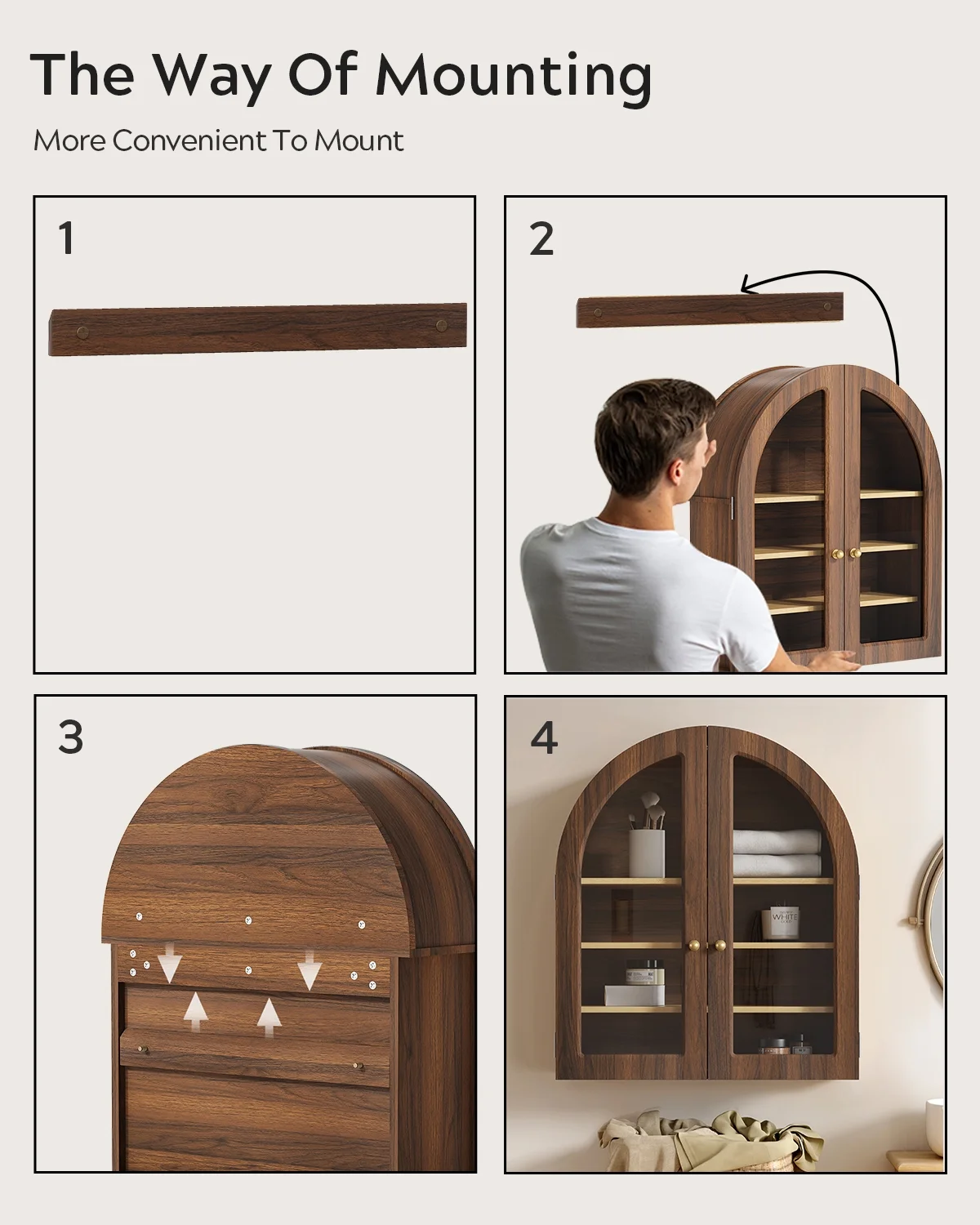 - Modern arched design with farmhouse paneling and brass accents creates a warm, contemporary aesthetic