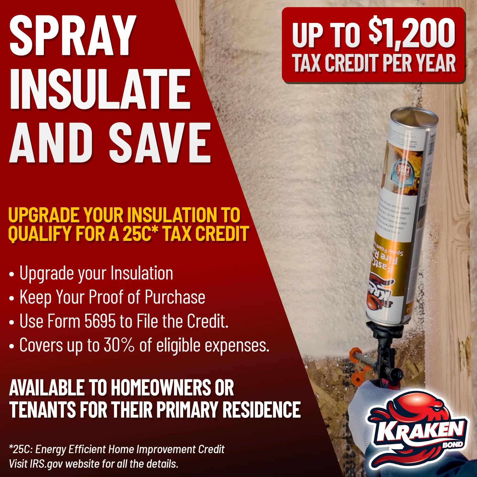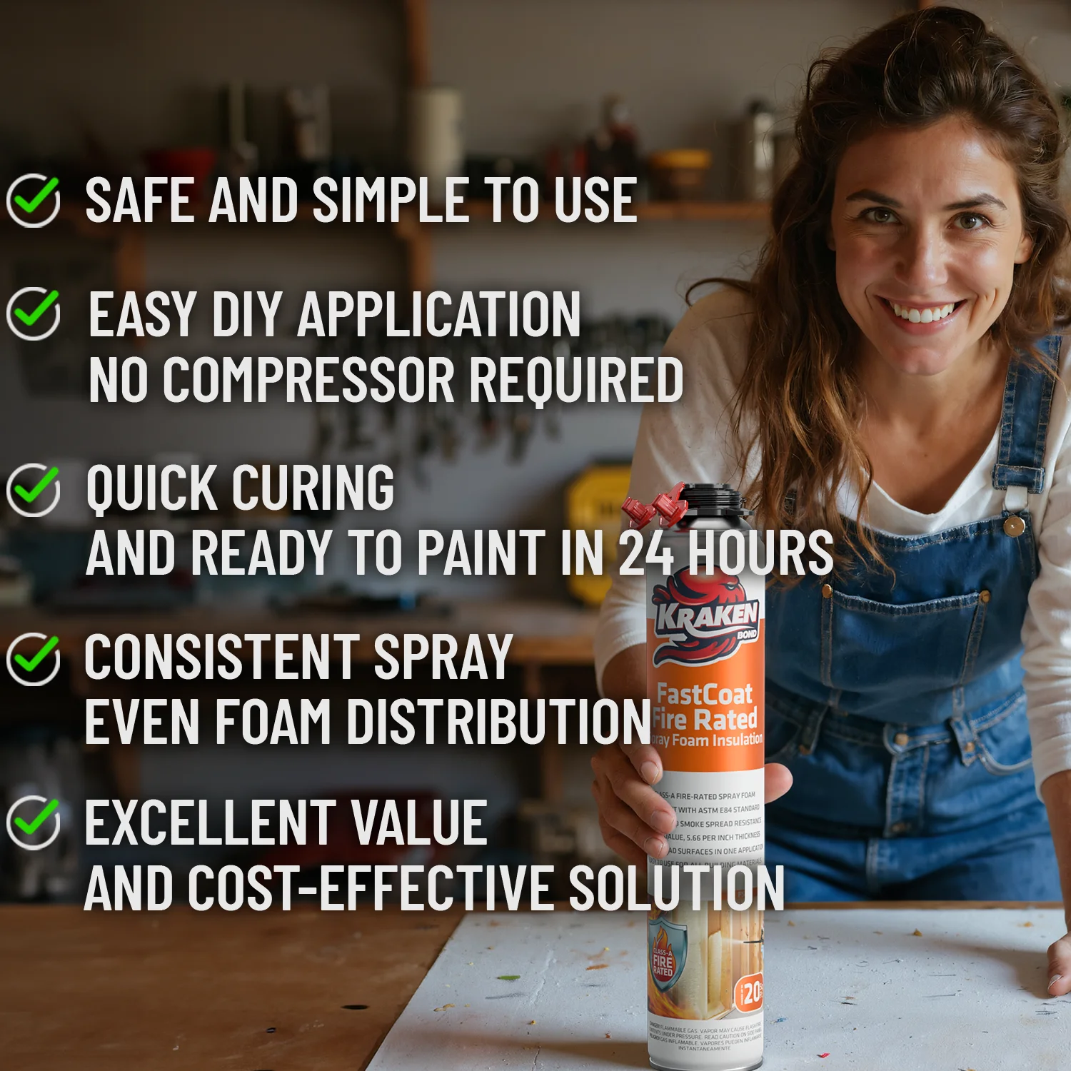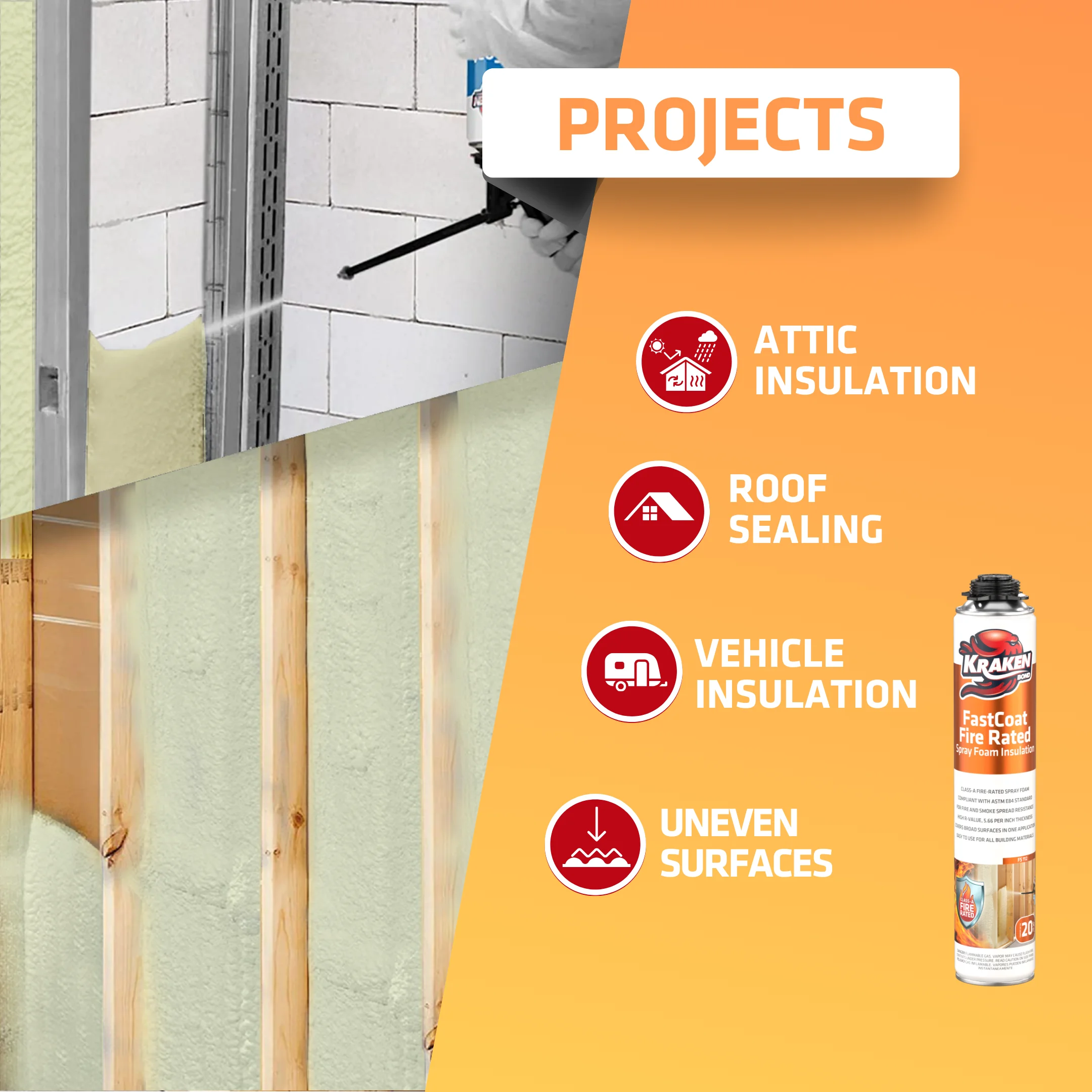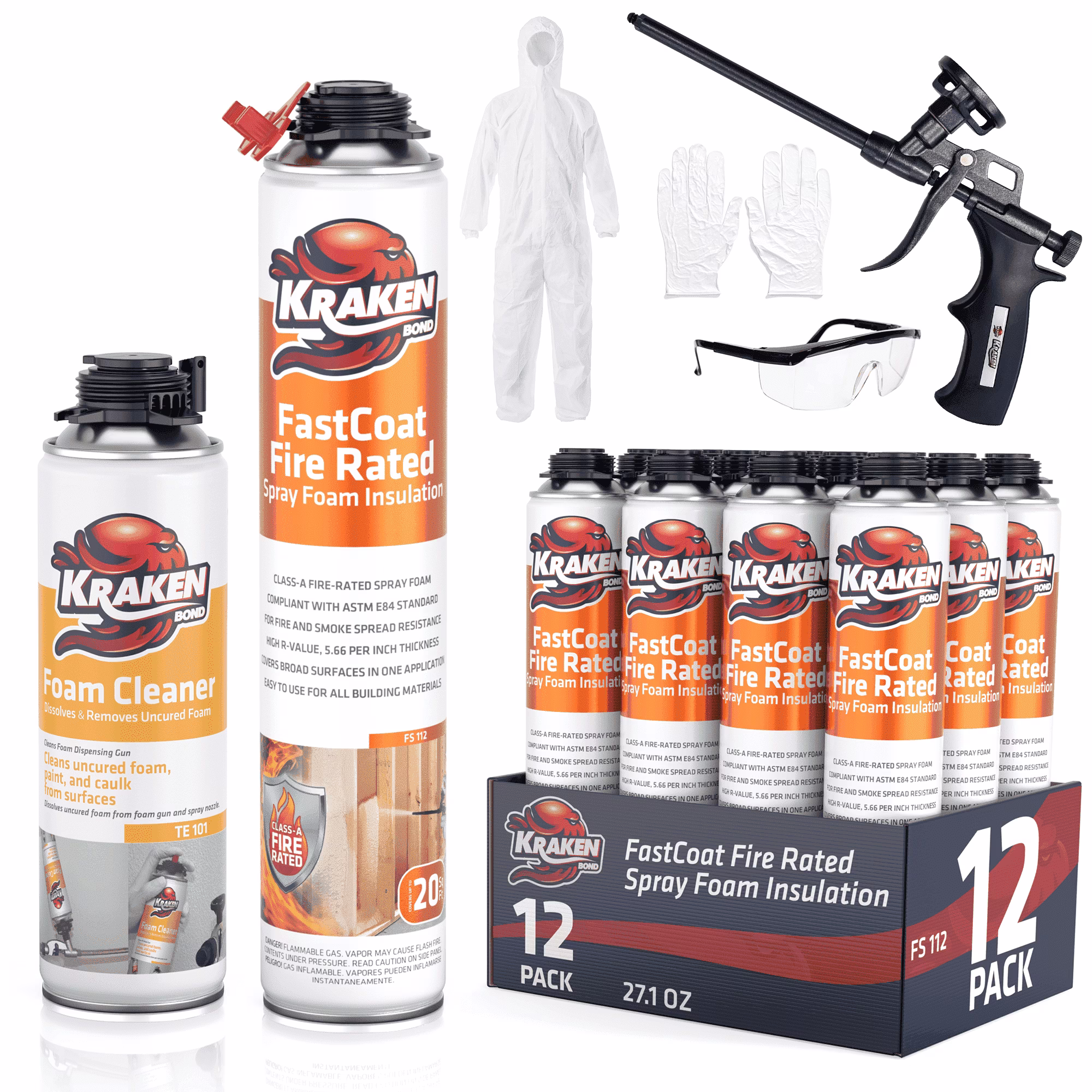 Formulated with Class A Fire Rated polyurethane and a high R-value of 5.66 per inch, Kraken Bond FastCoat provides superior thermal and acoustic insulation in attics, crawl spaces, walls, ceilings, and even RV or marine applications. Its fast-curing formula expands evenly to create a seamless, airtight barrier that resists moisture, mold, and air leakage.