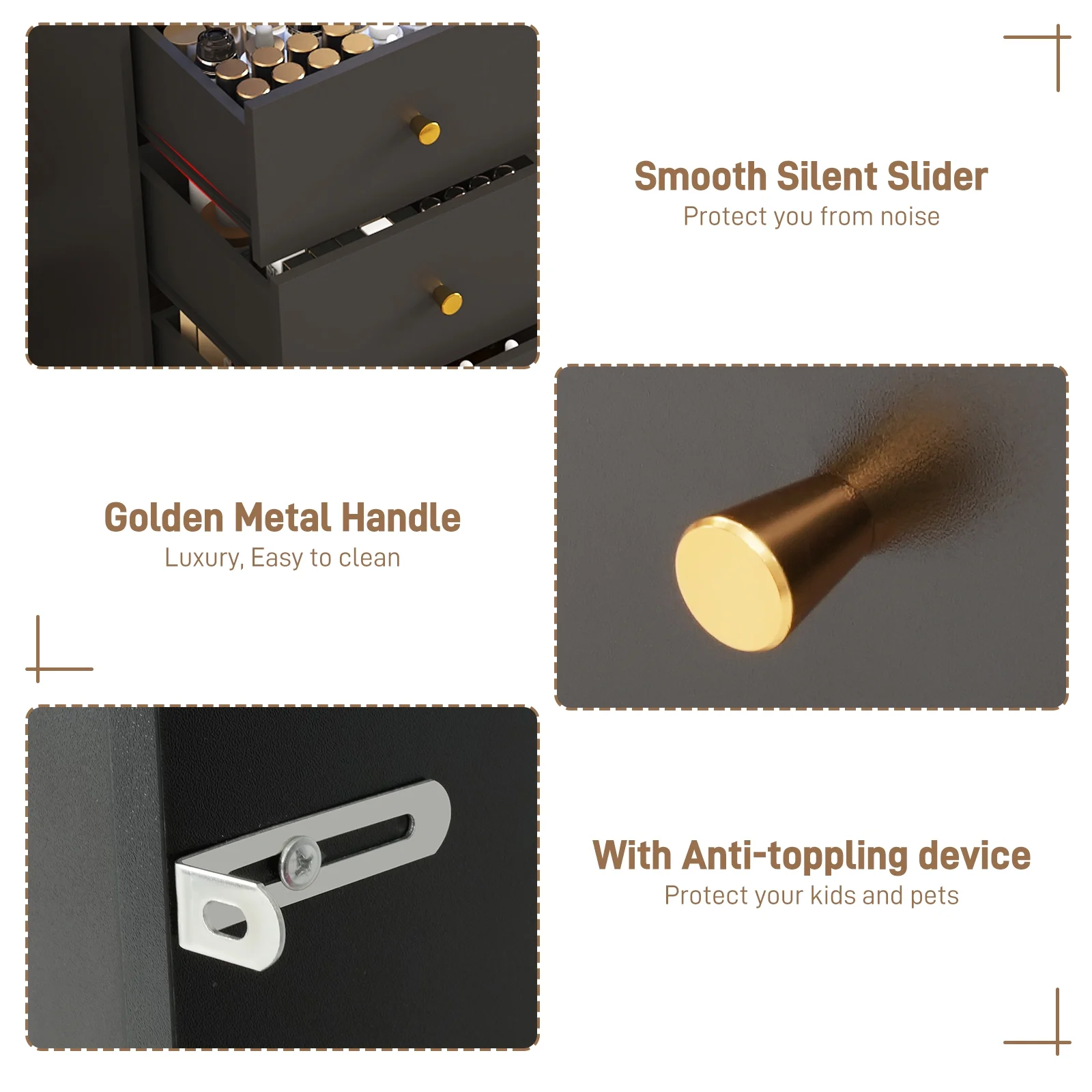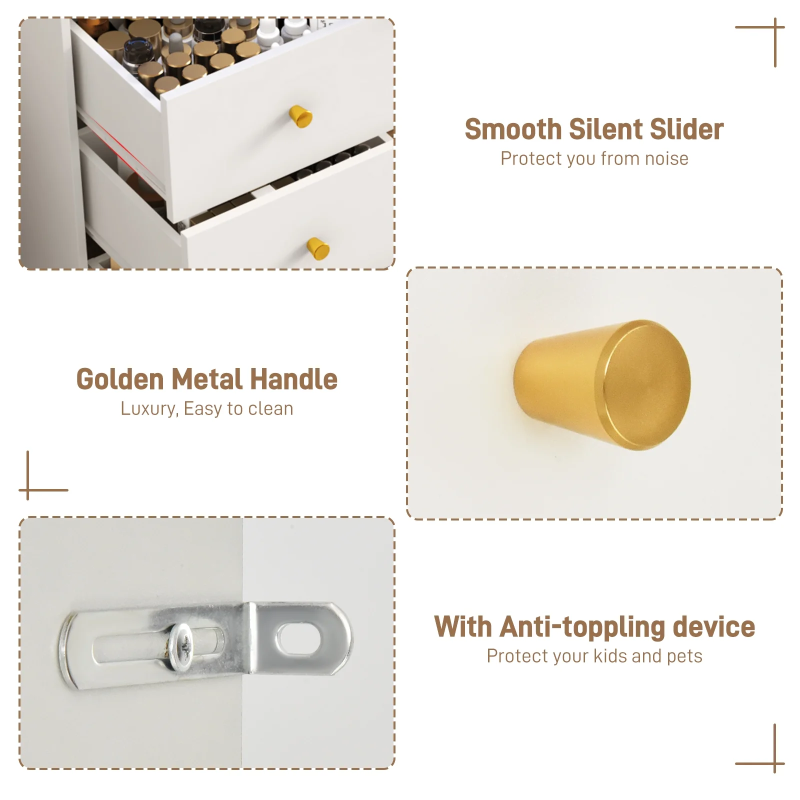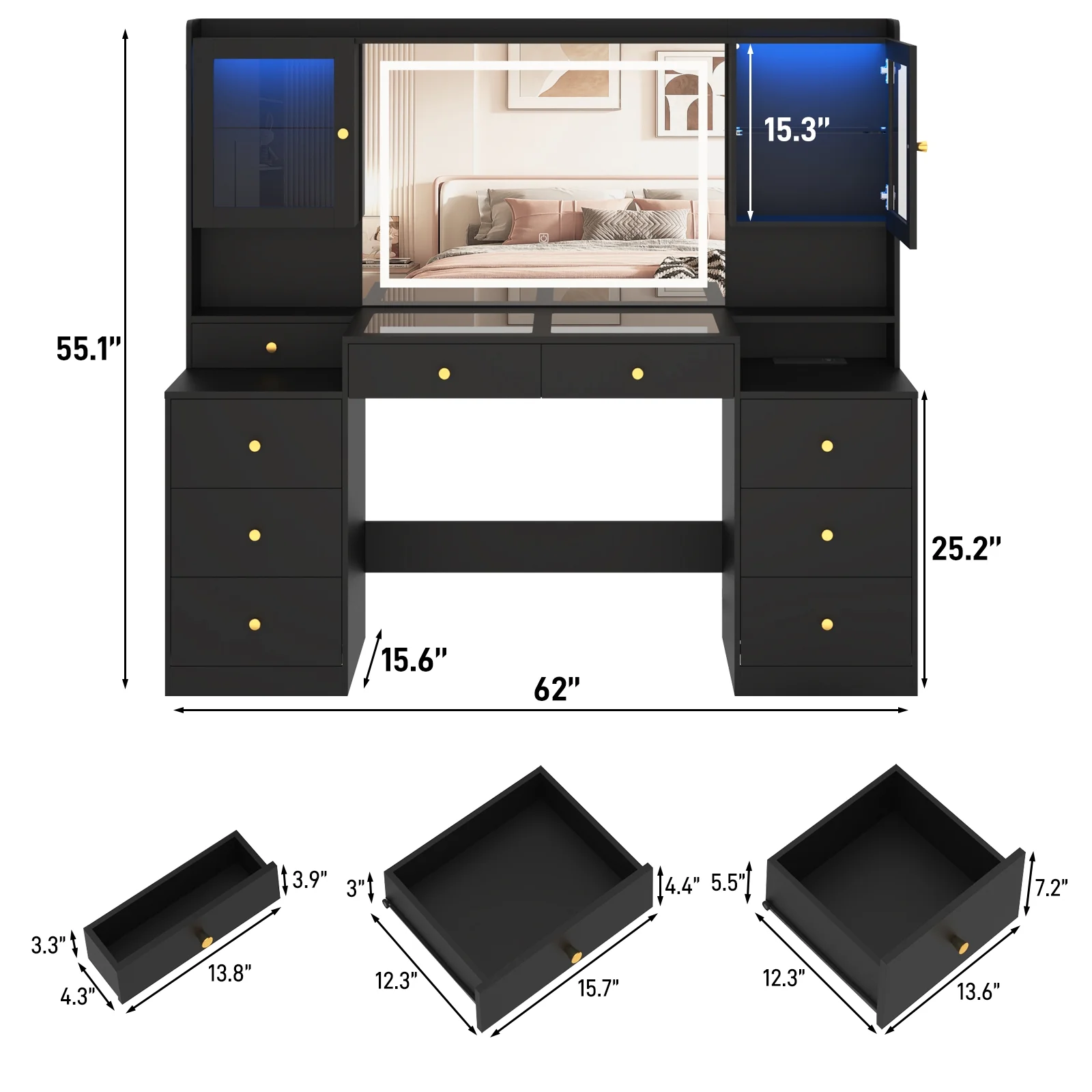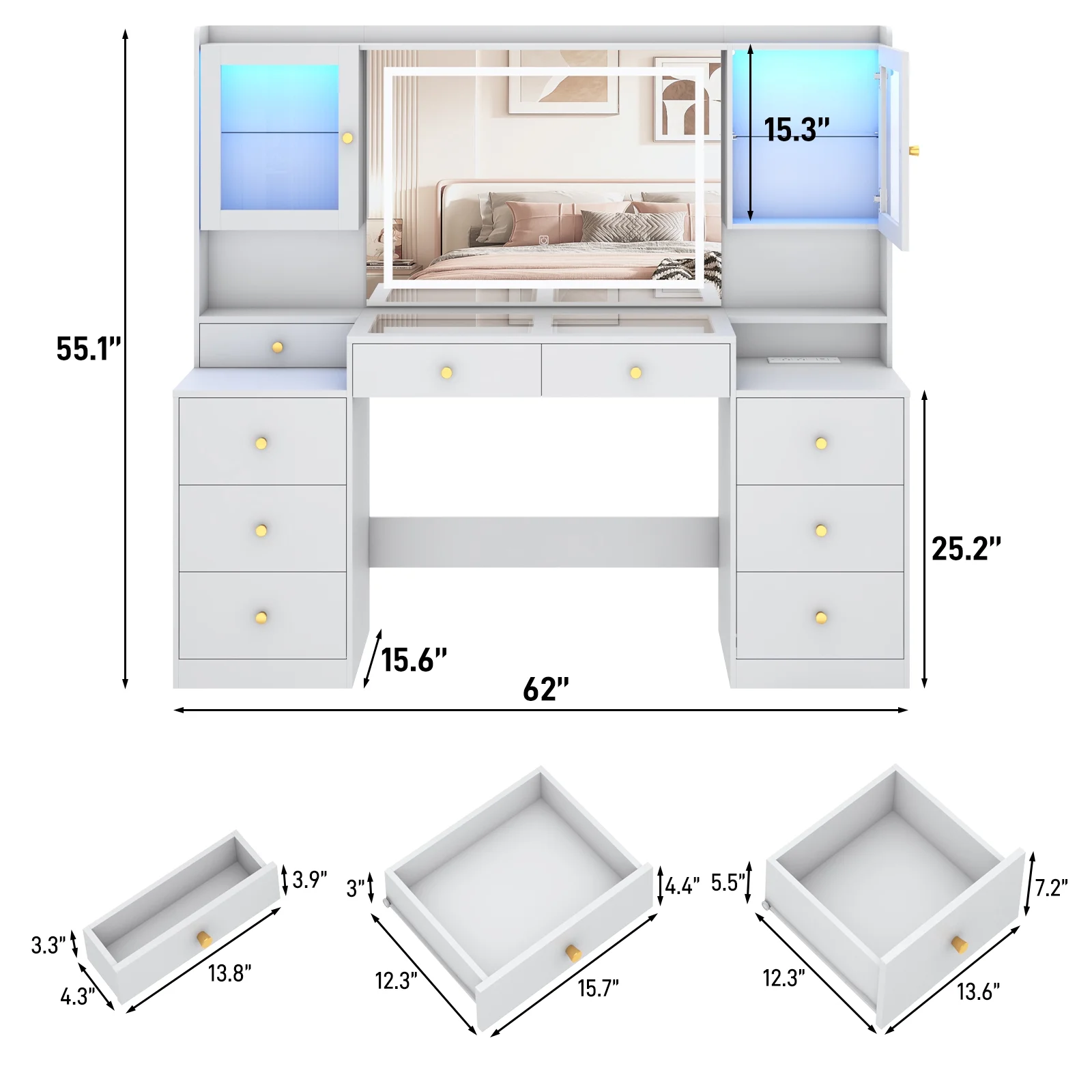 - 62'' Large Vanity with Powerful Storage Capacity --- 62 inch large table top makeup table with 9 drawers, 2 RGB cabinet and different size open shelves also includded top of it provide enough space for your favorite jewelry, hair accessories, hair care products and cosmetics, make your desktop more tidy and clean. The back of the vanity contains an anti tipping device wihch protect your kids and pets.