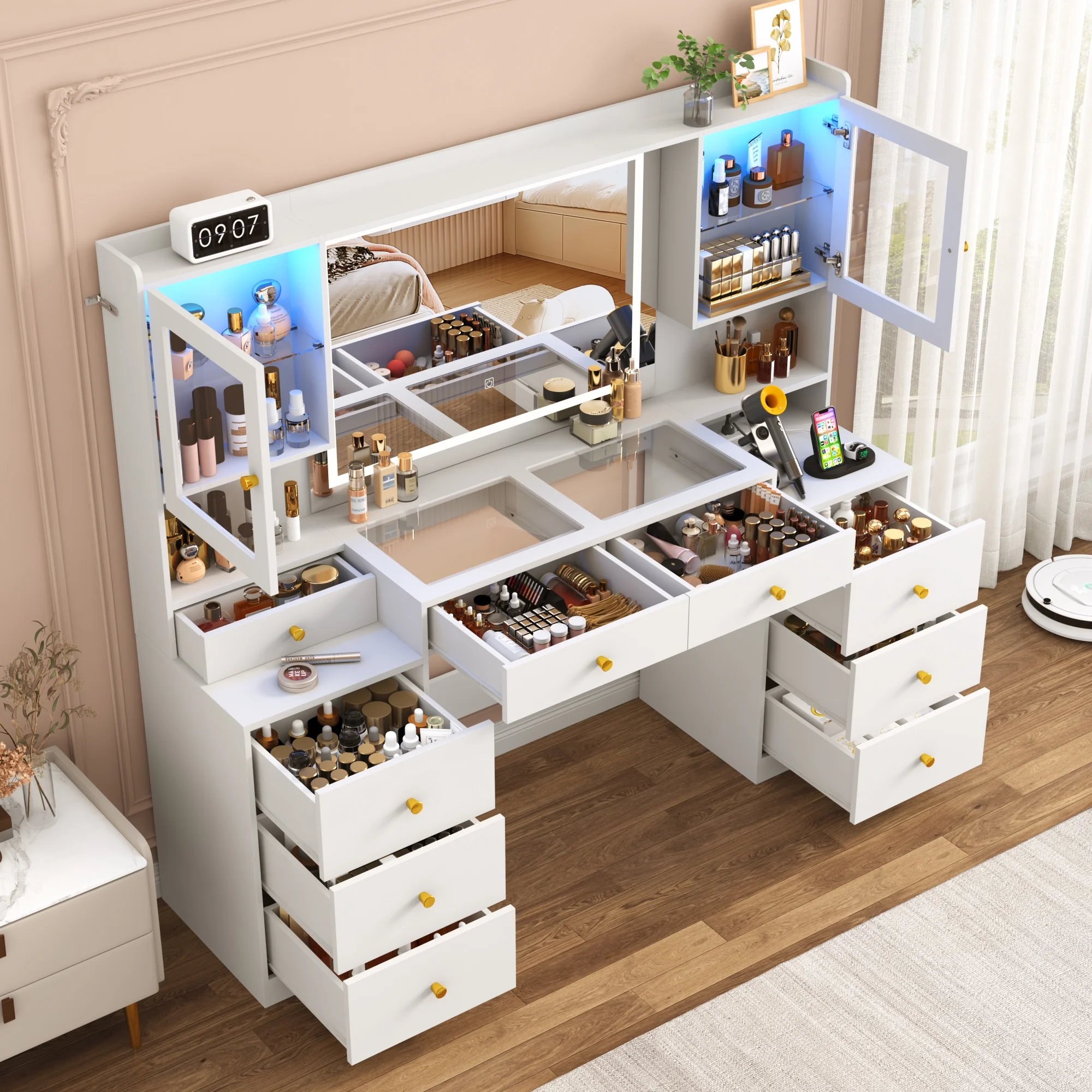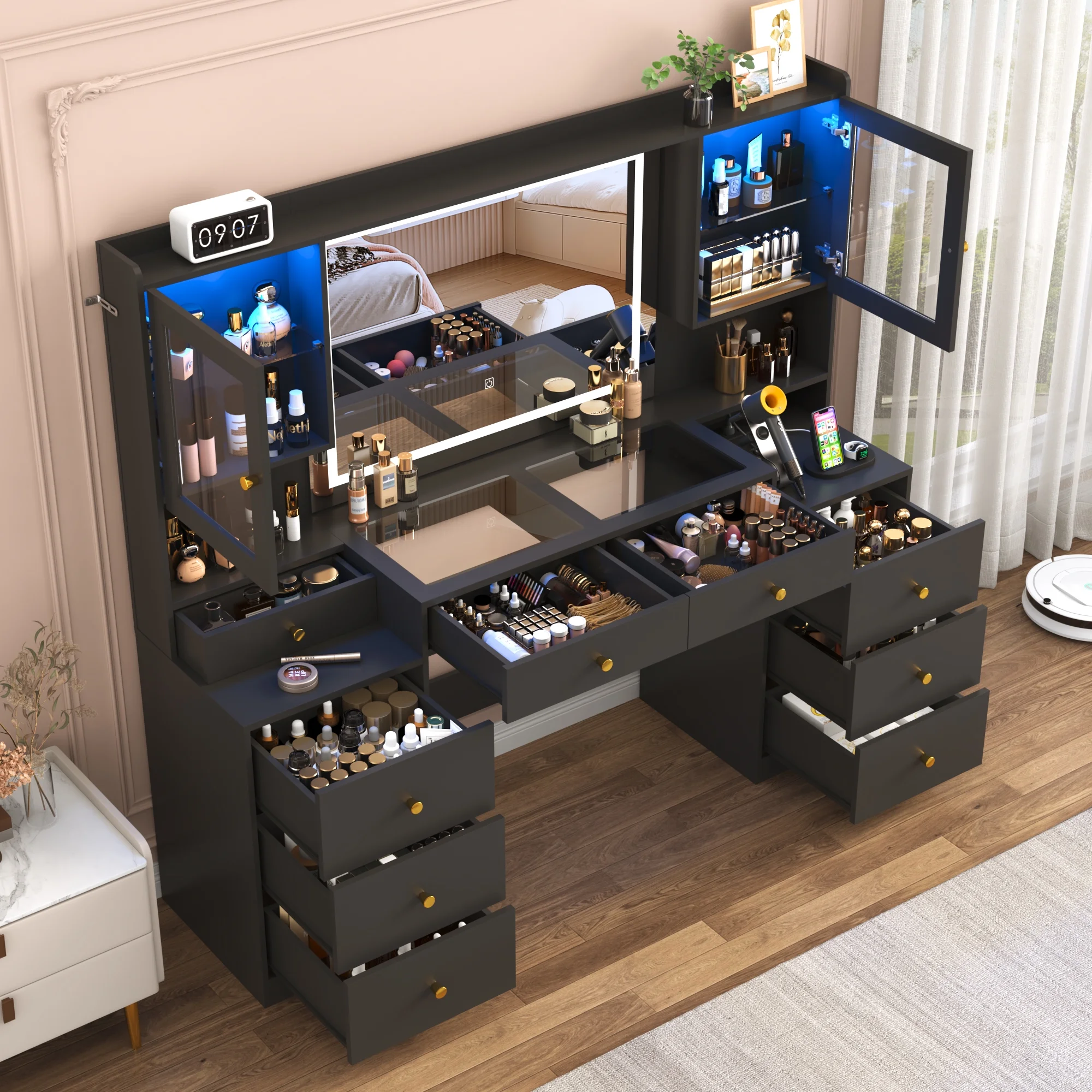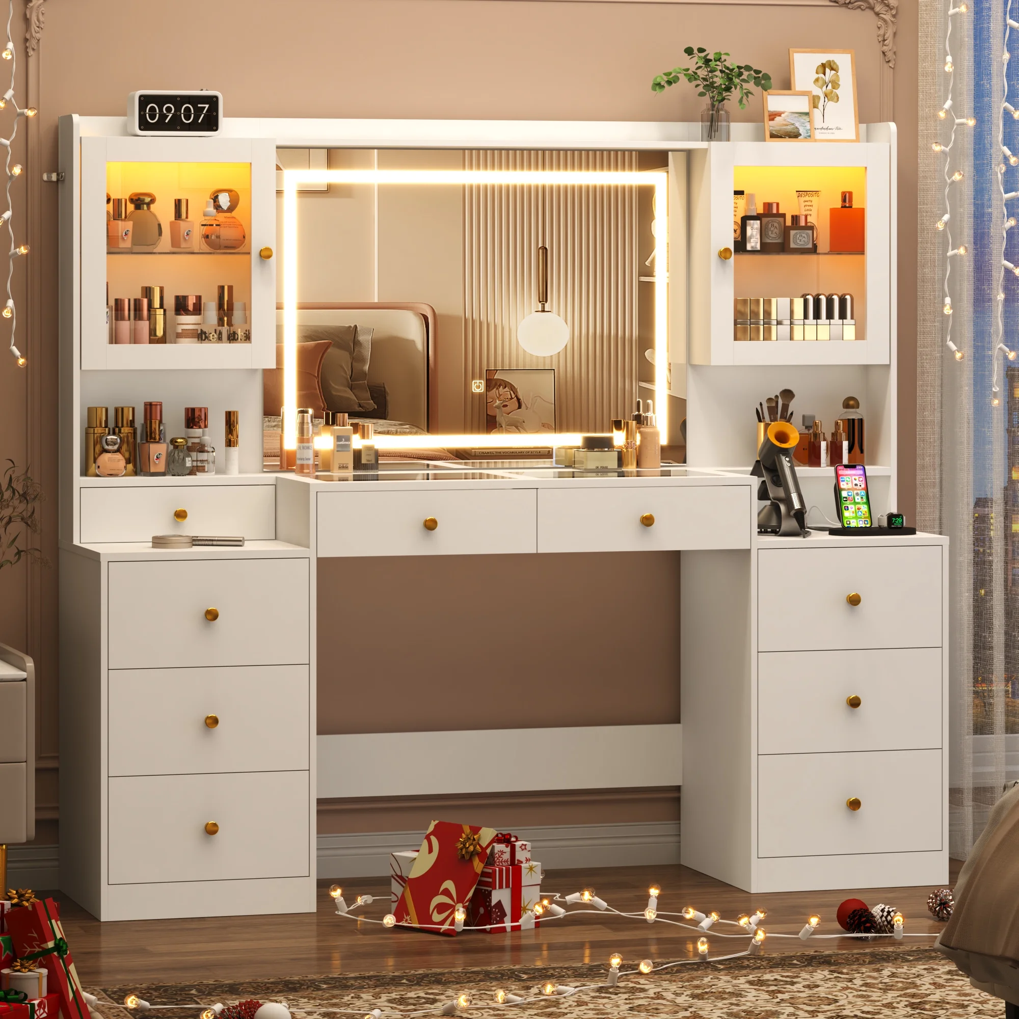 Do you want to have a luxurious vanity desk with multiple storage? This modern vanity is equipped with 9 drawers and 2 RGB storage cabinets, can provide ample storage space for your mass cosmetics, skin care products, perfumes and jewelry, and its visible glass top can perfectly display your cosmetics. This 62inch large makeup table also featured with LED touch light, so that you can see your full appearance and make up or do your hair conveniently. In addition, it also built-in a power charging station with 2 standard sockets and 2 USB ports for convenient use of beauty devices.