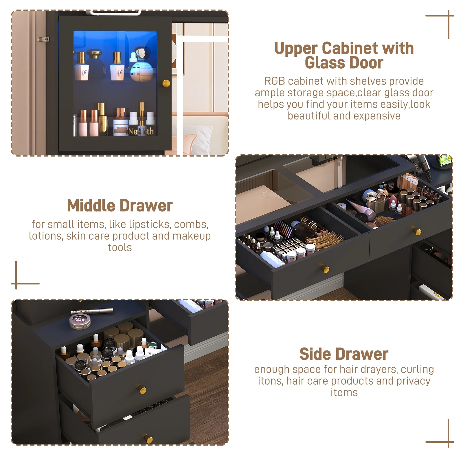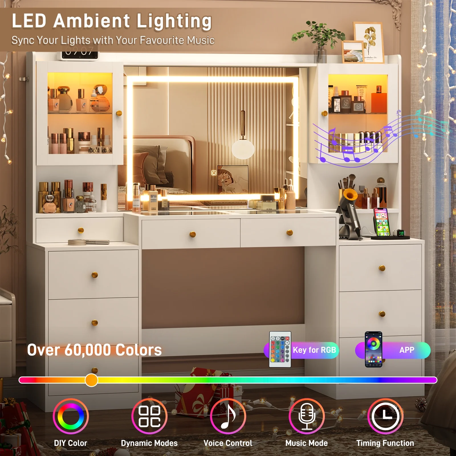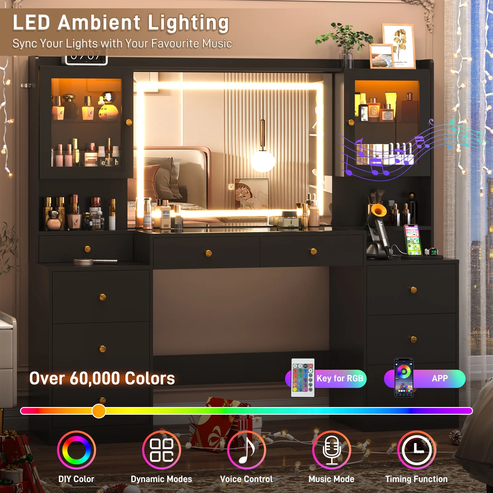 - Vanity Desk with 60,000-color LED RGB Cabinets --- Our led vanity come with 2 RGB clear tempered glass cabinets which has 60,000 color led lights and multiple lighting modes, like timing function, music sync, mic sync, etc. for choose, you can control it via APP or RF switch. Provide you a stunning visual and immersive experience while you relax or entertain.