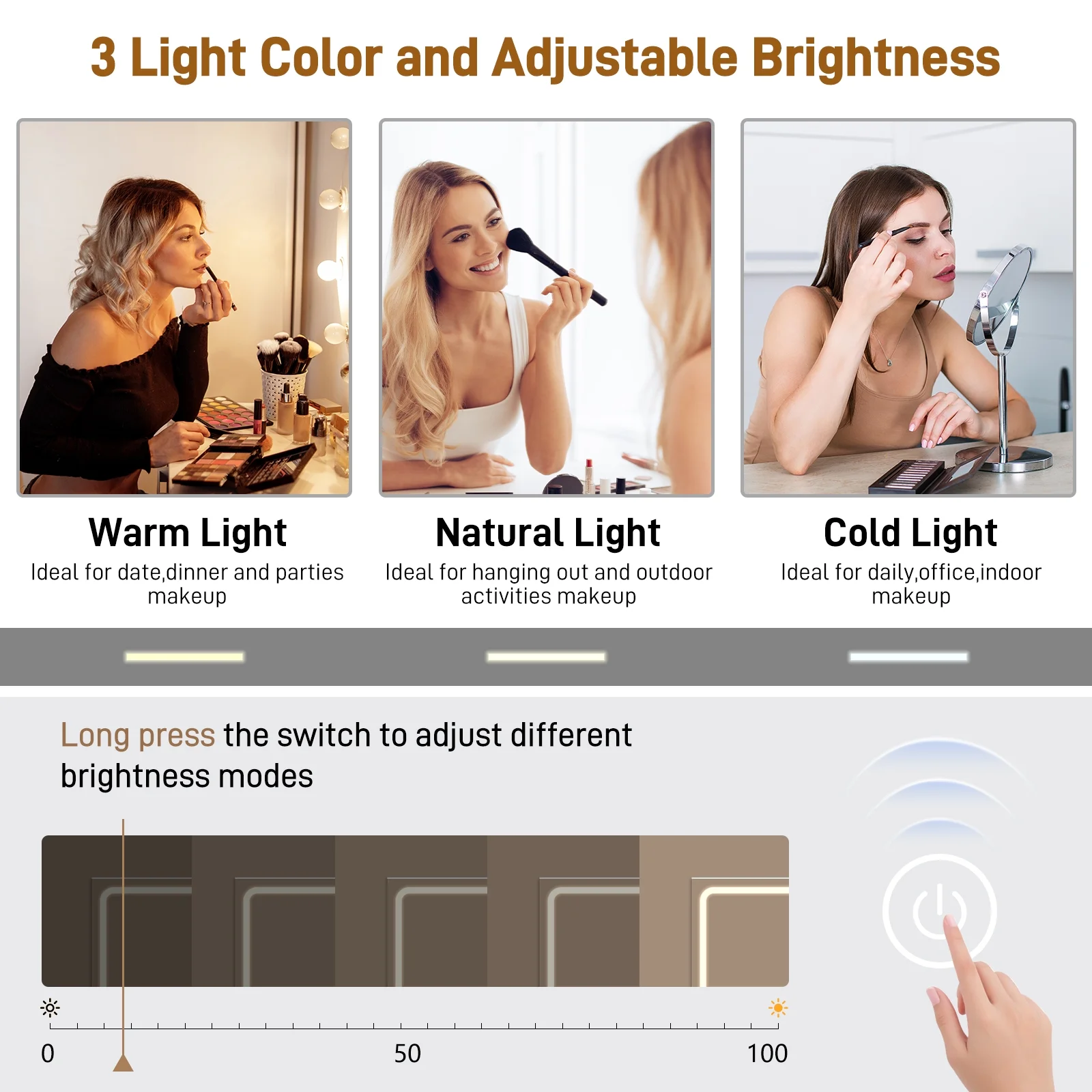 Light Modes: 3 color modes (warm yellow, warm white, cool white)