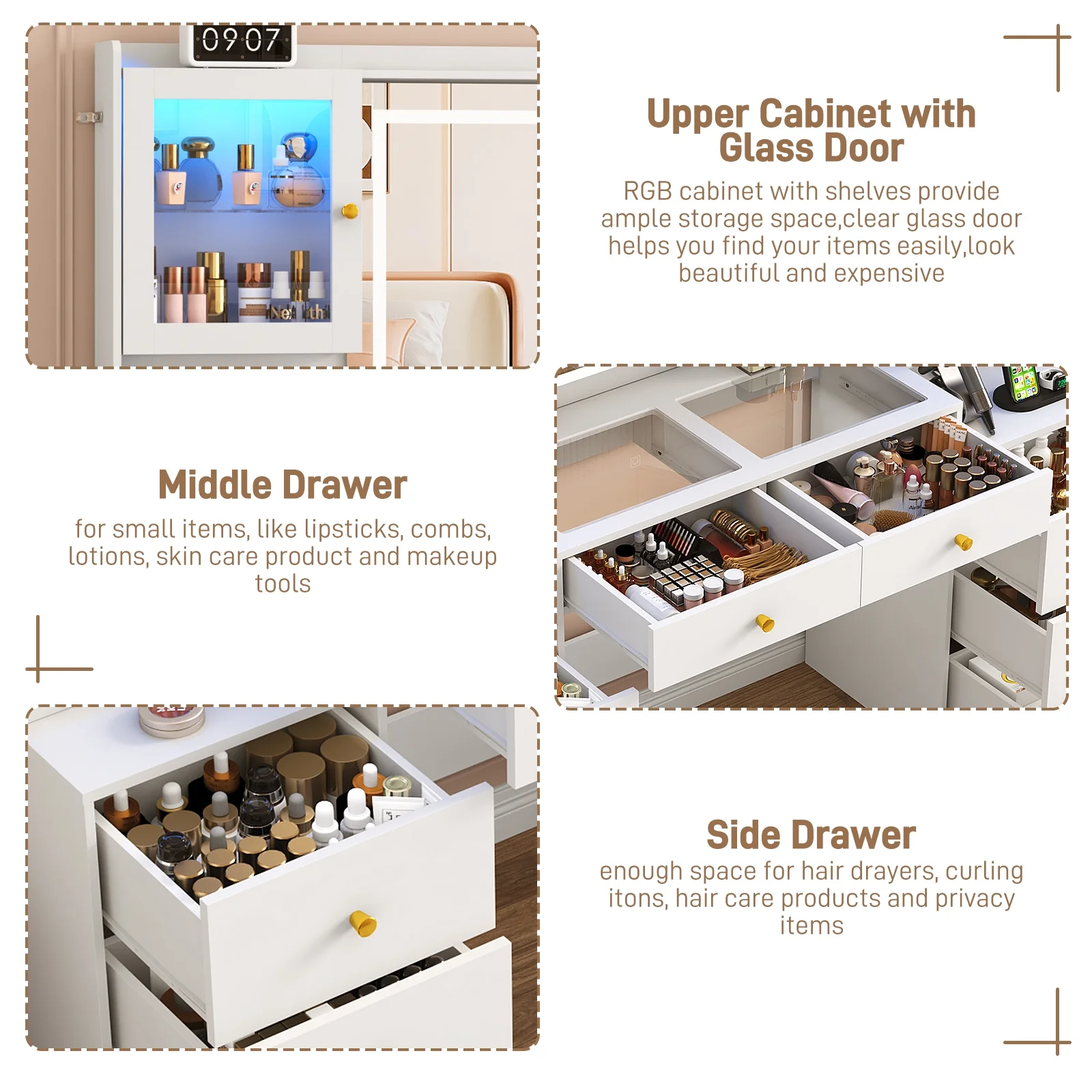 - Charming and Thoughtful Large Vanity --- This bedroom dresser with clear tempered glass top and RGB cabinet design reinvents your home with a warm charming, combines function and beauty, contributes both fashion and practicality to your bedroom or changing room, will be an ideal item for your girlfriend, wife, or daughter on special days.It serves as an ideal present for a range of occasions.