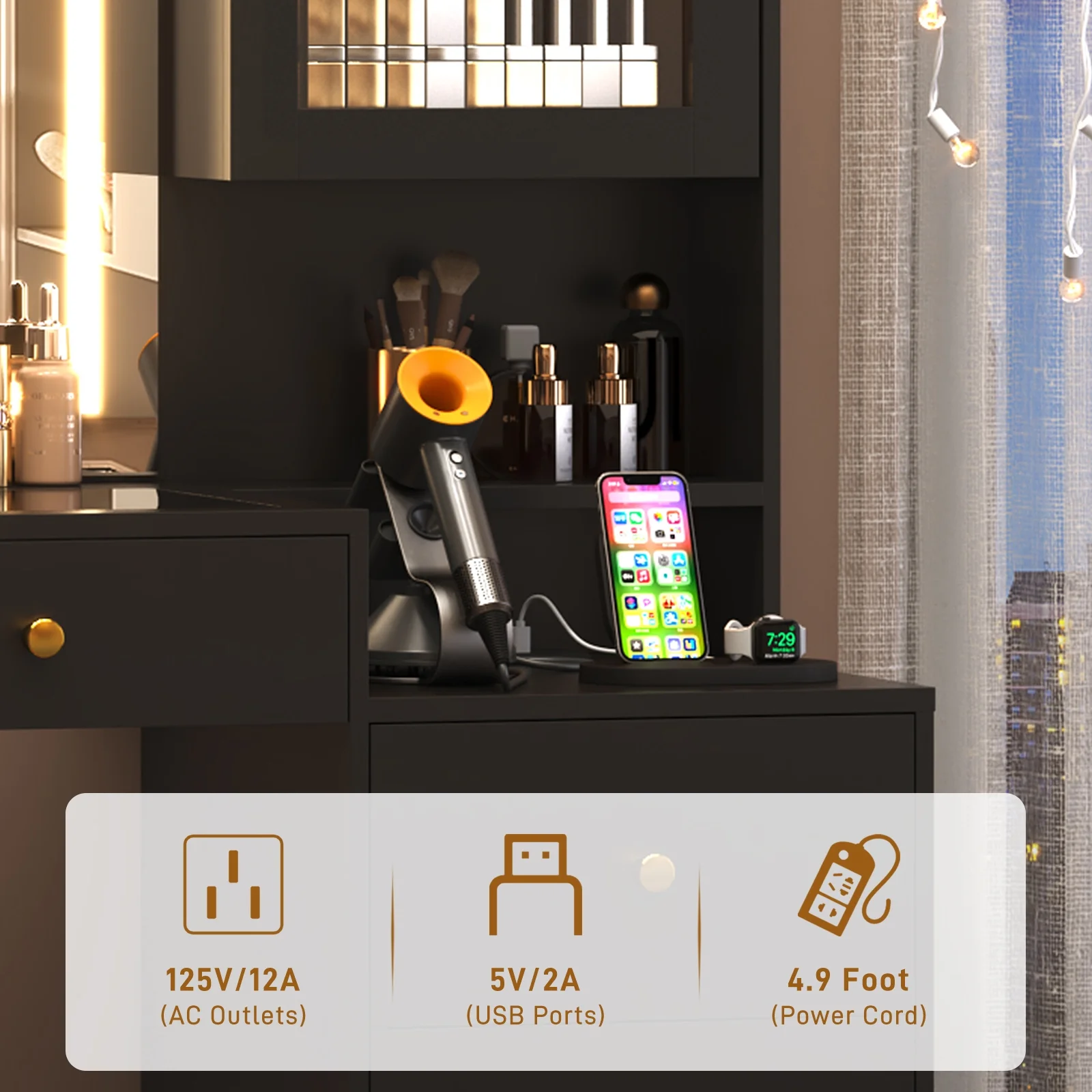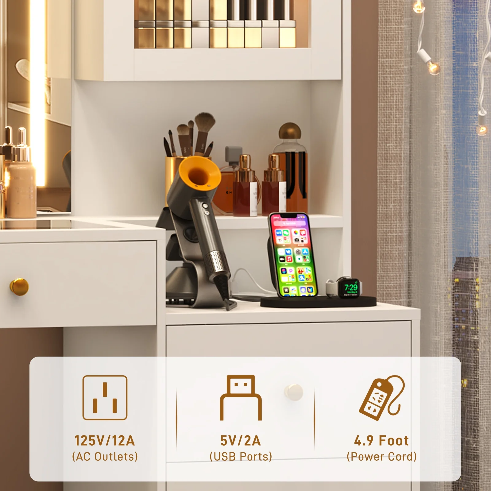 - Large Make up Desk with Charging Station --- Our white Vanity Desk features a charging station, includes 2 standard plug sockets and 2 USB ports to allow you to sit at your vanity and use your hair dryer or curling iron within arm reach and charge your phone, tablet, or other electronics.