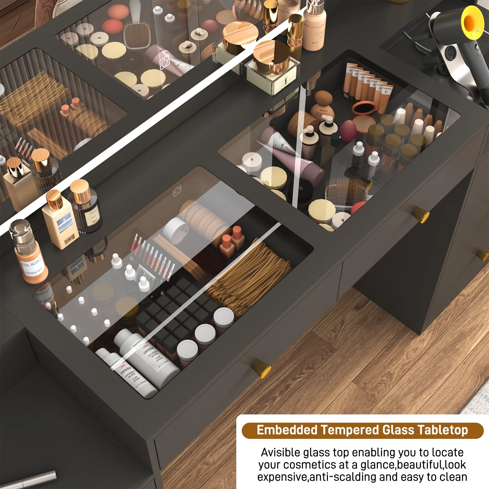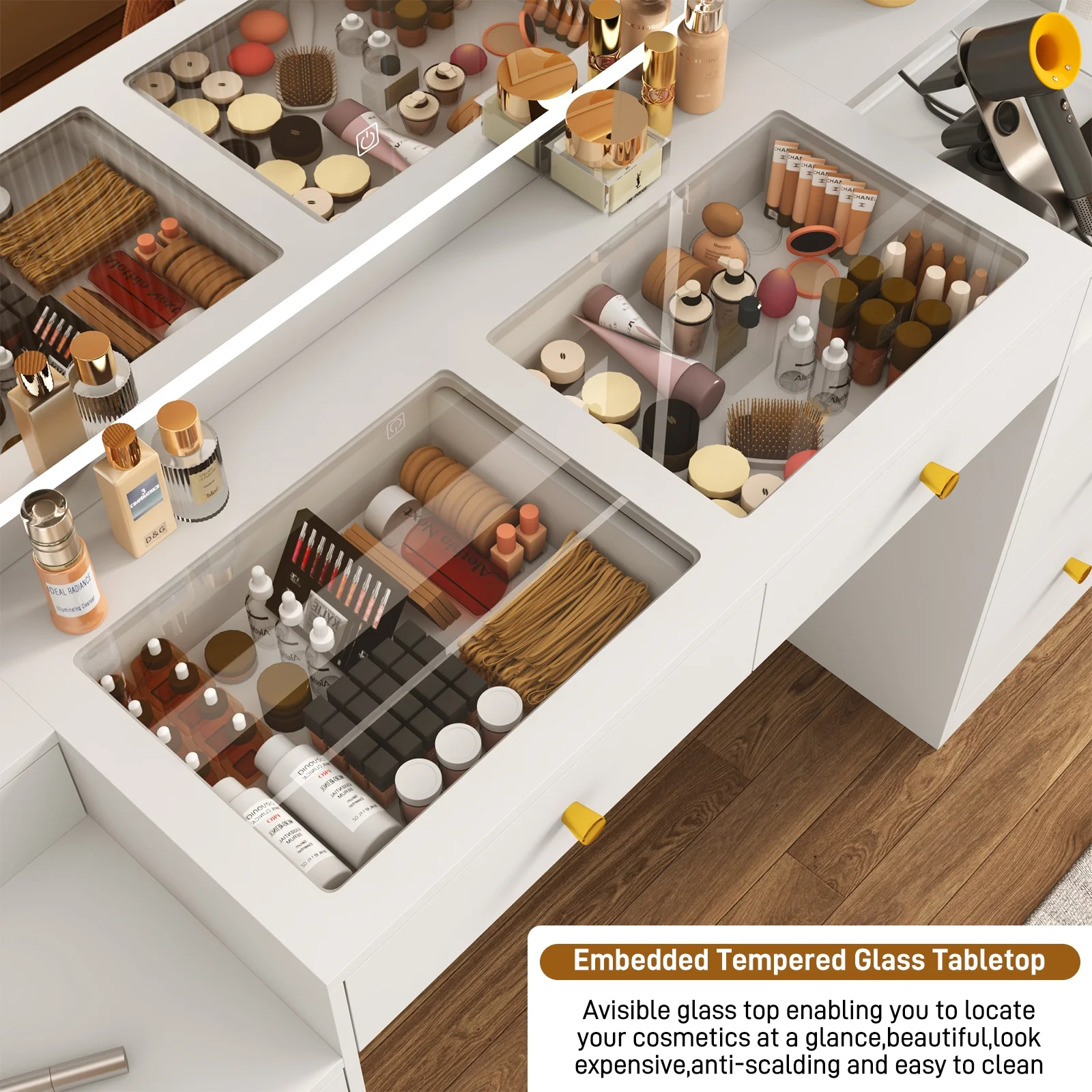 - Large Glass Desktop --- The Tempered glass desktop design can not only clearly view of the items stored in the drawer, no longer need to worry about finding the items, but also make the vanity looks more expensive and advanced.