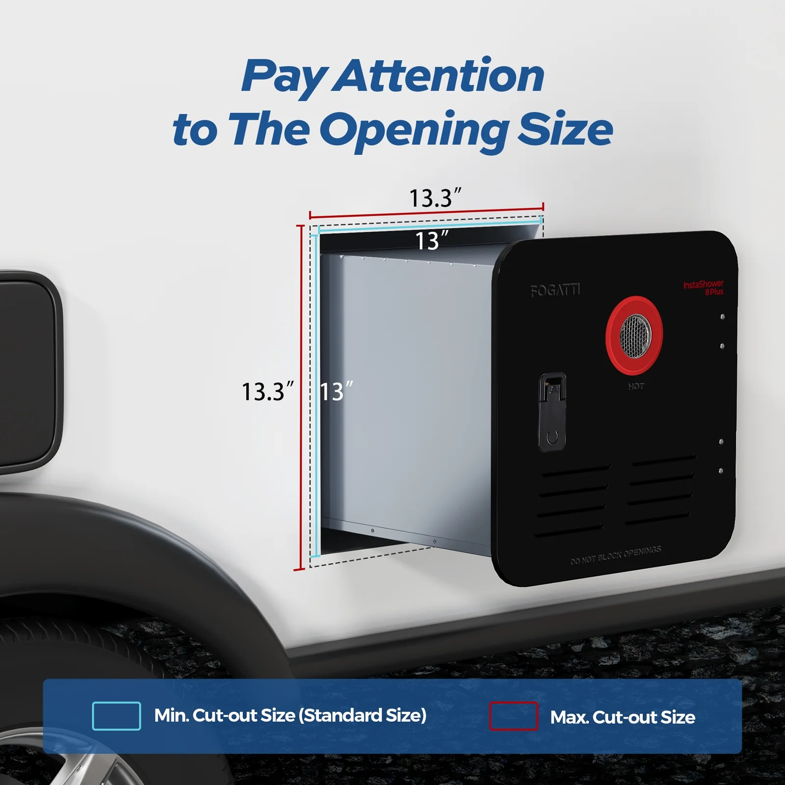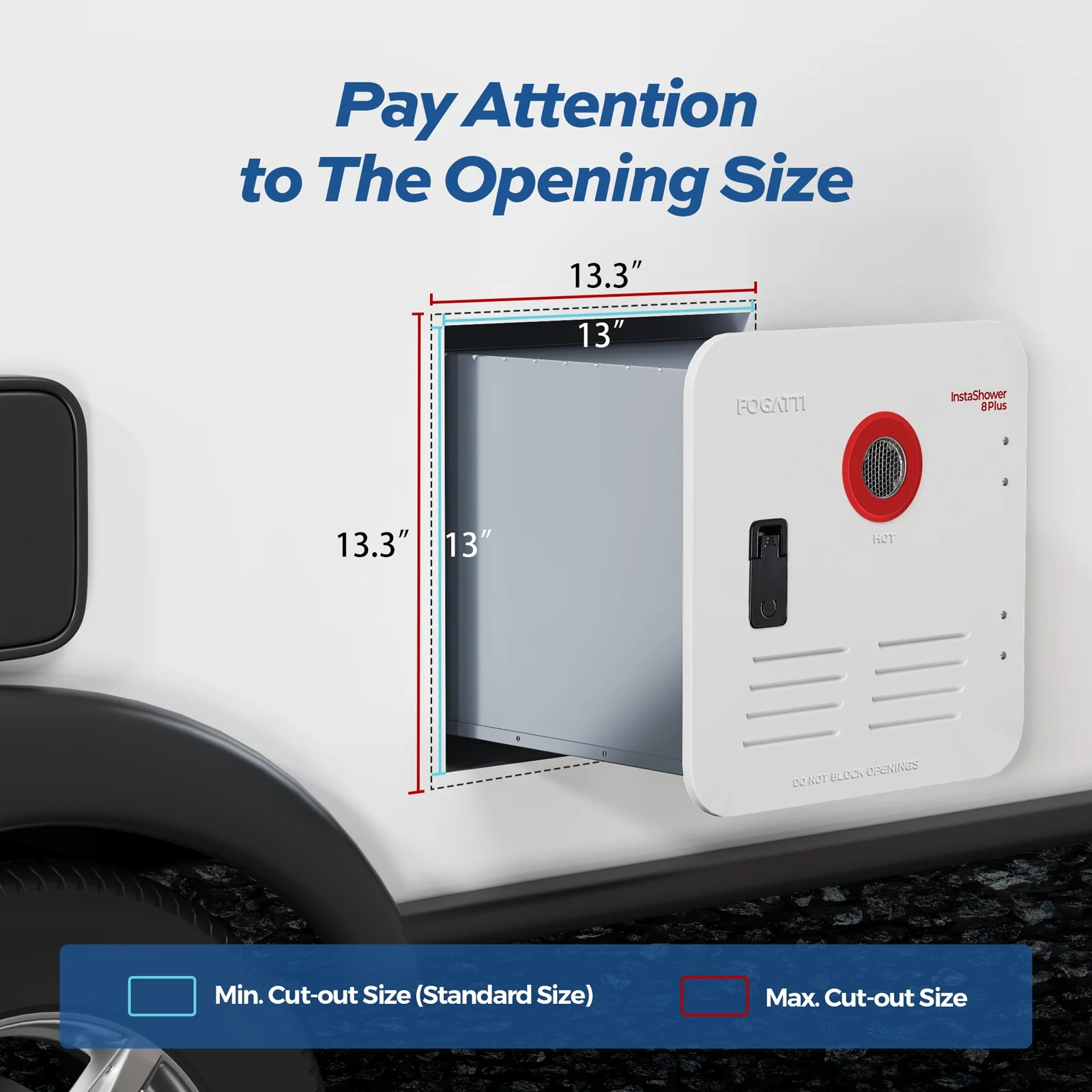 - The Fogatti RV water heater has a wide range of applications. The opening is 13 x 13 inches and the door is 15 x 15 inches. It can replace Suburban and Atwood's 6 gallons tank water heaters, as well as Girard and Furrion's tankless water heaters. If you were previously using a 10 gallons tank water heater, it will need to be retrofitted with an 18 x 18 door.