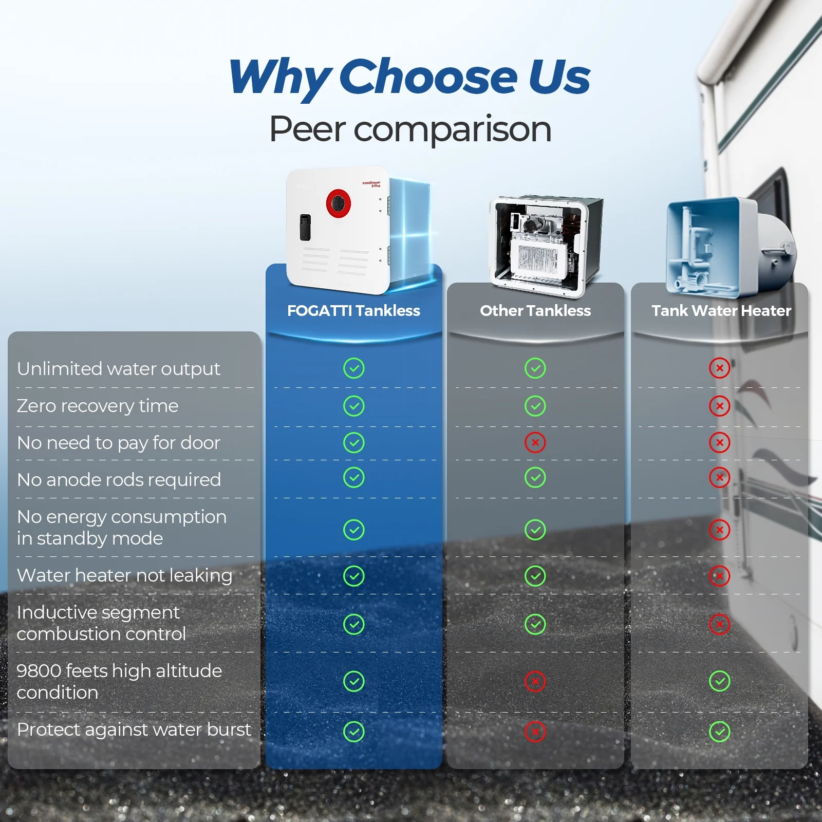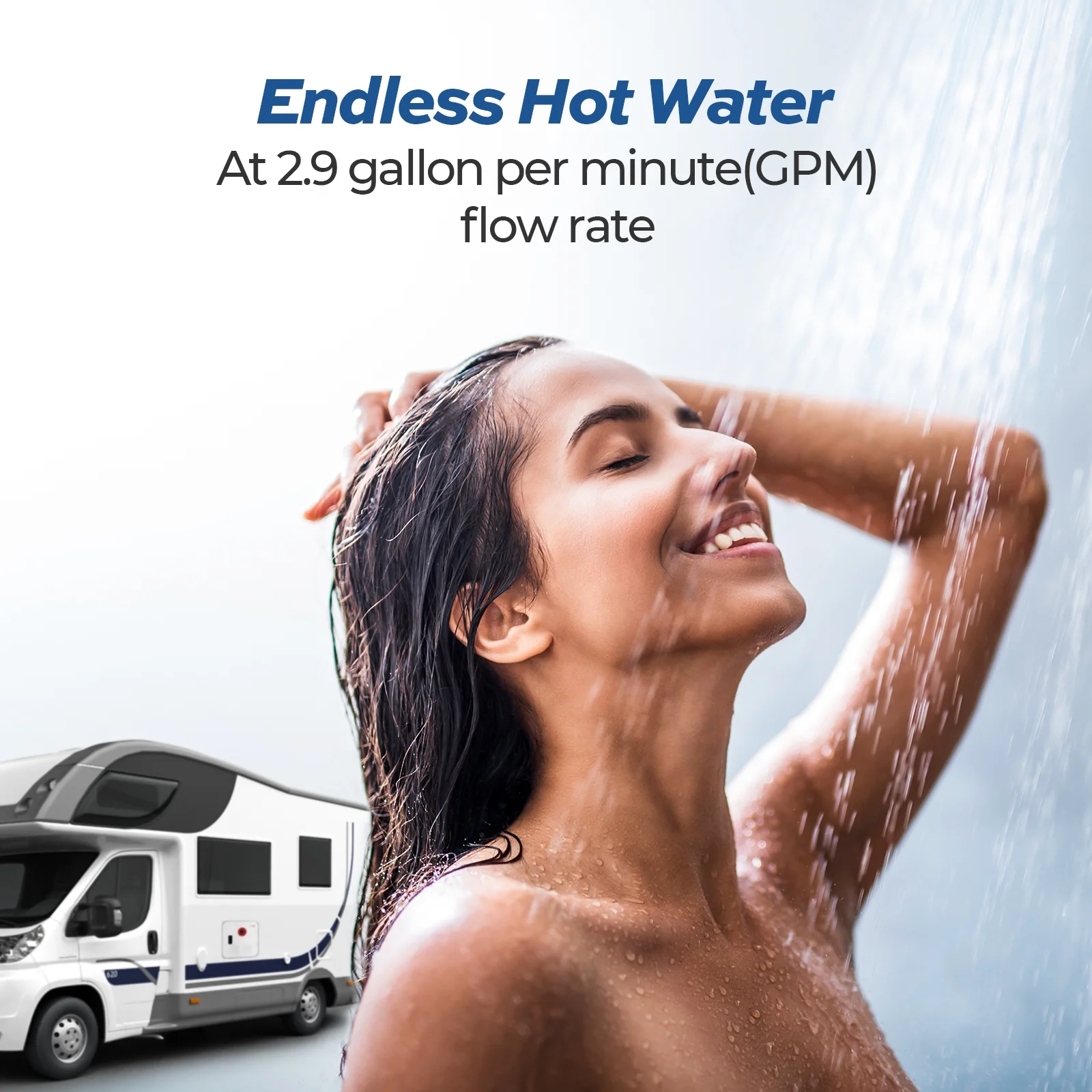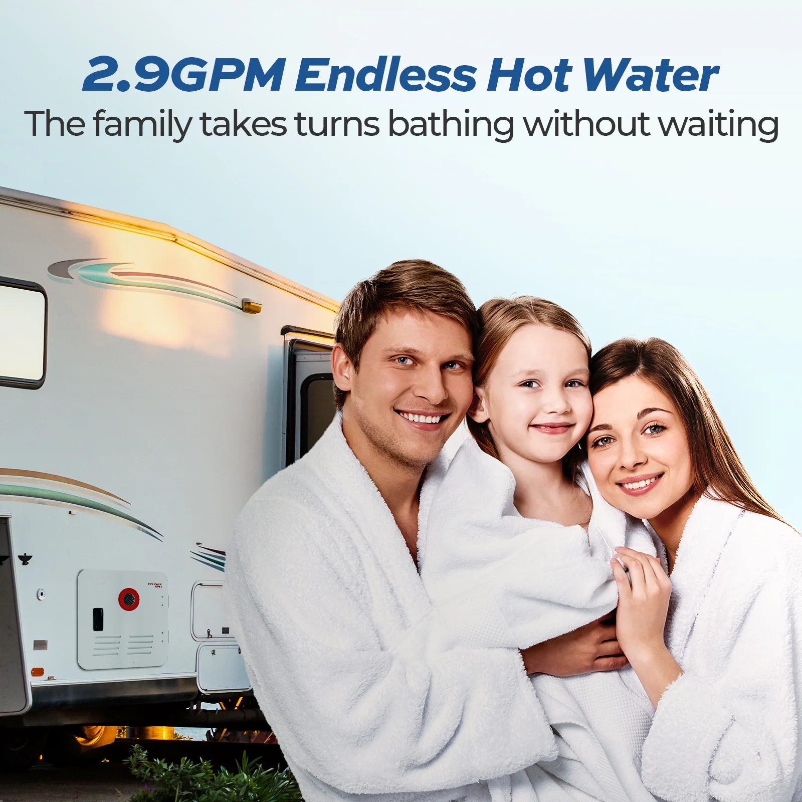 - RV tankless water heaters are taking off. Tankless water heaters are better than tanked water heaters for continuous showering of multiple people. There is no need to waste 20- 30 minutes waiting for hot water in the middle of the shower, so you can enjoy hot water at all times. It uses propane for heating, so there is no need to worry about running out of power in your caravan.