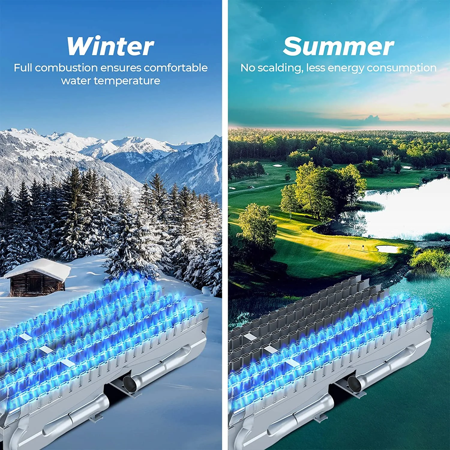 - The product is CSA certified and has multiple protection features such as a built-in forced exhaust fan on top, stable combustion, automatic gas shut-off for accidental flame failure and anti-freeze.