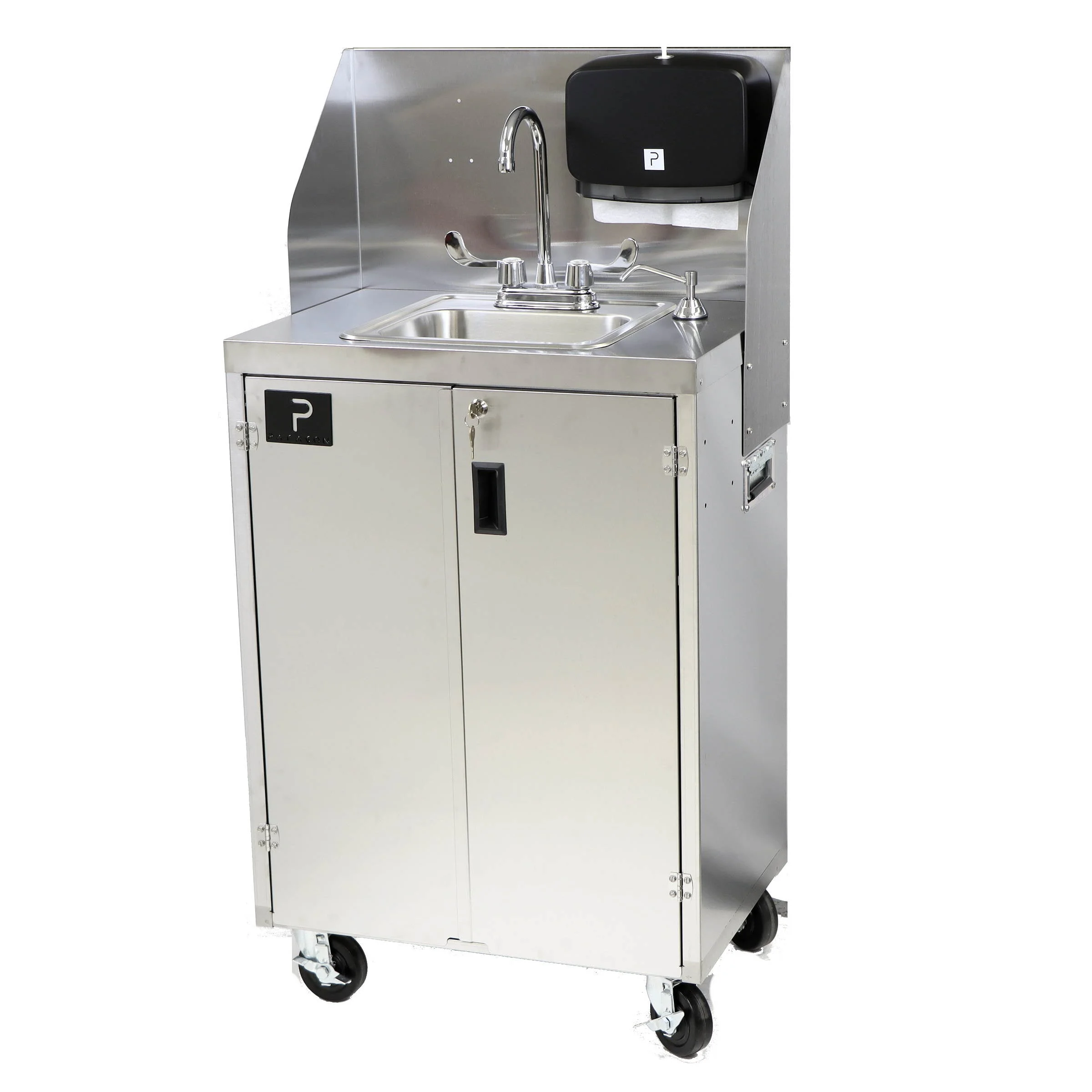 ELECTRIC HEATED HANDWASHING SINK - This portable sink includes a hot and cold water instant flash heater, an electric dispensing pump, doubled handled faucet, soap dispenser and tug-n-pull z-fold towel dispenser.