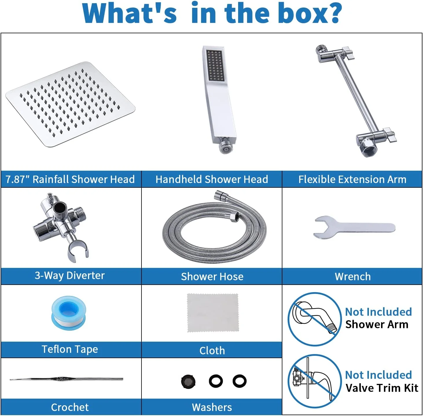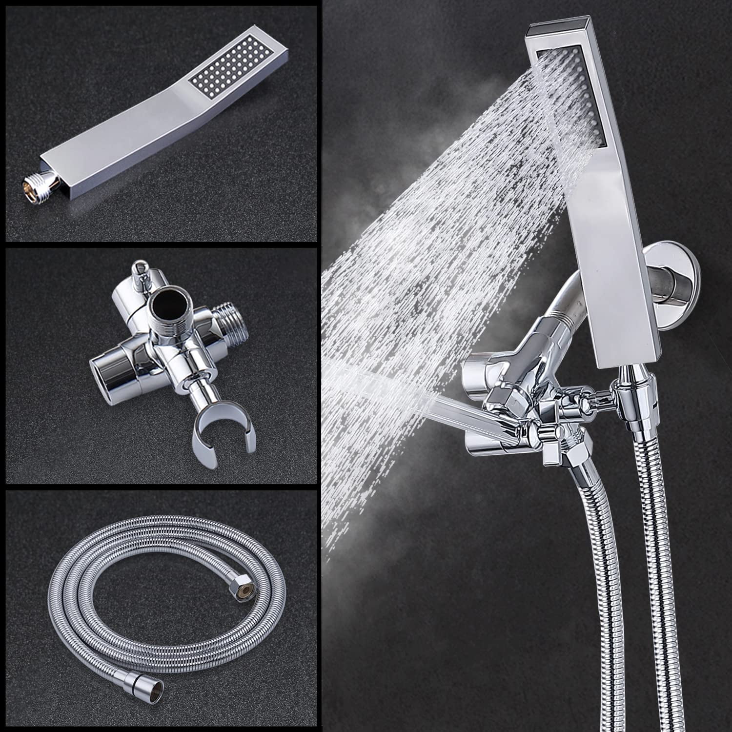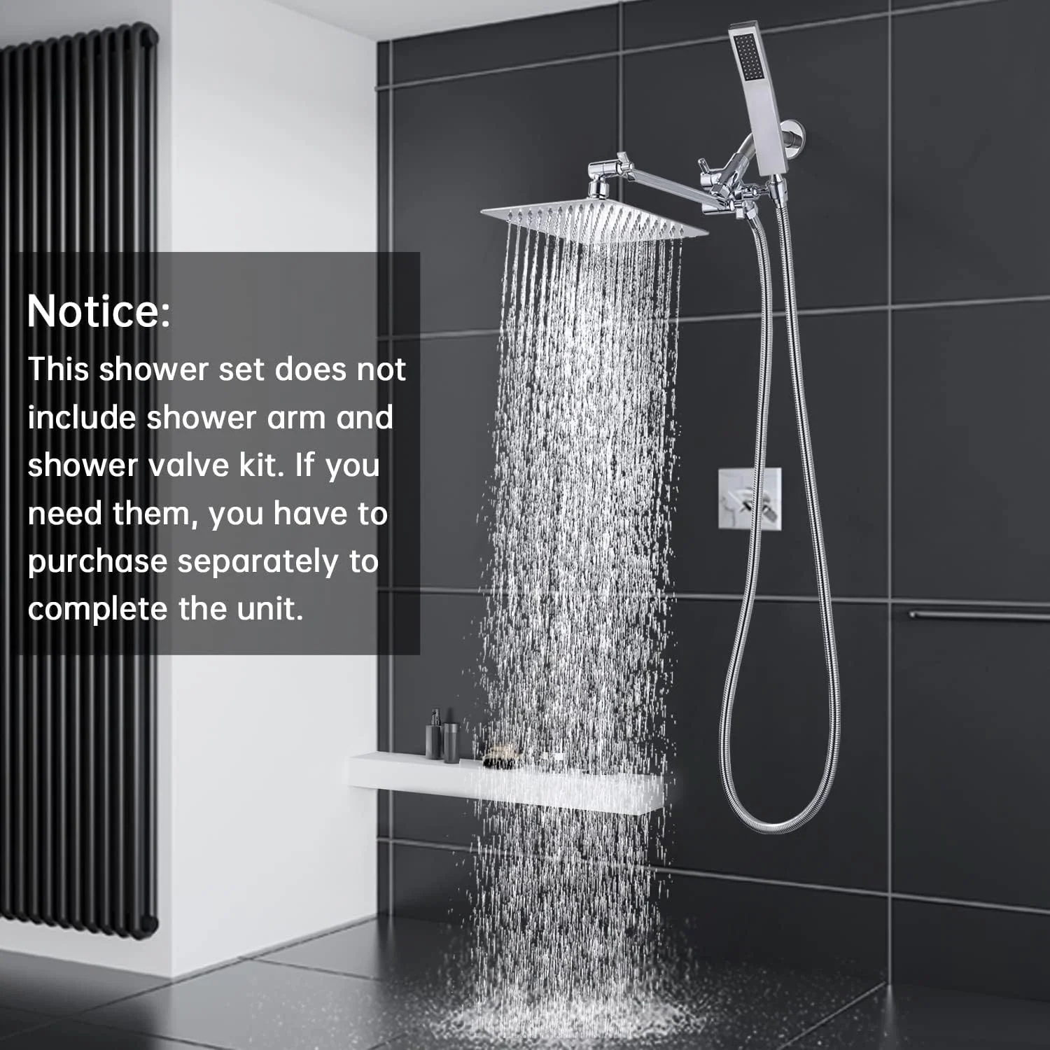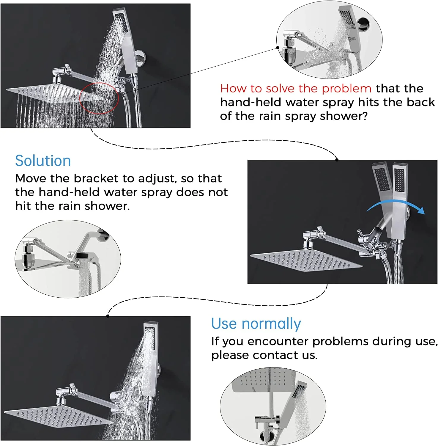 - METAL RAIN SHOWER HEAD AND HAND SHOWER WAND: Square design rain shower head and hand shower wand are made from stainless steel and brass. METAL construction is more durable than plastic, and provides a longer service life., METAL DIVERTER WITH BUILT-IN BRACKET: G-Promise's patented design. All metal construction, no worries about breaking. This diverter has a smooth control lever. You can switch easily between the hand shower & the shower head, or switch them both on at the same time. But When two outlets discharge at the same time, the water pressure is halved., 9-INCH SHOWER EXTENSION ARM: Keeps the shower head away from the wall. You can adjust the height, distance and angle with two knobs to meet your specific needs. The free spinning locking collar allows you to tighten the extender in a correct position., EASY INSTALLATION: Done in minutes with a simple wrench we offer. The illustrated instruction tells you clearly how to do. A metal crochet is prepared for you to remove easily the restrictor when the water pressure not enough. A plumbers' tape is always helpful during installation., A 3-YEAR : Bring you full confidence. Any questions, US via email, we will get back to you as soon as possible.