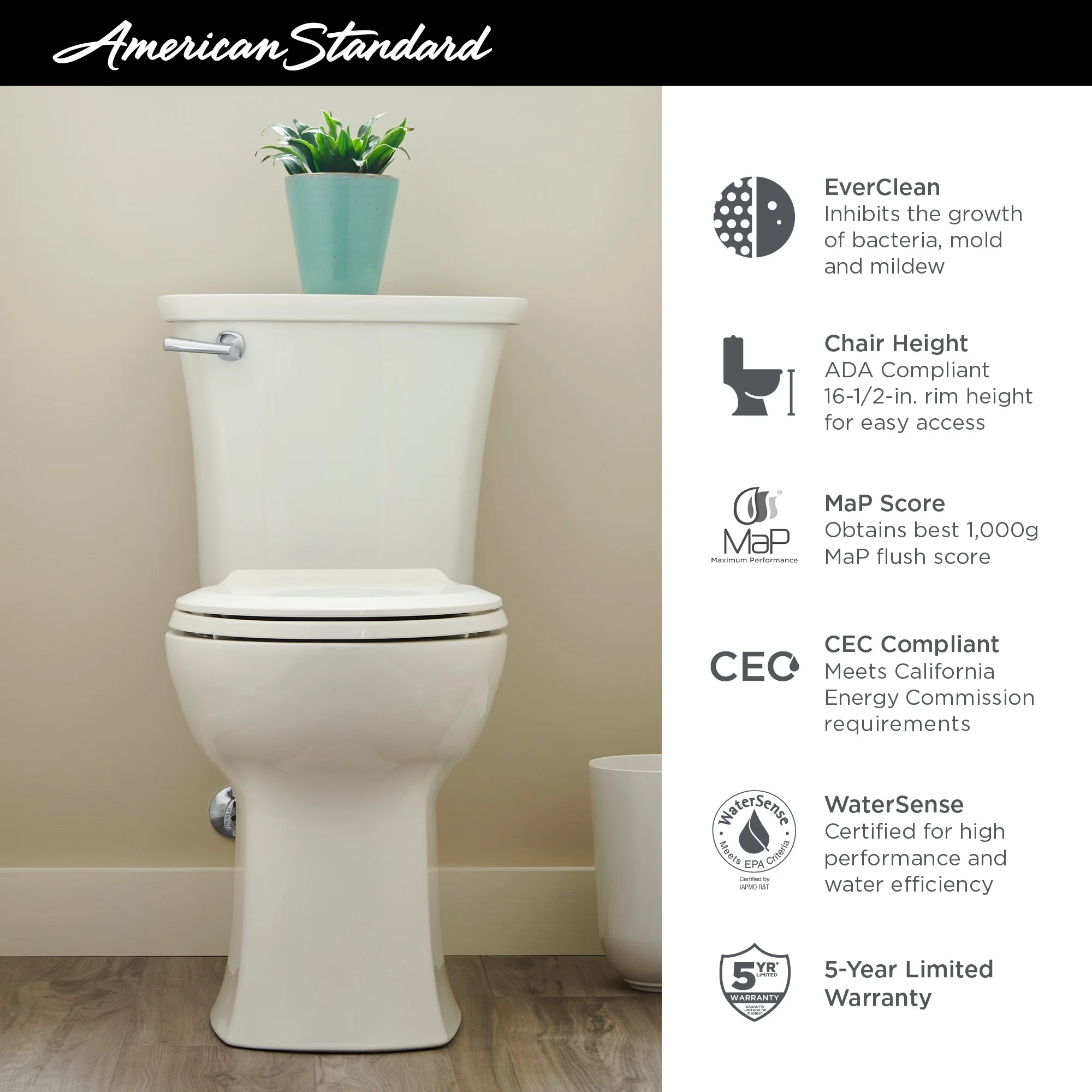 The Edgemere Right Height Elongated Toilet boasts a timeless style with a contemporary twist. This High Efficiency toilet meets EPA WaterSense criteria to help save water, and has a PowerWash rim that rinses the bowl clean after each flush. A durable finish provides quality long-lasting products that can withstand everyday use. This Edgemere toilet is made of vitreous china and features our innovative EverClean surface.