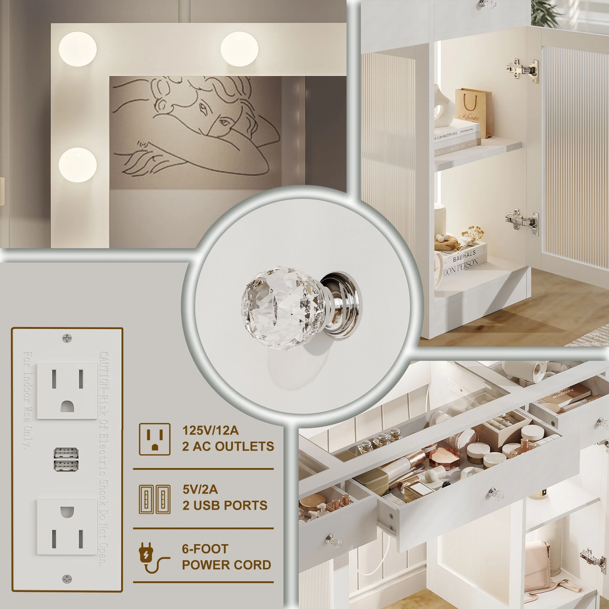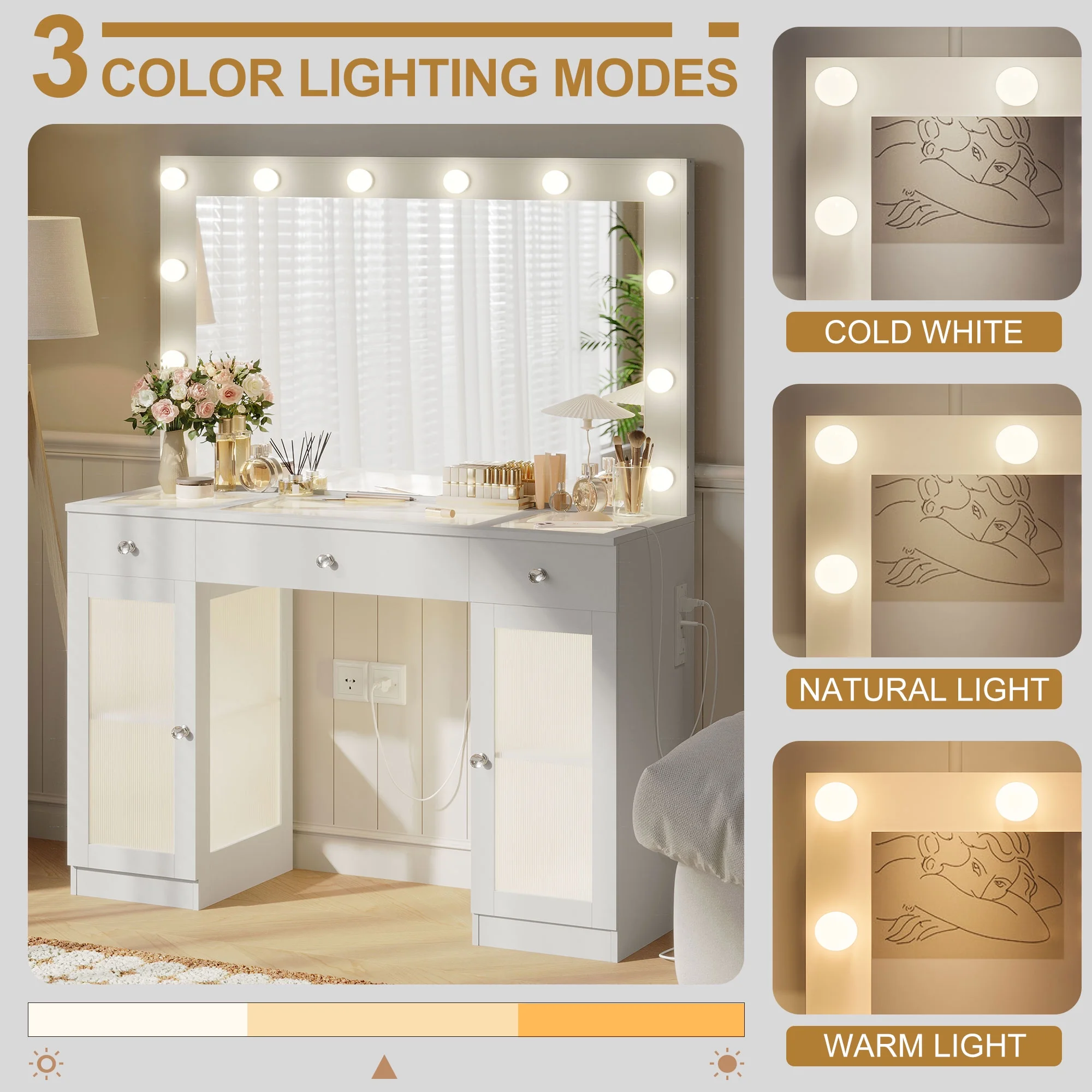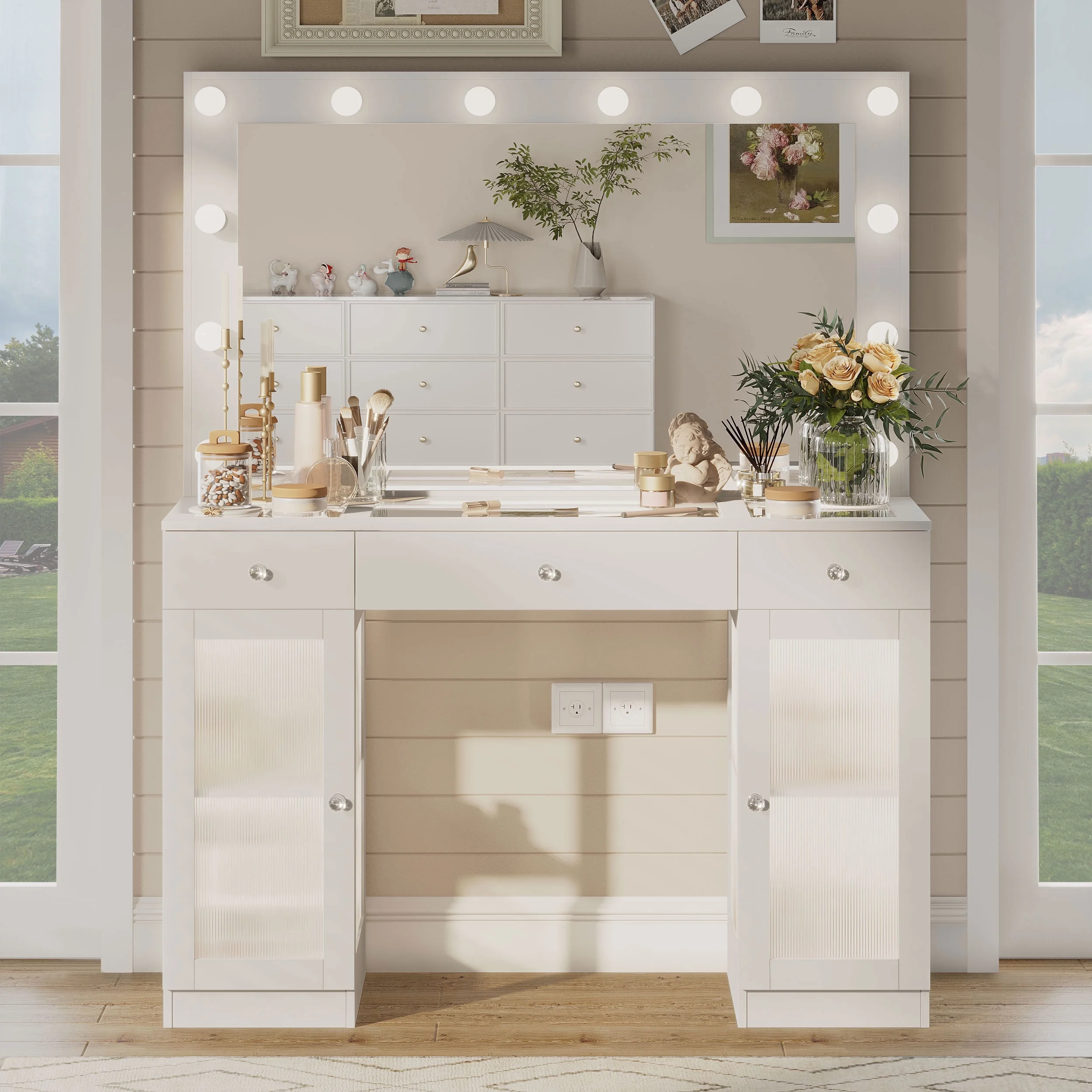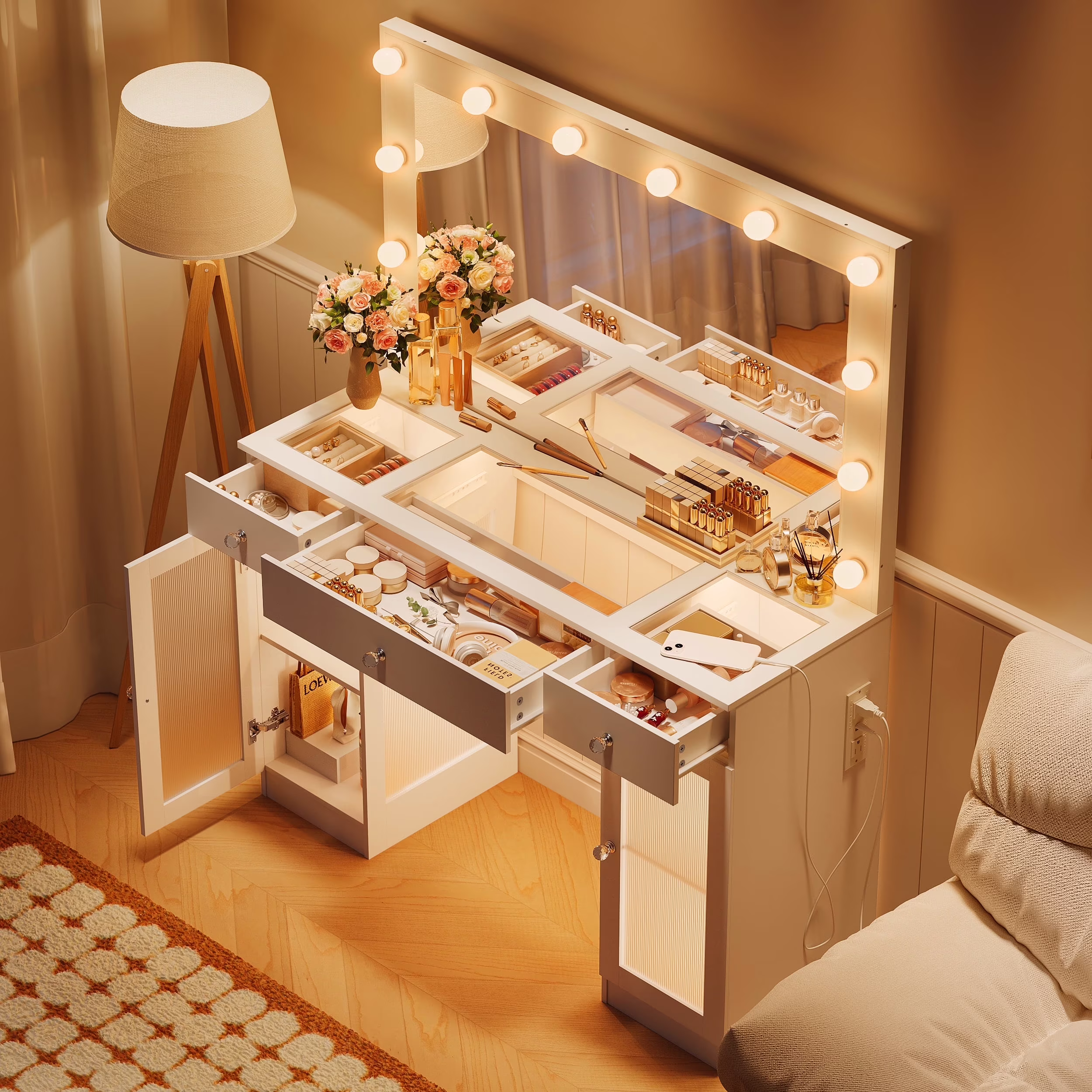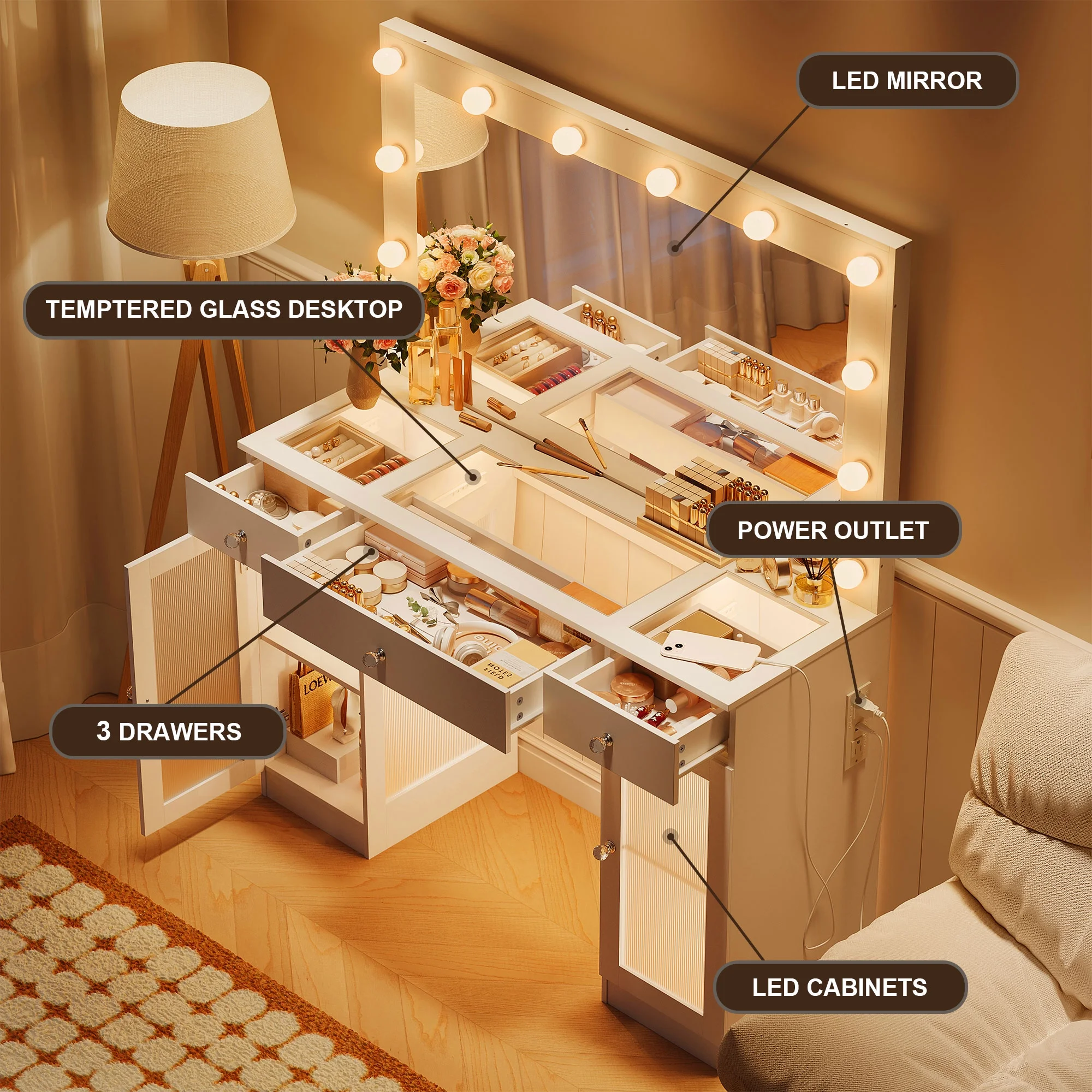 This multifunctional Makeup Vanity is uniquely designed to add a touch of refinement to your room. This large dressing table has four shelves, a spacious composite glass tabletop, three drawers, and two cabinets to help you better organize your items. The transparent desktop and cabinet door allow you to see a variety of beauty tools at a glance, equipped with a charging station, 2 standard power sockets, and 2 USB ports for easy use on mobile devices. If you are still looking for a beautiful and practical dressing table, don't hesitate, come and buy it now!