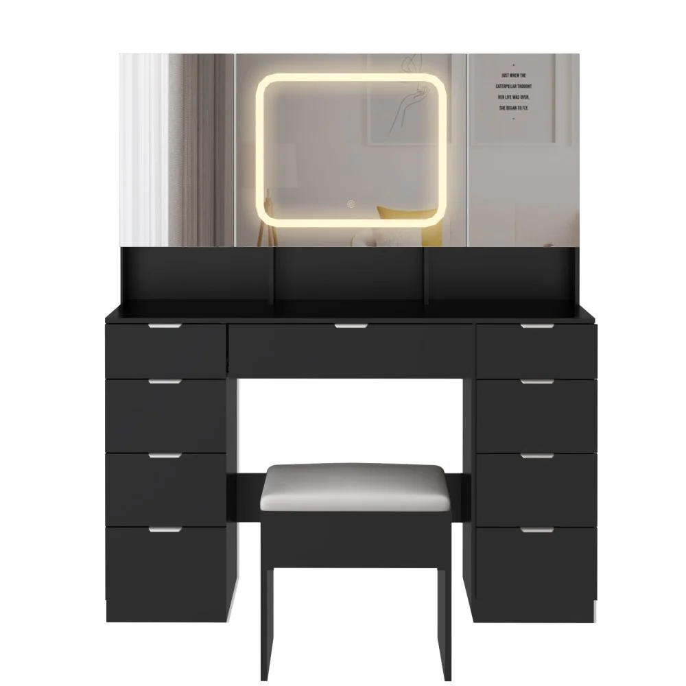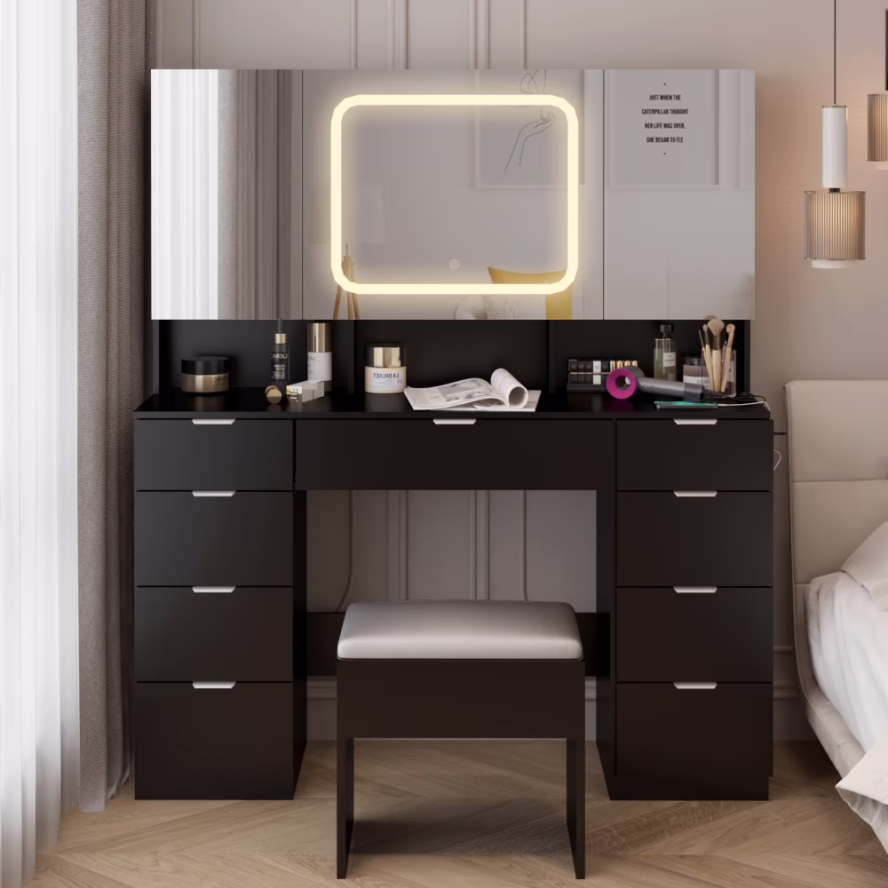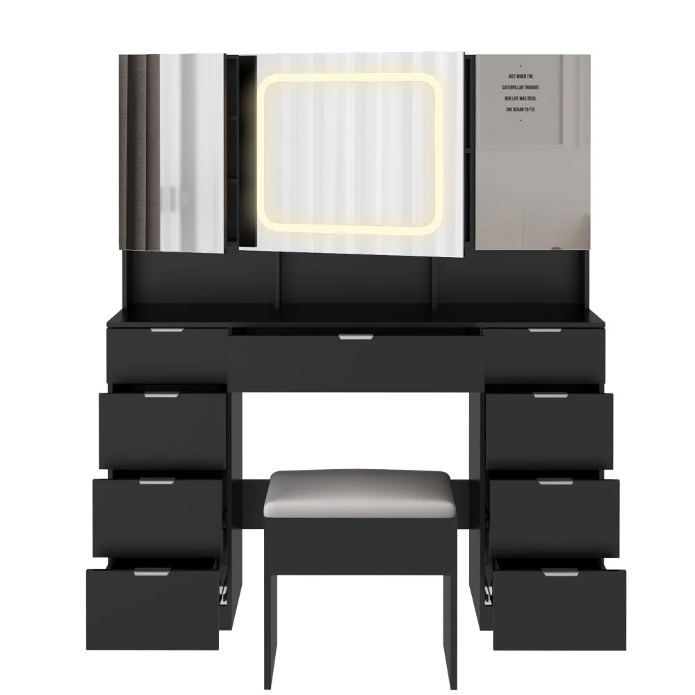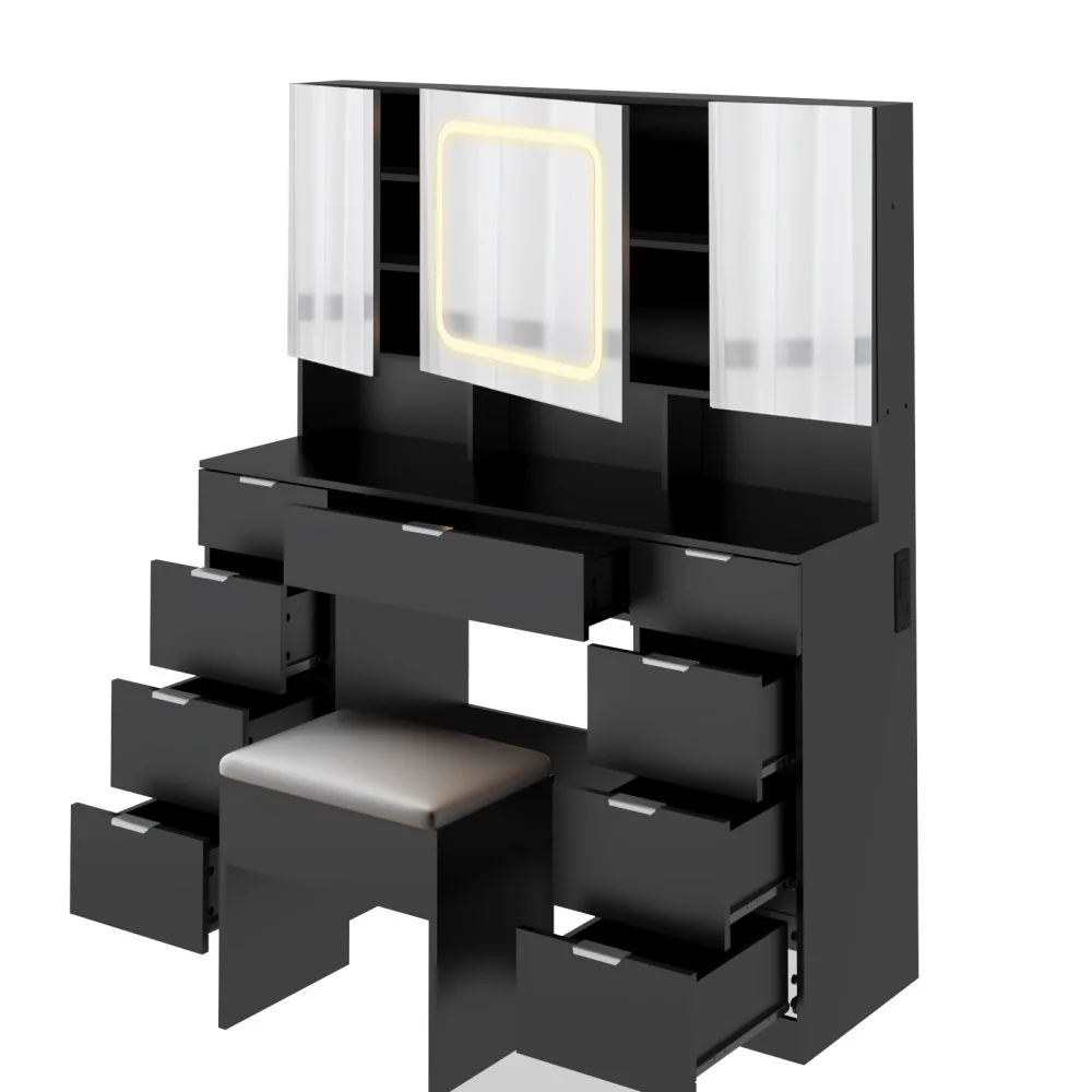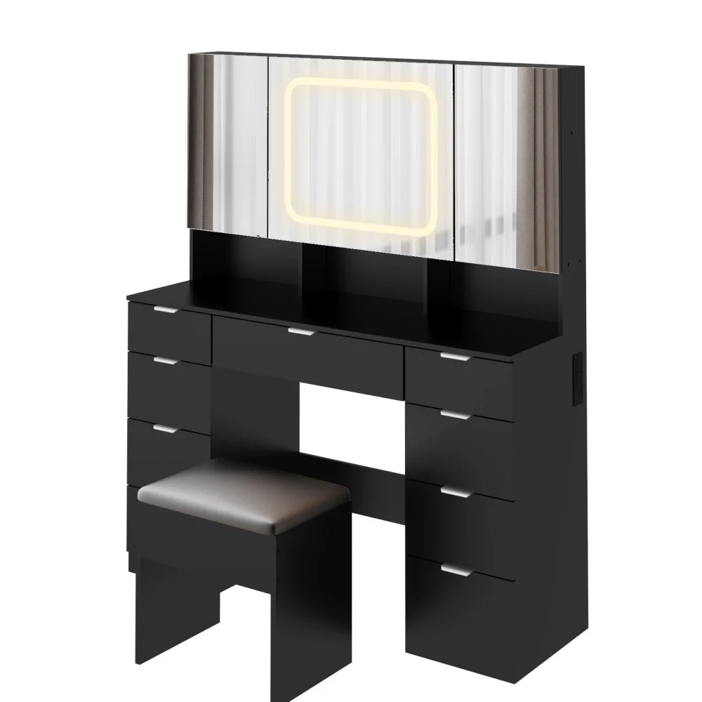 - Large Vanity Table Set with 3 Opening Mirrors and LED Lights, Vanity Table with Full Storage Behind Mirror, Makeup Table with Drawers and Storage Shelves, Cushioned Stool for Bedroom, Black
