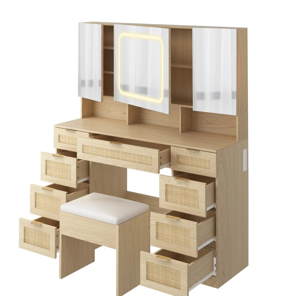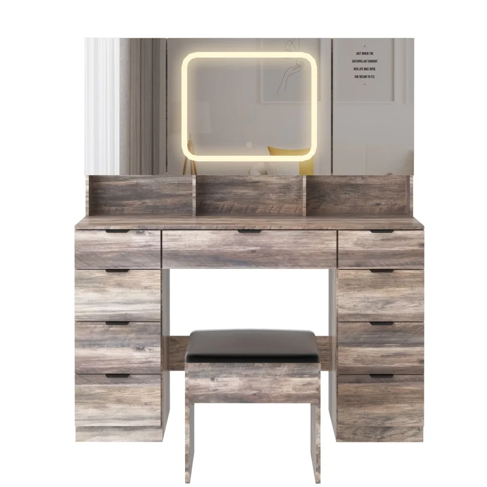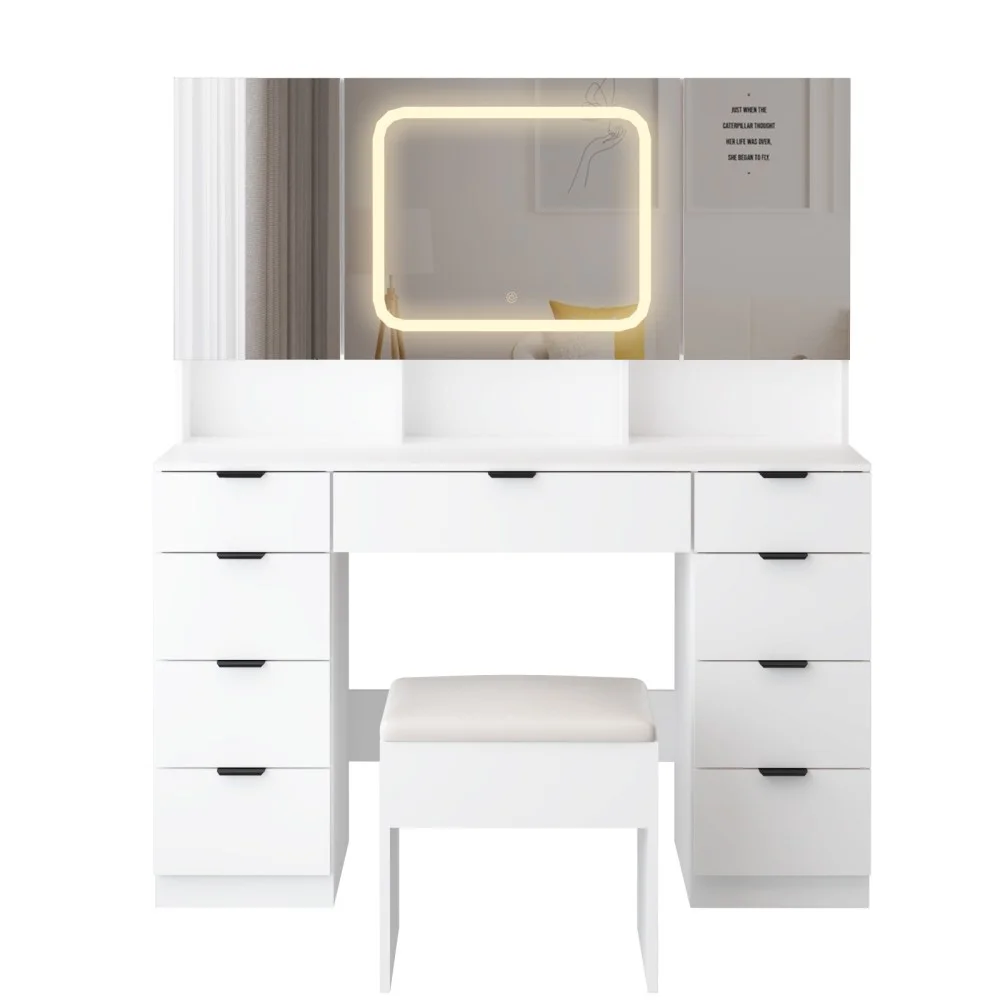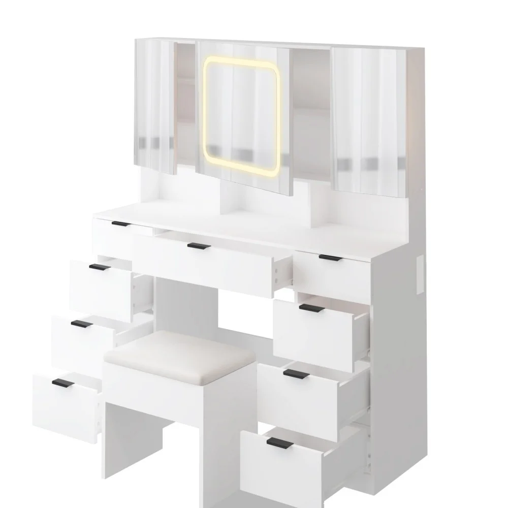 Large Vanity Table Set with 3 Opening Mirrors and LED Lights, Vanity Table with Full Storage Behind Mirror, Makeup Table with Drawers and Storage Shelves, Cushioned Stool for Bedroom