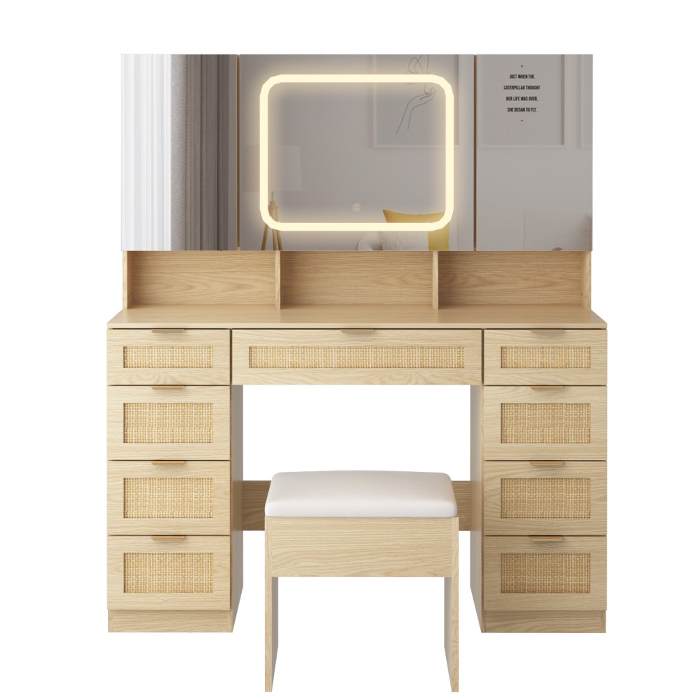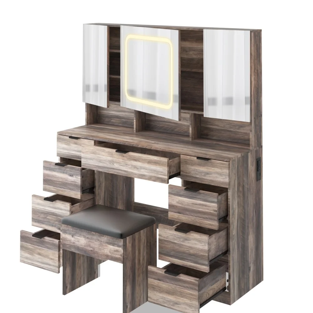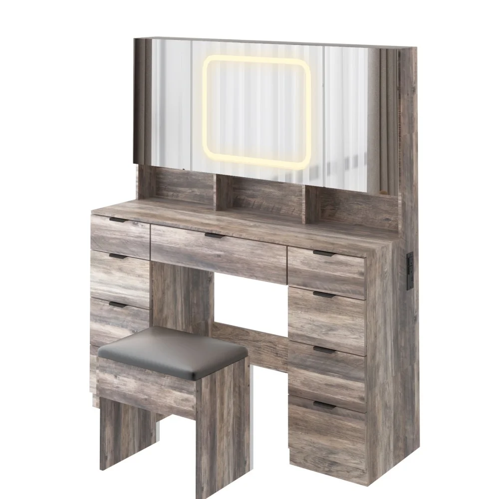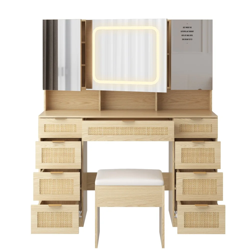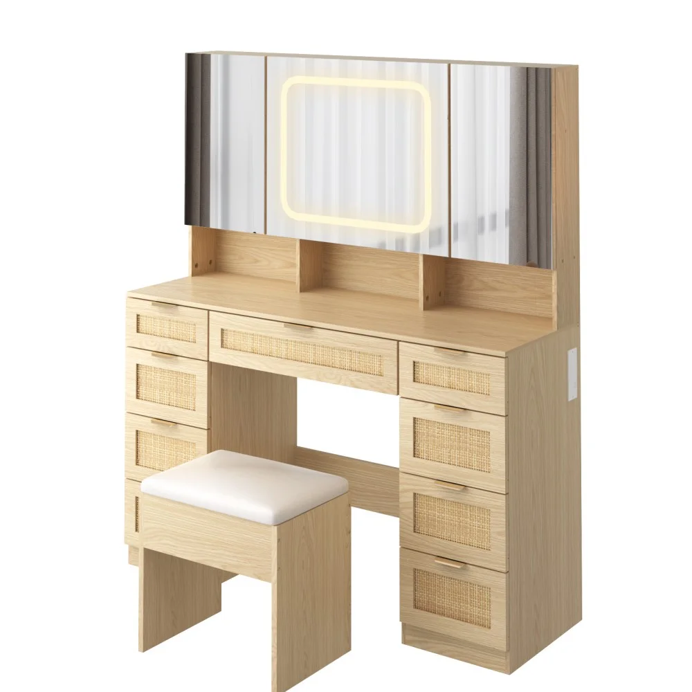 Large Vanity Table Set with 3 Opening Mirrors and LED Lights, Vanity Table with Full Storage Behind Mirror, Makeup Table with Drawers and Storage Shelves, Cushioned Stool for Bedroom