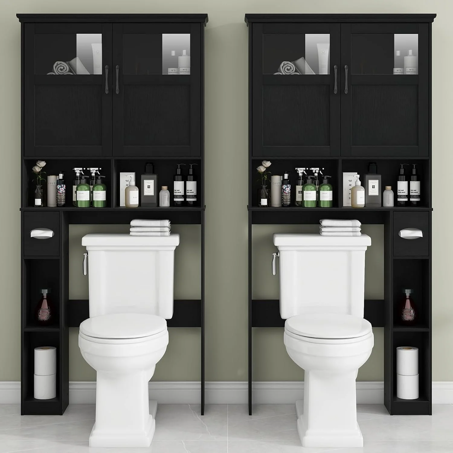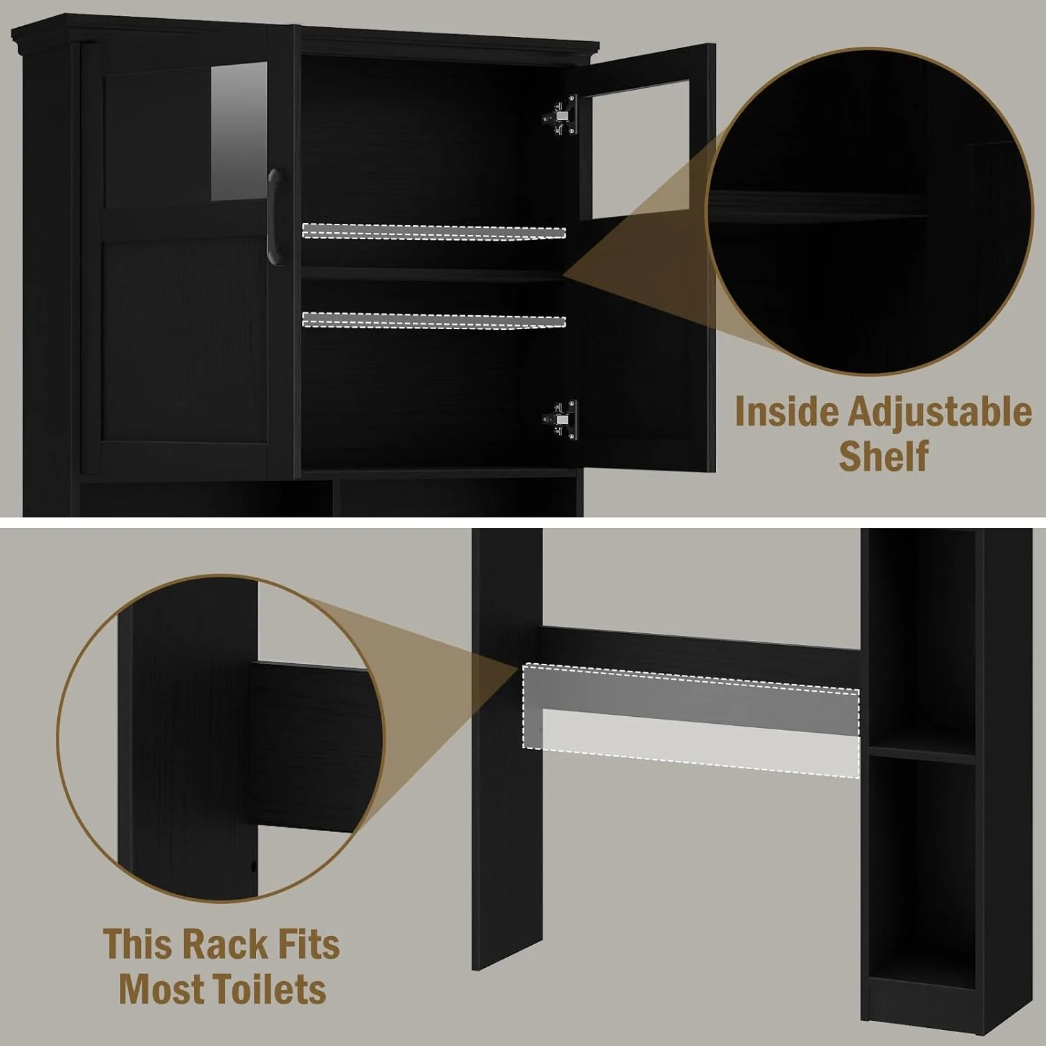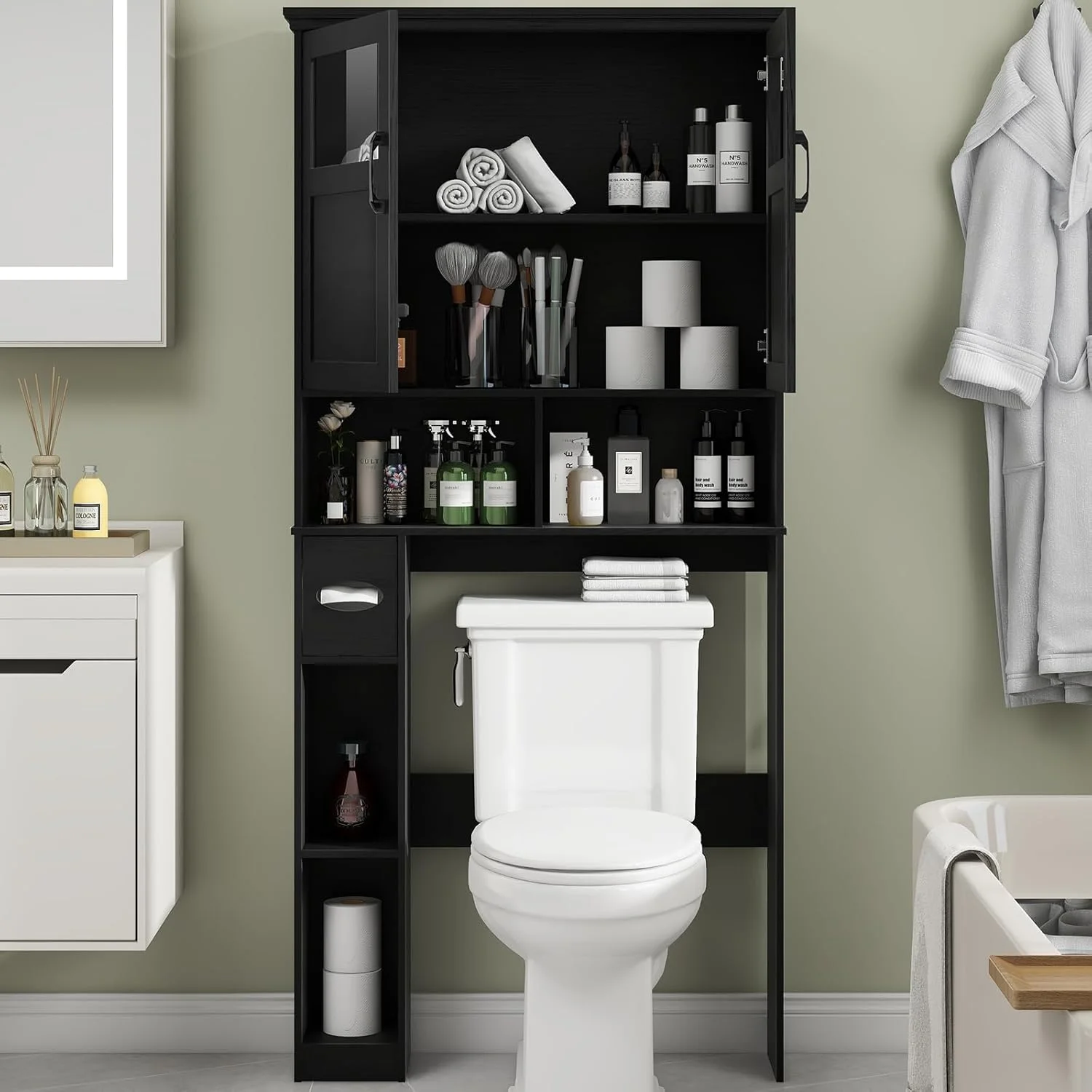 Over the Toilet Storage Cabinet, Storage Cabinet Over Toilet with Double Doors & Toilet Paper Holder Stand, Freestanding Toilet Shelf Space Saver with Anti - Tip Design & Adjustable Shelf, Black