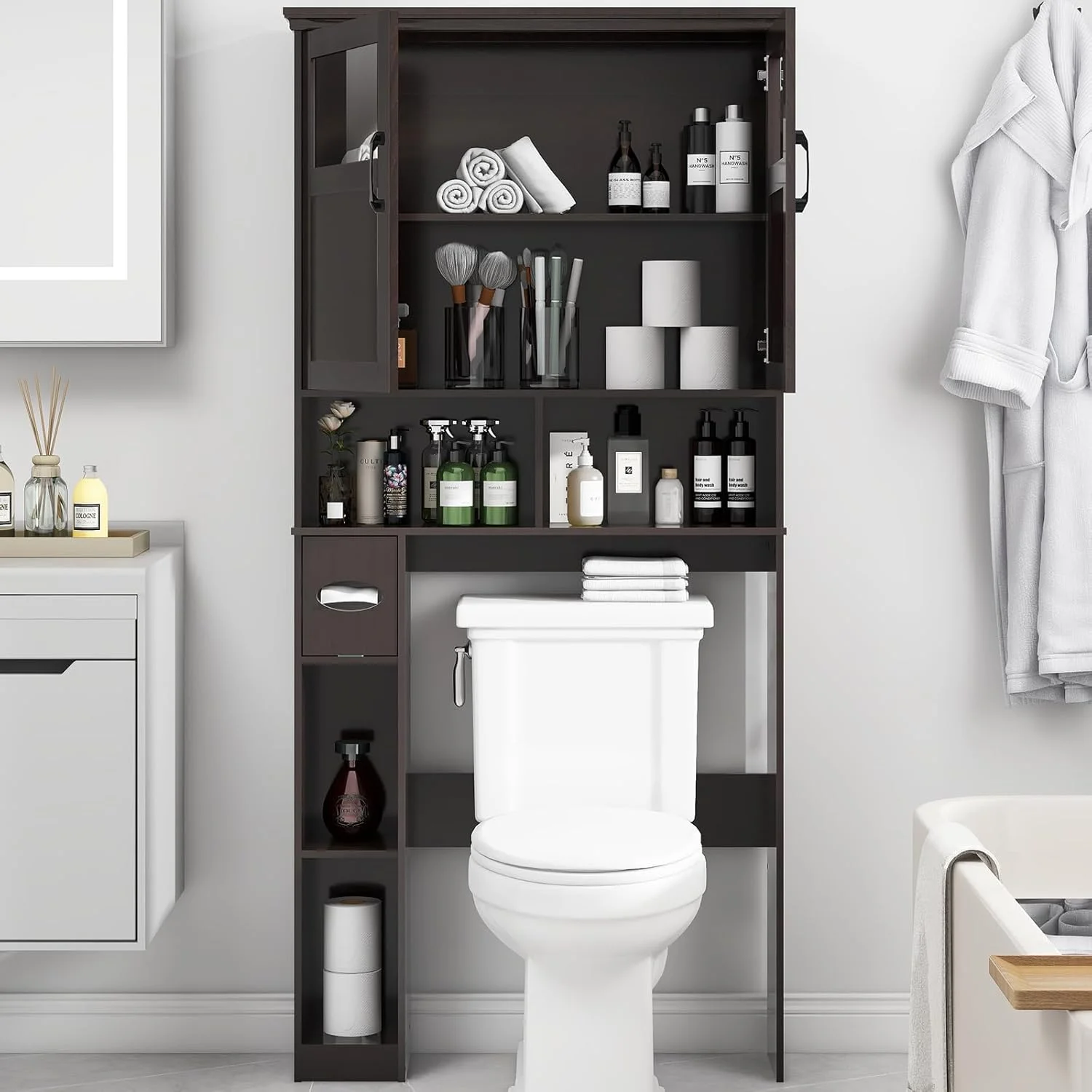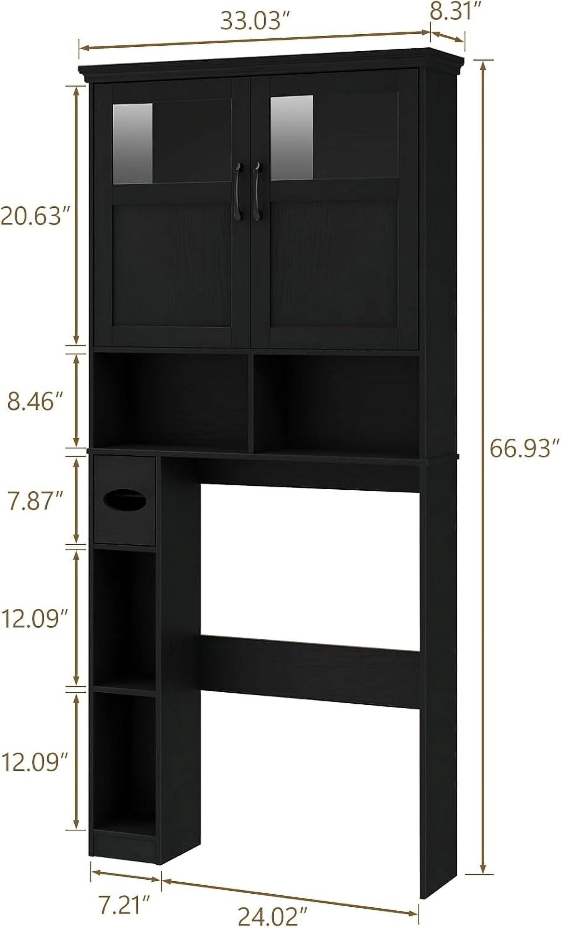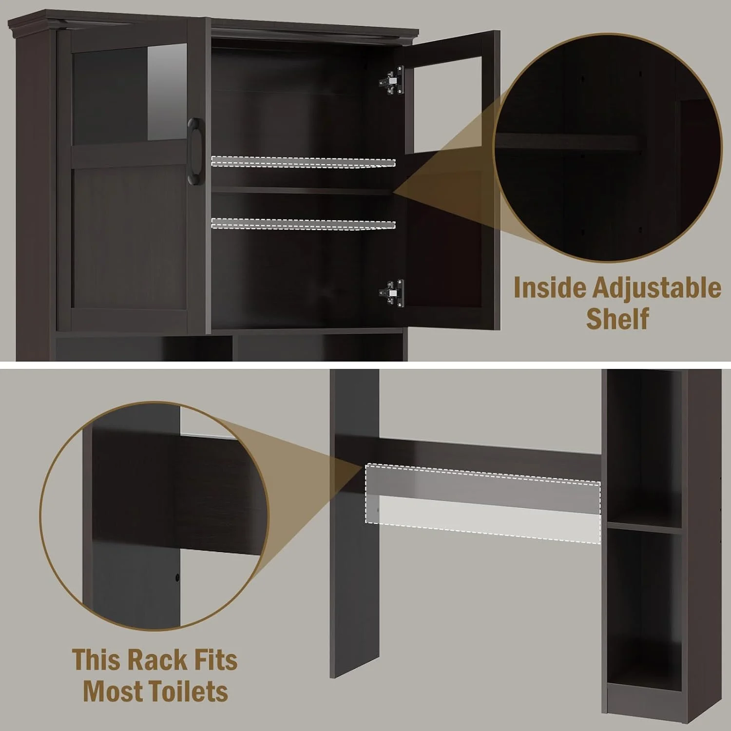 Over the Toilet Storage Cabinet, Storage Cabinet Over Toilet with Double Doors & Toilet Paper Holder Stand, Freestanding Toilet Shelf Space Saver with Anti - Tip Design & Adjustable Shelf, Black