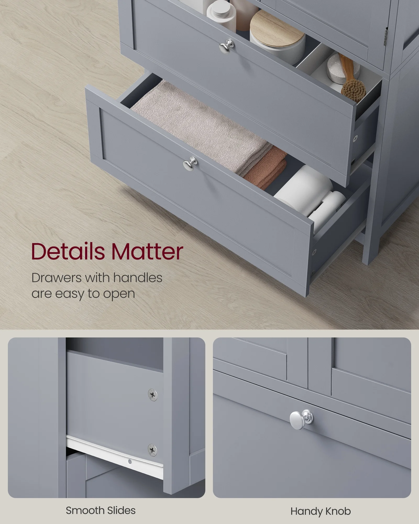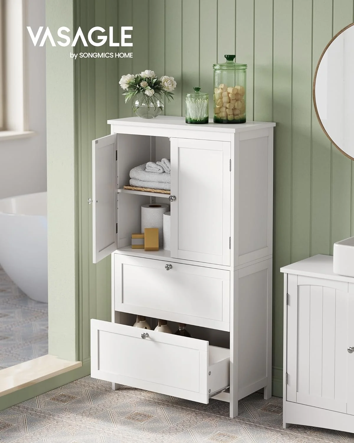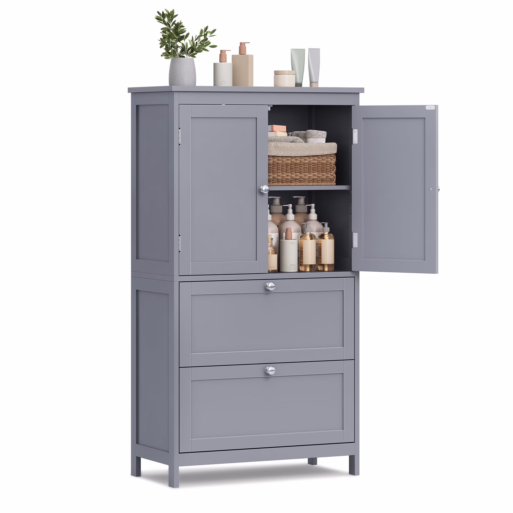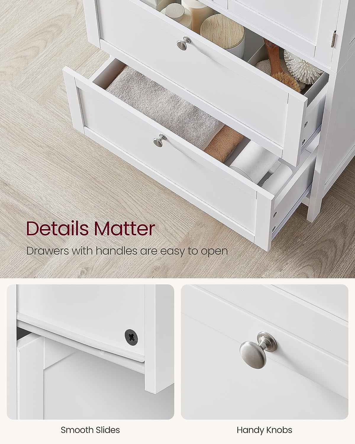 - [Combines Quality & Style] Crafted from high-quality MDF and equipped with an anti-tip device, this storage unit is durable and stable. Its stylish decorative panels enhance the look of your bathroom
