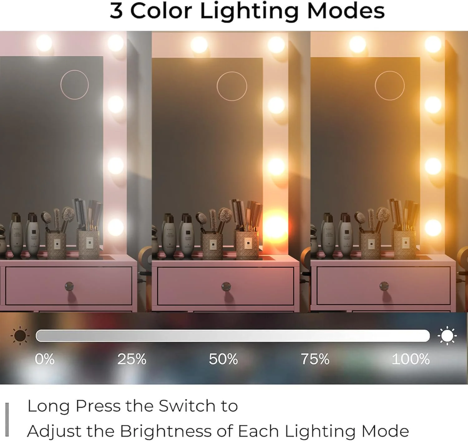 - 3 Lighting Modes: 12 Hollywood light bulbs is surround the large and clear mirror to meet your makeup needs; This vanity with lights include 3 adjustable lighting modes: cold light, natural light and warm light,long pressing the switch can change lighting color; The makeup vanity will be the best partner for makeup, live broadcast or vlog recording
