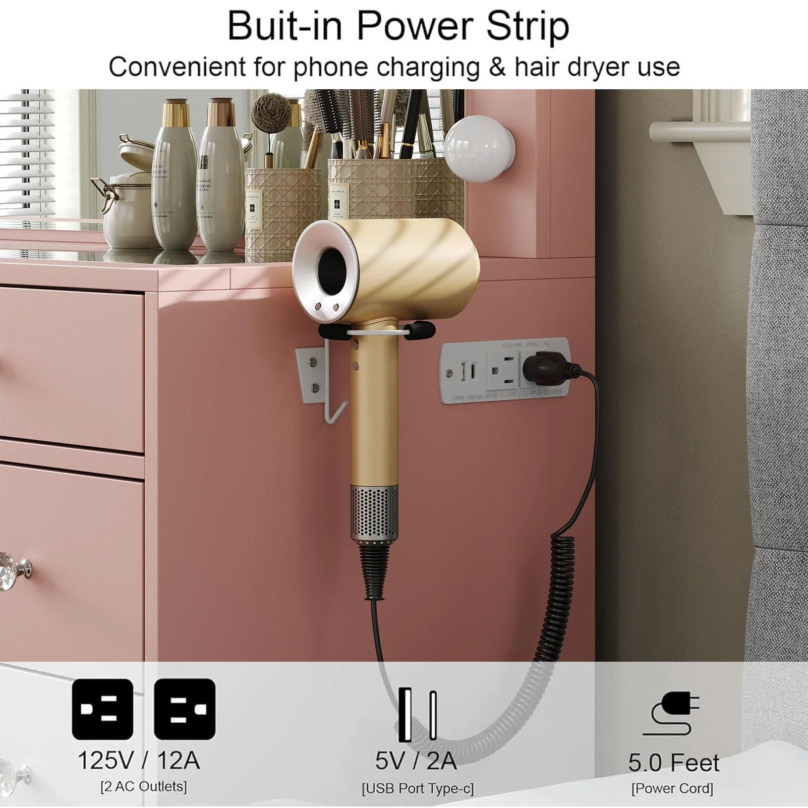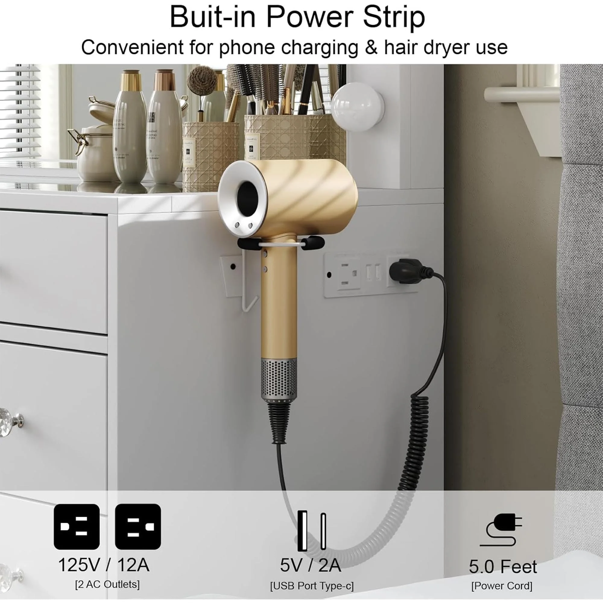 - Built-in Power Outlet: The vanity comes with a hair dryer stand with a built-in power outlet; The built-in charging station includes 2 standard plug sockets and 2 USB ports to connect your hair dryer, curling iron, computer, cell phone, ipad and other devices, so that all activities can be carried out on this vanity table