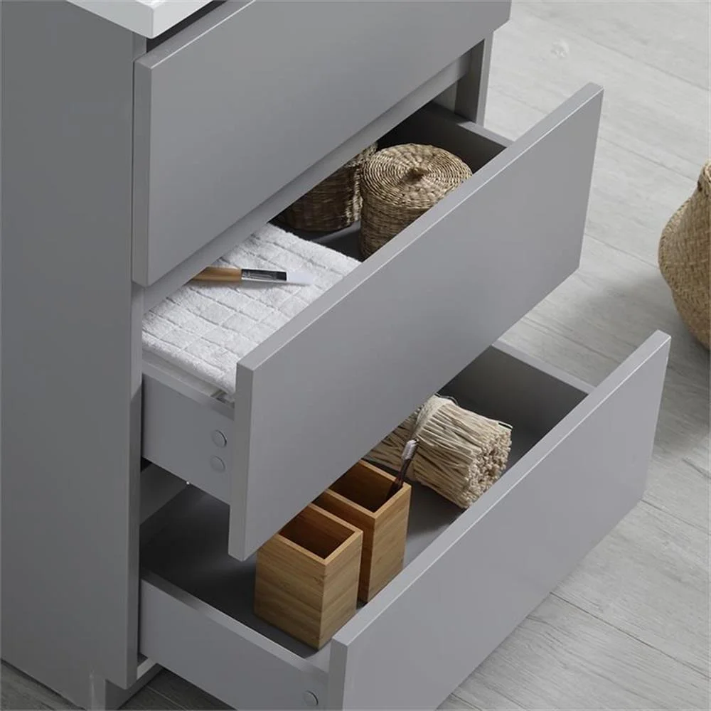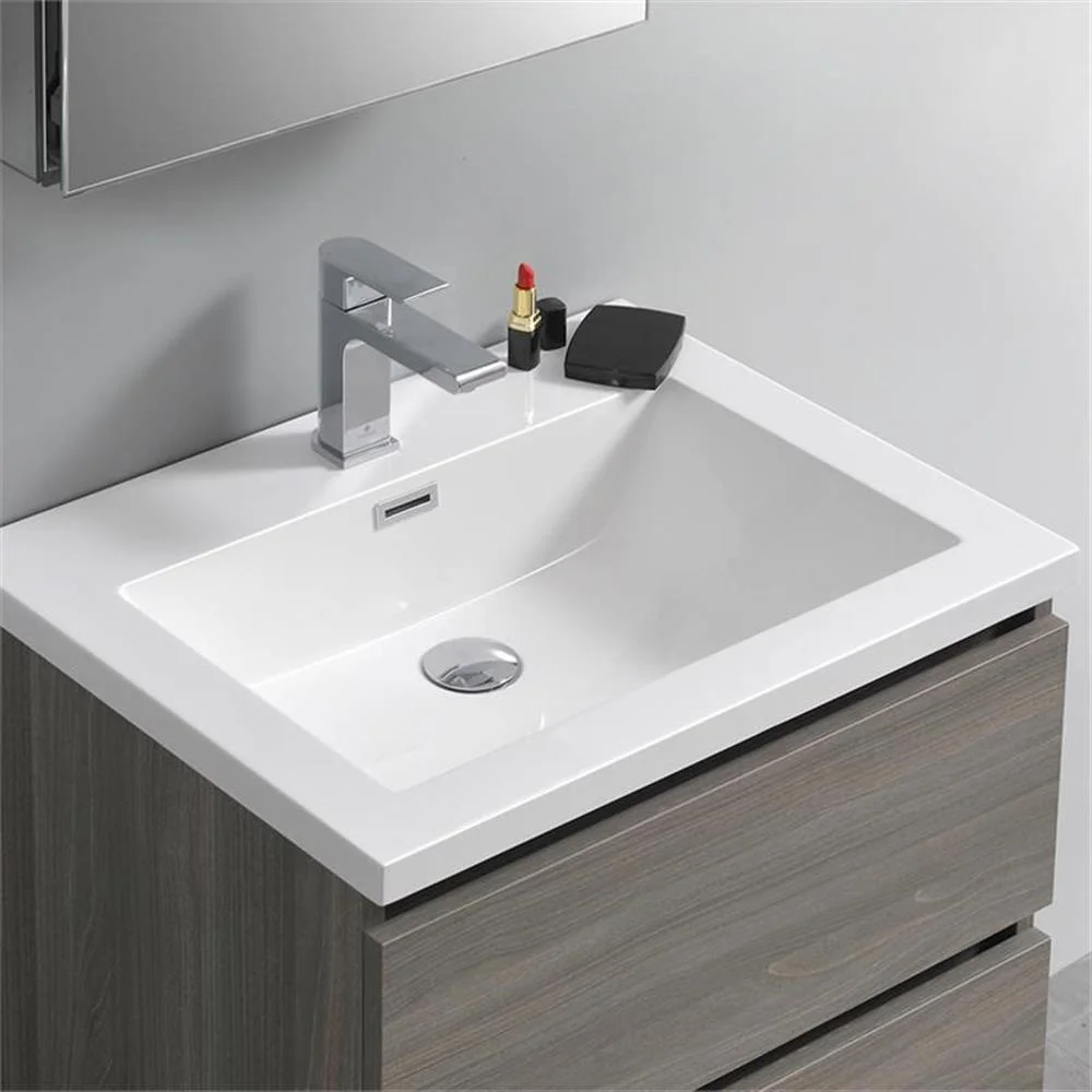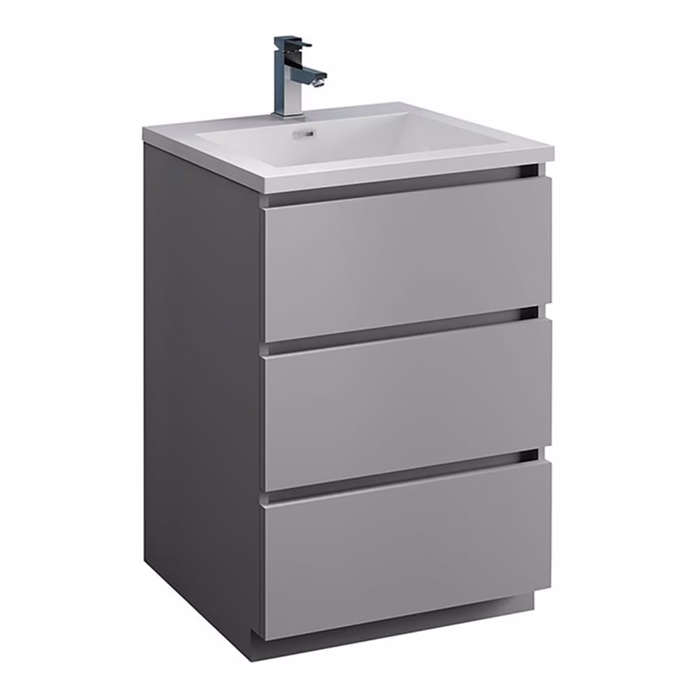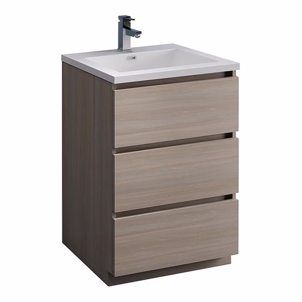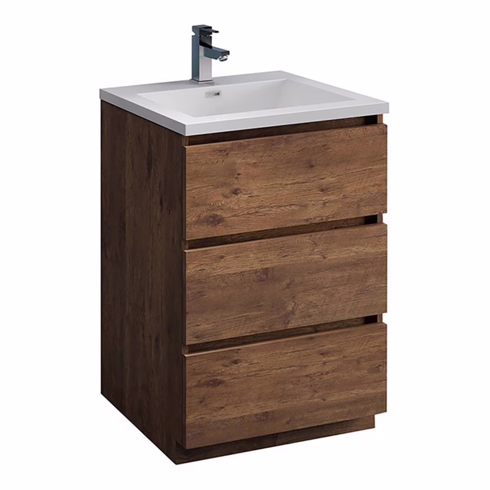 With its chic Rosewood finish, the Fresca Lazzaro Freestanding Modern Bathroom Cabinet with Integrated Sink is the ideal combination of style and function. The cabinet offers great storage with soft-closing drawers, just perfect for organizing all of your daily essentials. The drawers feature push-release hardware, offering a streamlined front that beautifully complements the minimalist design. Gracing the top of the cabinet is an eye-catching white acrylic-resin countertop/sink with smooth edges and integrated overflow. The sink has been pre-drilled to accommodate a single hole faucet (sold separately). This modern cabinet with integrated sink will enhance any décor and is available in multiple sizes and finishes. It includes installation hardware.
