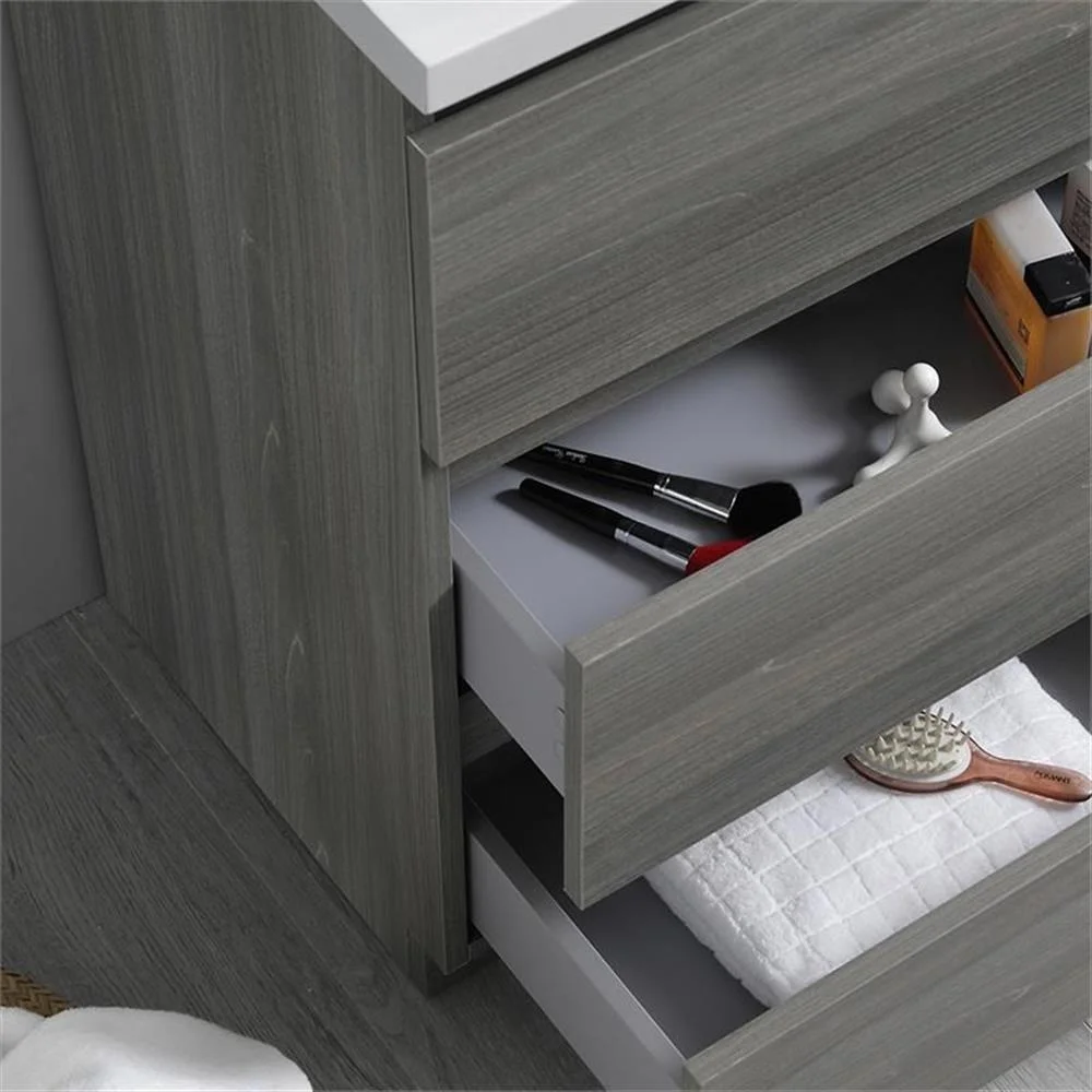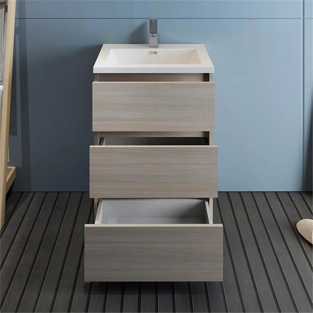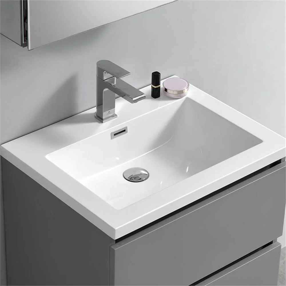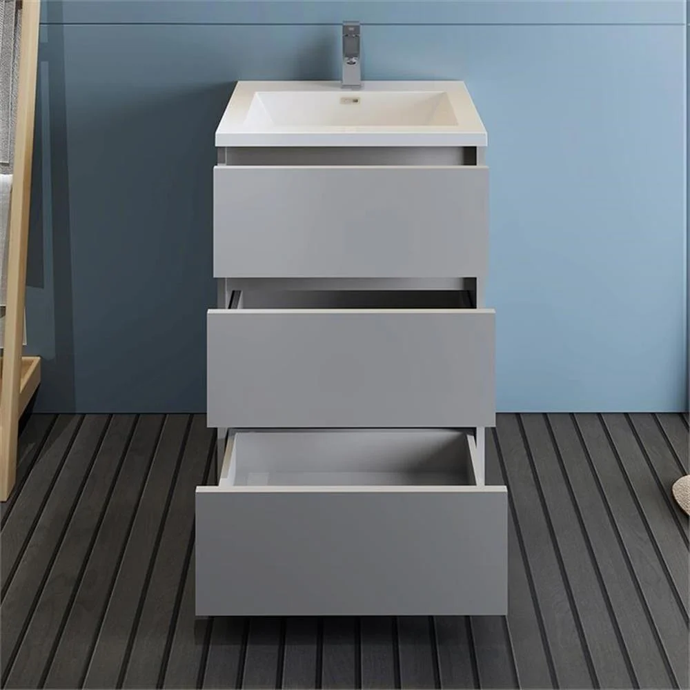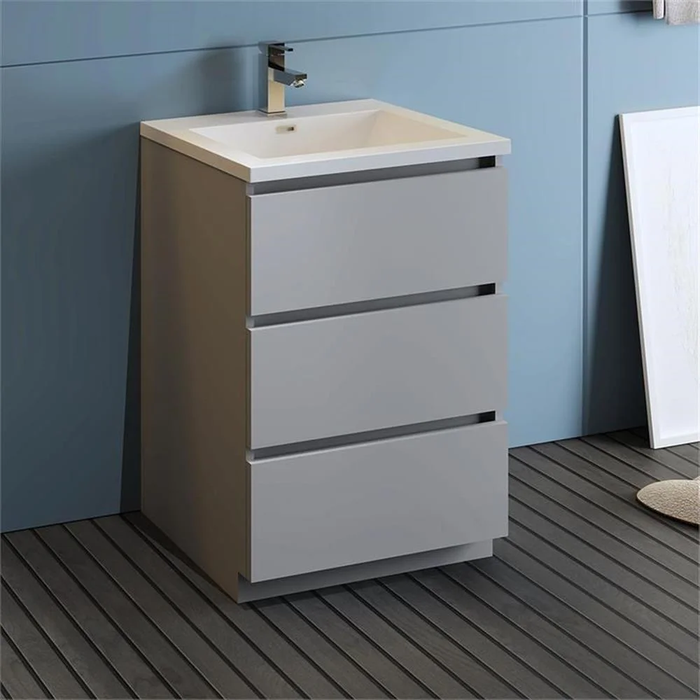 With its chic Rosewood finish, the Fresca Lazzaro Freestanding Modern Bathroom Cabinet with Integrated Sink is the ideal combination of style and function. The cabinet offers great storage with soft-closing drawers, just perfect for organizing all of your daily essentials. The drawers feature push-release hardware, offering a streamlined front that beautifully complements the minimalist design. Gracing the top of the cabinet is an eye-catching white acrylic-resin countertop/sink with smooth edges and integrated overflow. The sink has been pre-drilled to accommodate a single hole faucet (sold separately). This modern cabinet with integrated sink will enhance any décor and is available in multiple sizes and finishes. It includes installation hardware.
