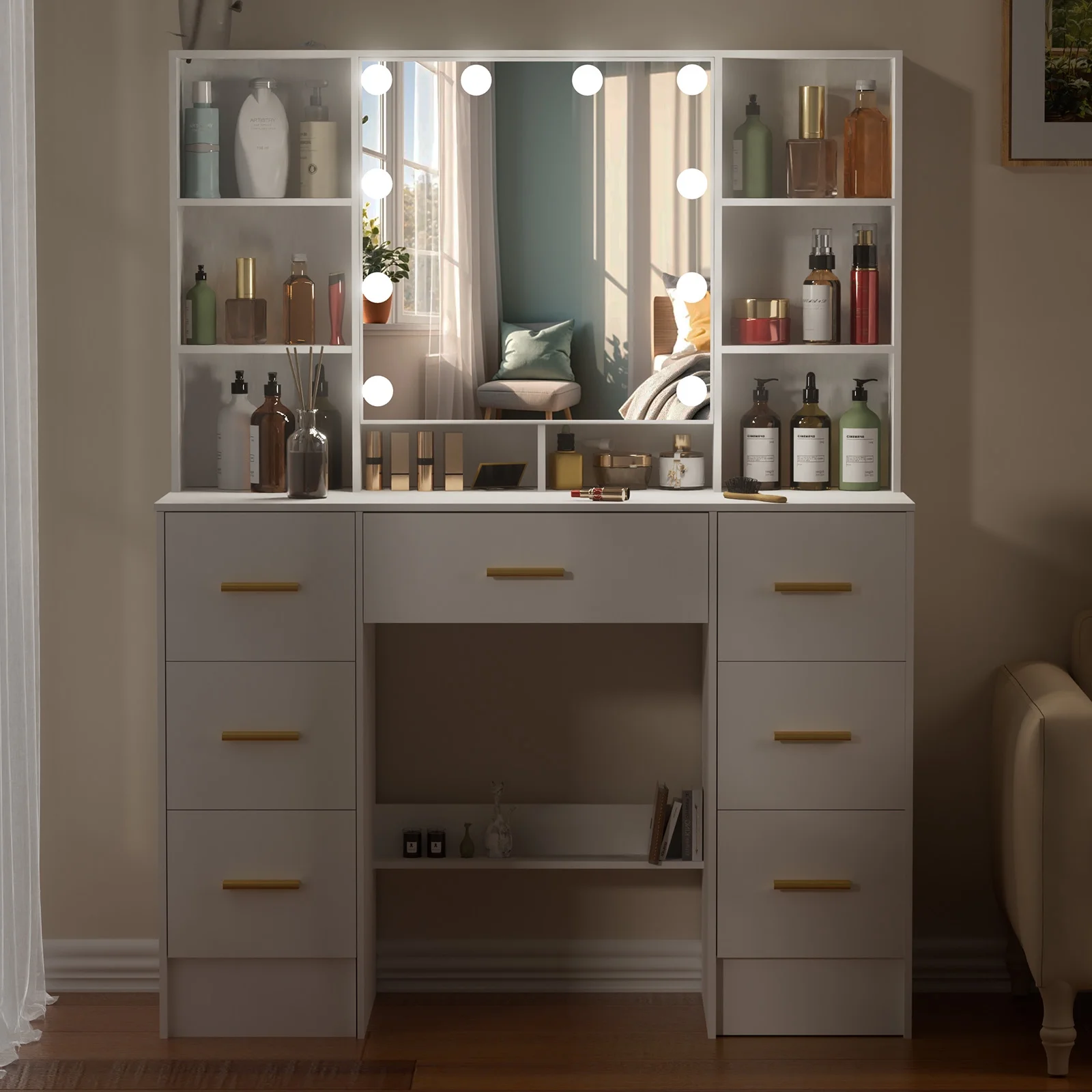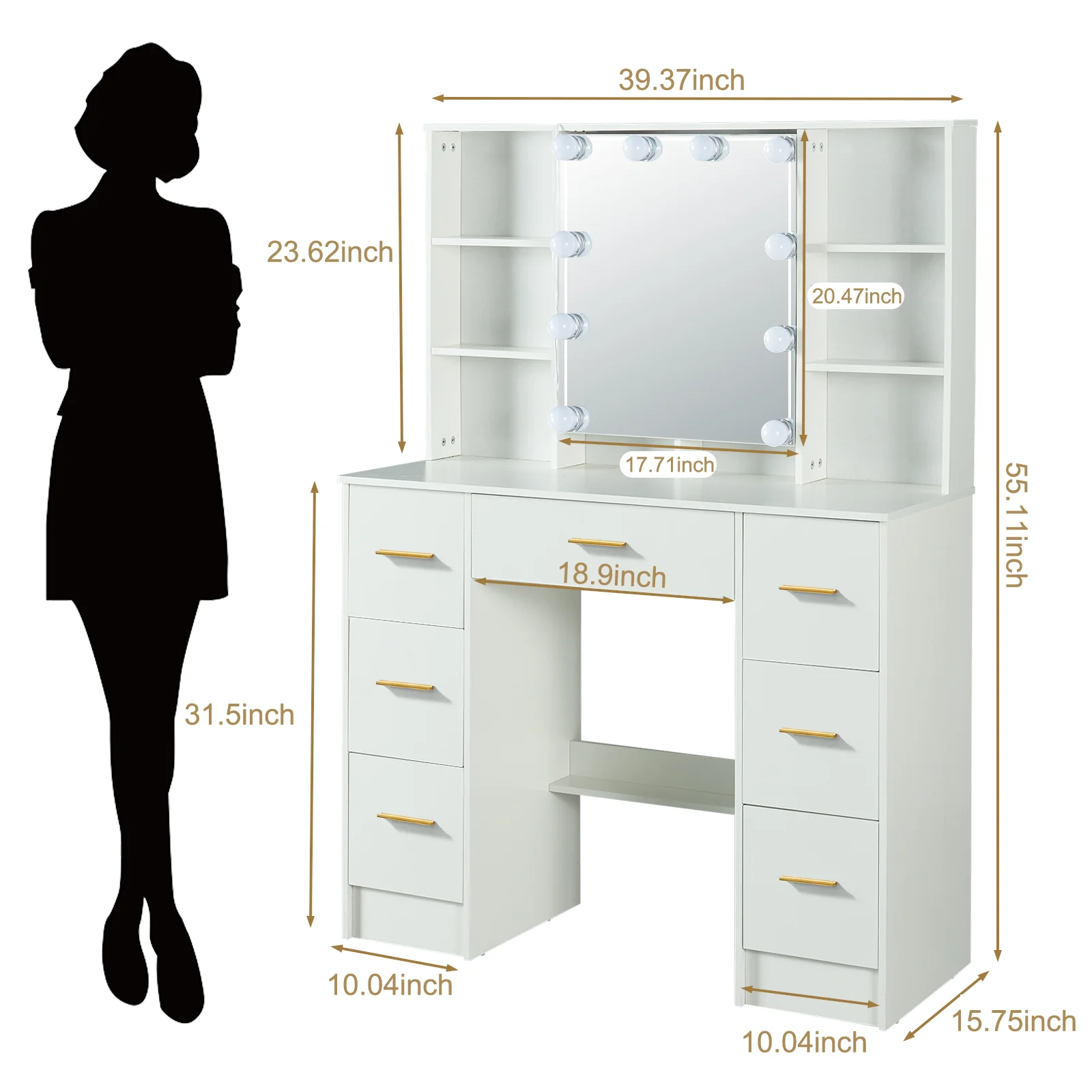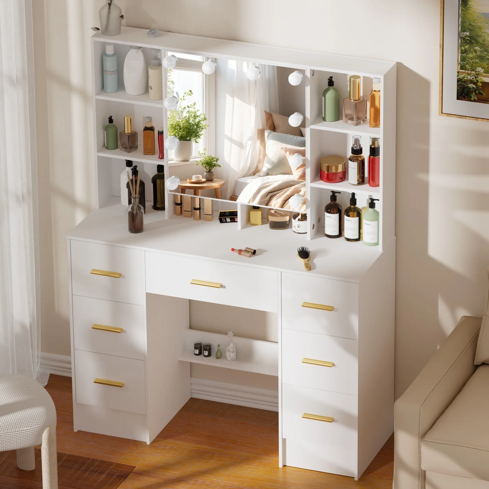Enhance your daily beauty routine with our makeup vanity. This white vanity desk is equipped with adjustable LED lights, allowing you to customize the brightness and color temperature to create the perfect lighting for your makeup application. The spacious tabletop provides plenty of room for all your cosmetics and beauty essentials, while the 7 big drawers offer ample storage space to keep everything organized and within reach. The sliding mirror features storage racks on both sides, making it easy to access and store your favorite products. The sleek white design adds a touch of elegance to any bedroom or dressing area. In addition to its use as a vanity table, this versatile desk can also be used as a study desk or workspace.