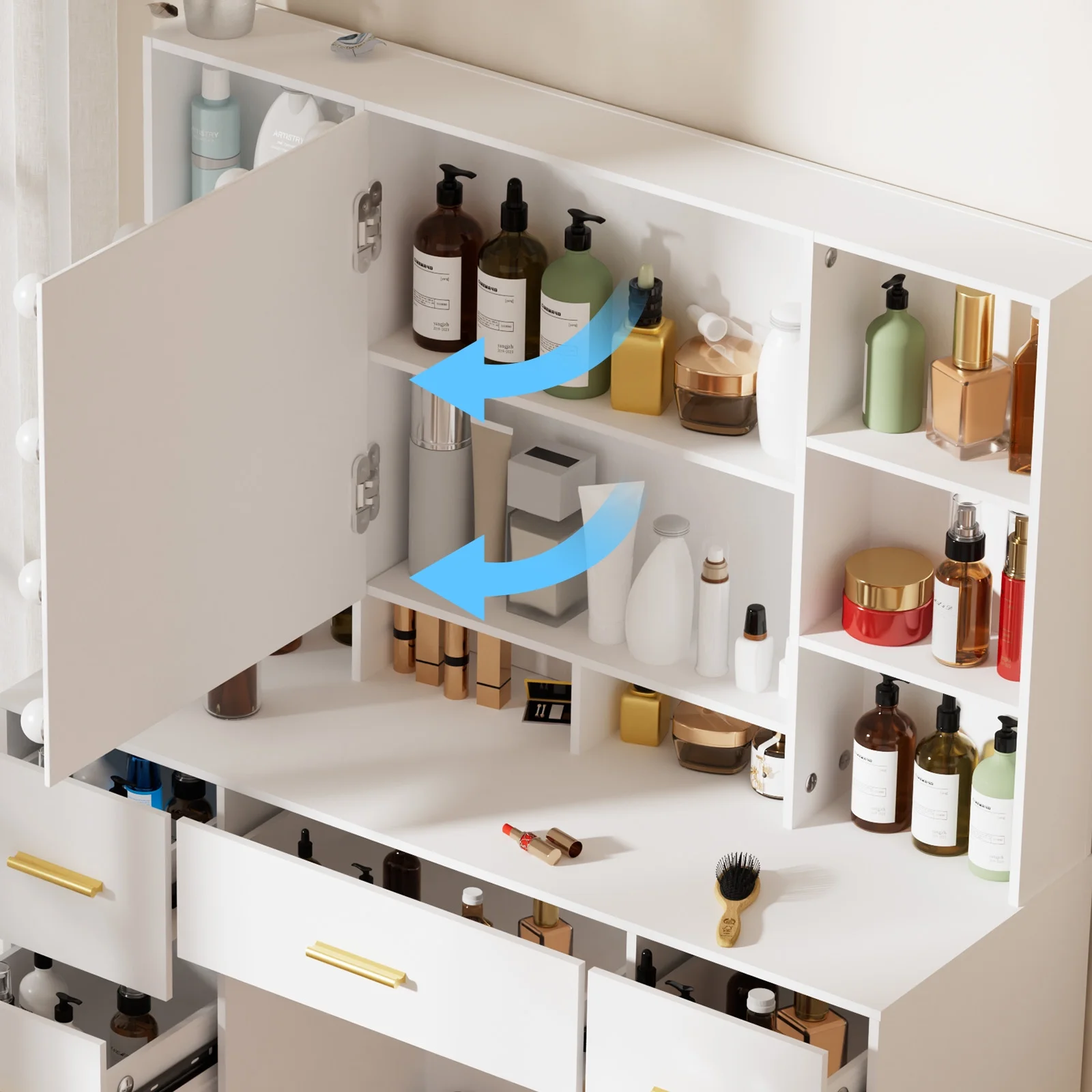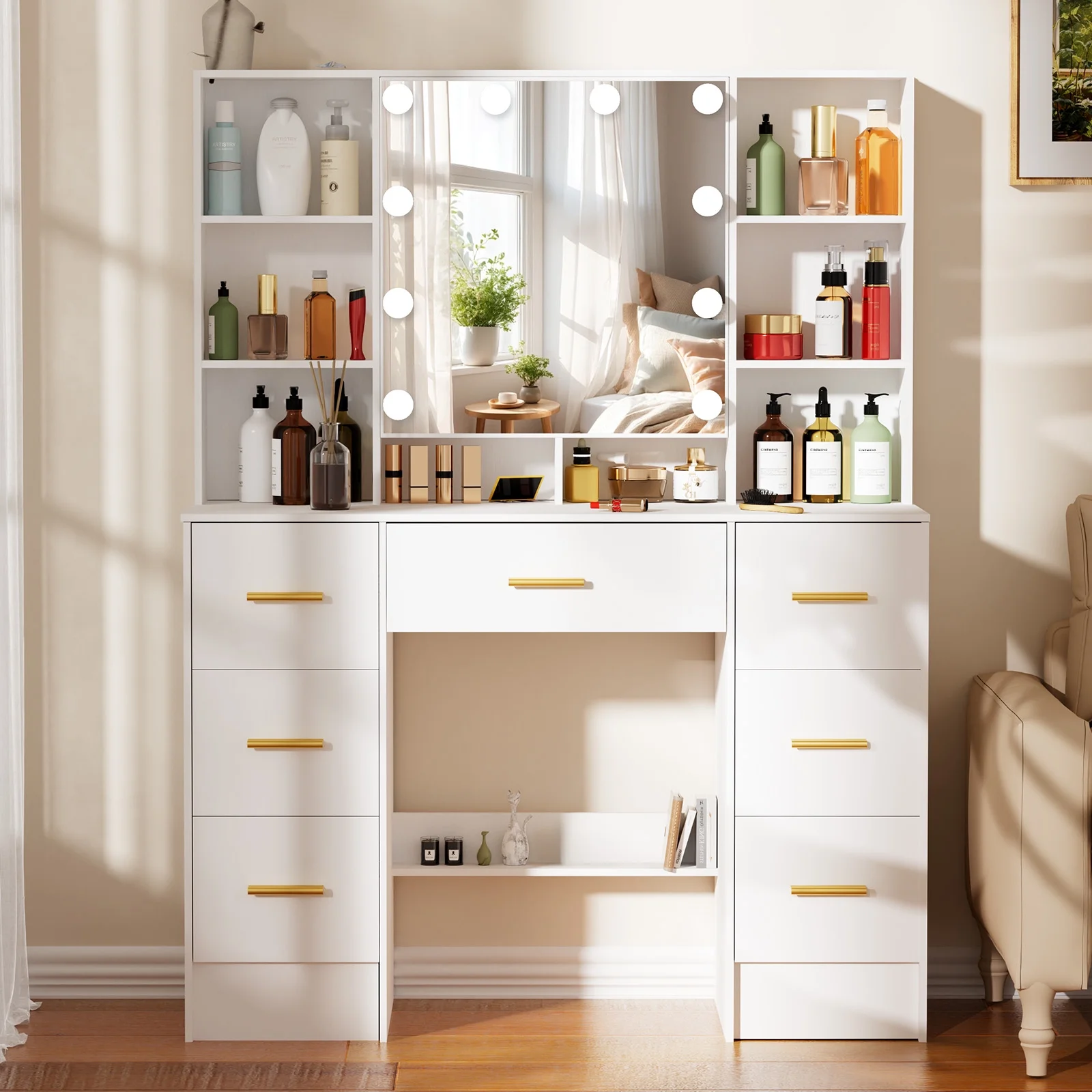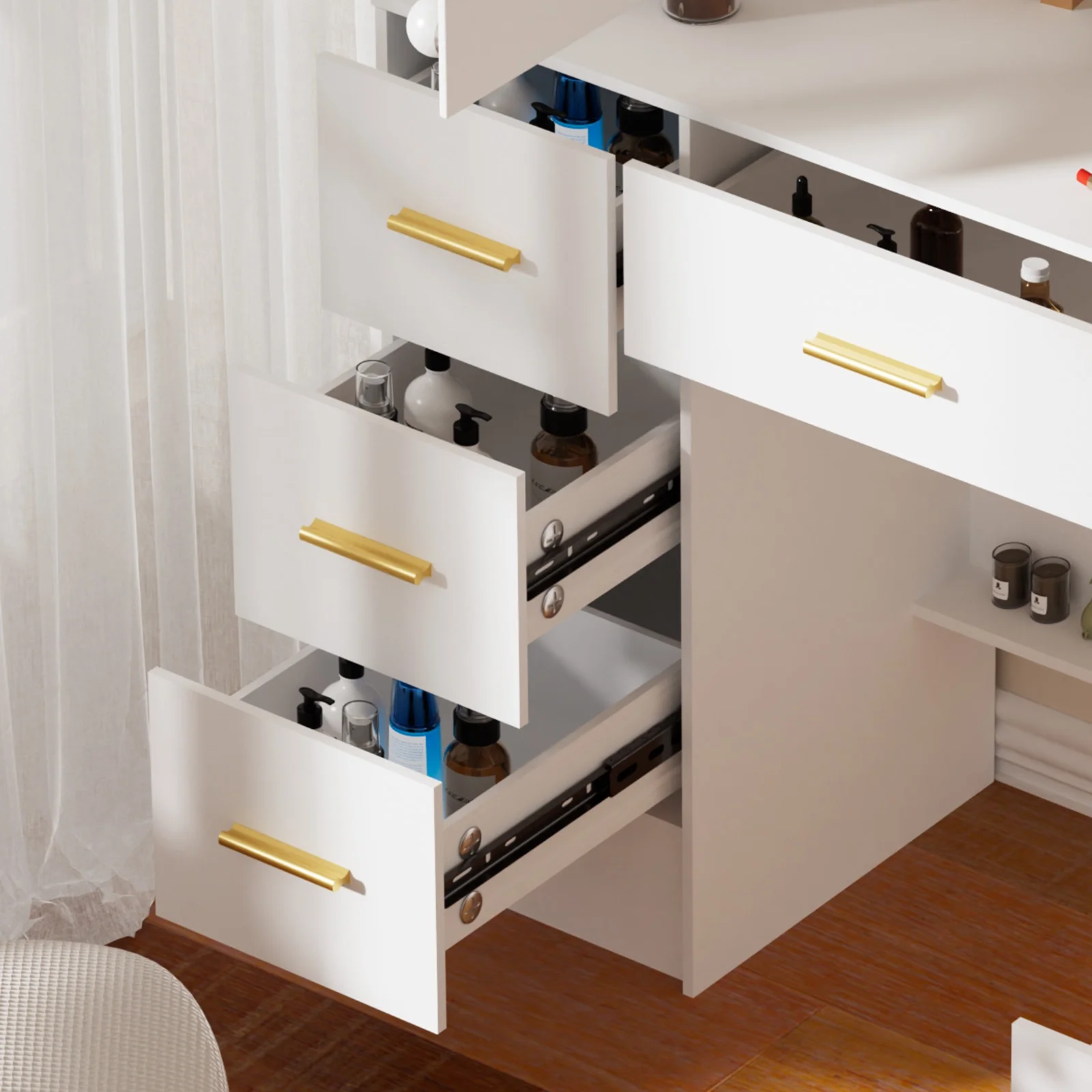 Enhance your daily beauty routine with our makeup vanity. This white vanity desk is equipped with adjustable LED lights, allowing you to customize the brightness and color temperature to create the perfect lighting for your makeup application. The spacious tabletop provides plenty of room for all your cosmetics and beauty essentials, while the 7 big drawers offer ample storage space to keep everything organized and within reach. The sliding mirror features storage racks on both sides, making it easy to access and store your favorite products. The sleek white design adds a touch of elegance to any bedroom or dressing area. In addition to its use as a vanity table, this versatile desk can also be used as a study desk or workspace.