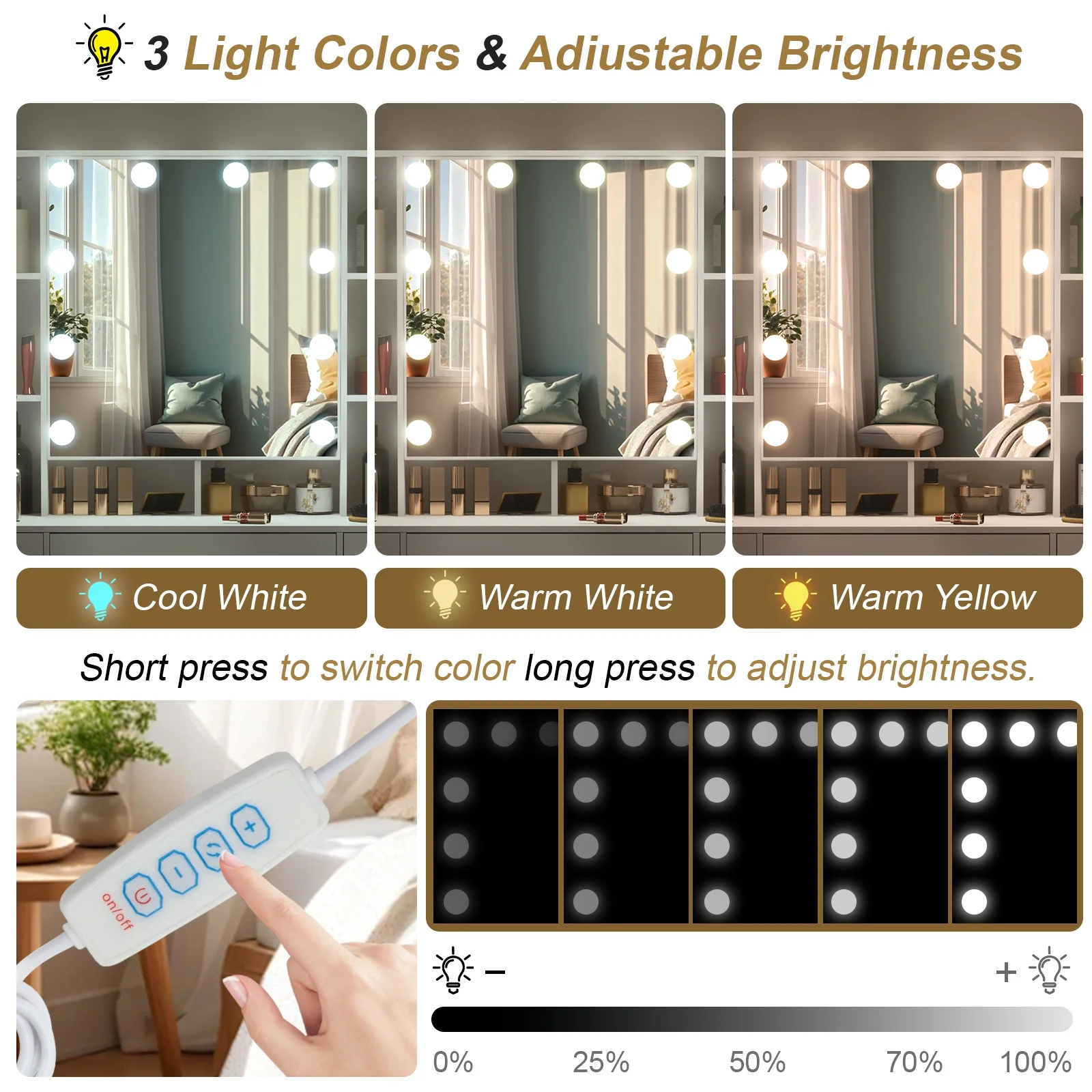 - 10 energy-saving bulbs with adjustable brightness and 3 modes (warm yellow/white, cool white) for flawless makeup in any light.