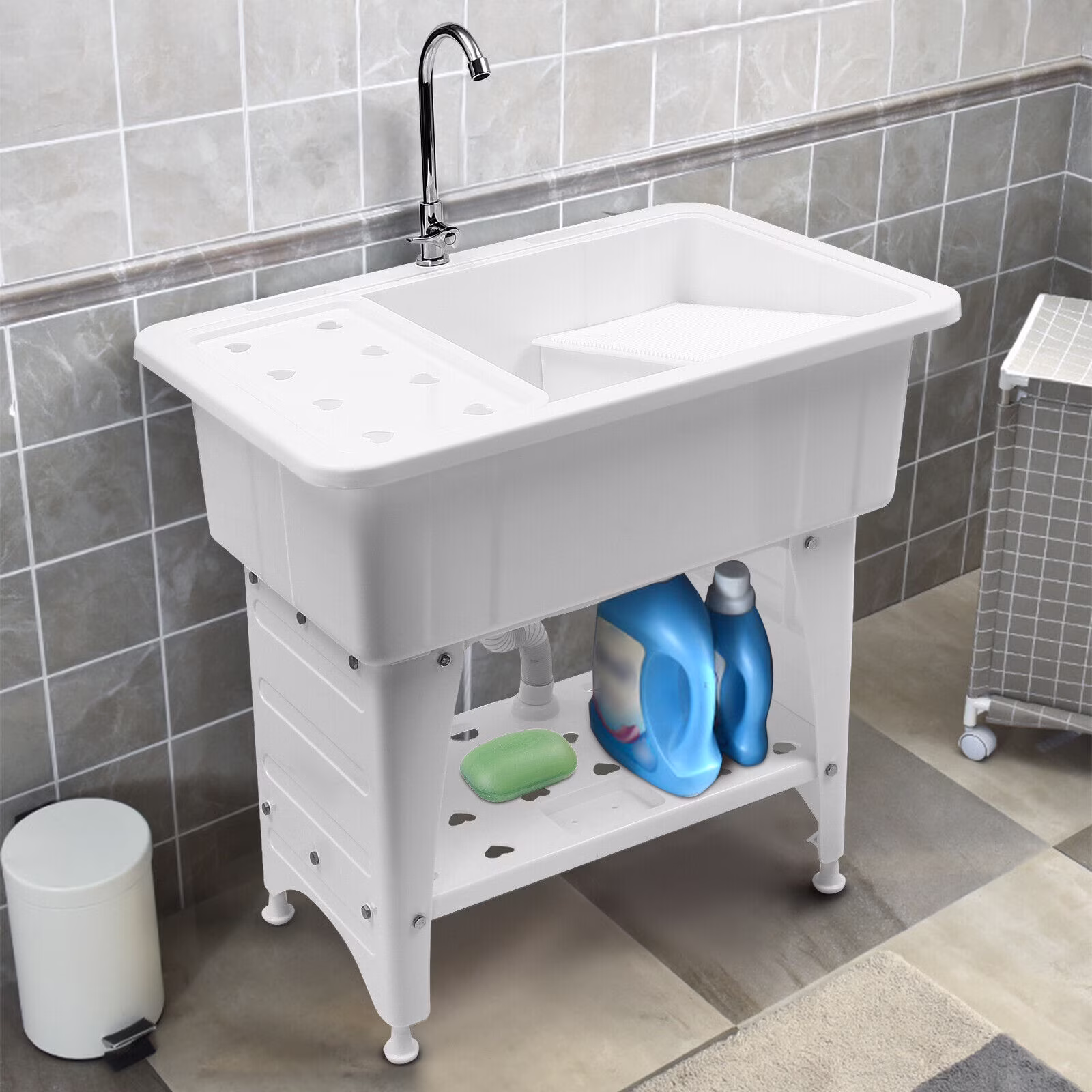 Made of High-quality Pp, This Laundry Sink Is Sturdy and Durable, with Strong Load-bearing Capacity and Stability. the Versatile White Color Appearance and Smooth Lines Can Fit Well with Various Home Decor Styles. the Non-drilling and Hand-screwing Design Makes Installation Easier, and Its Large Sink Size Provides You with Enough Cleaning Space. with This Product, You Can Do Laundry While Standing, Avoiding the Strain of Bending over for Long Periods.