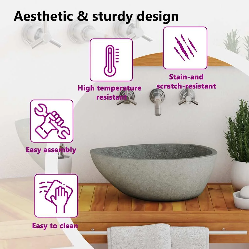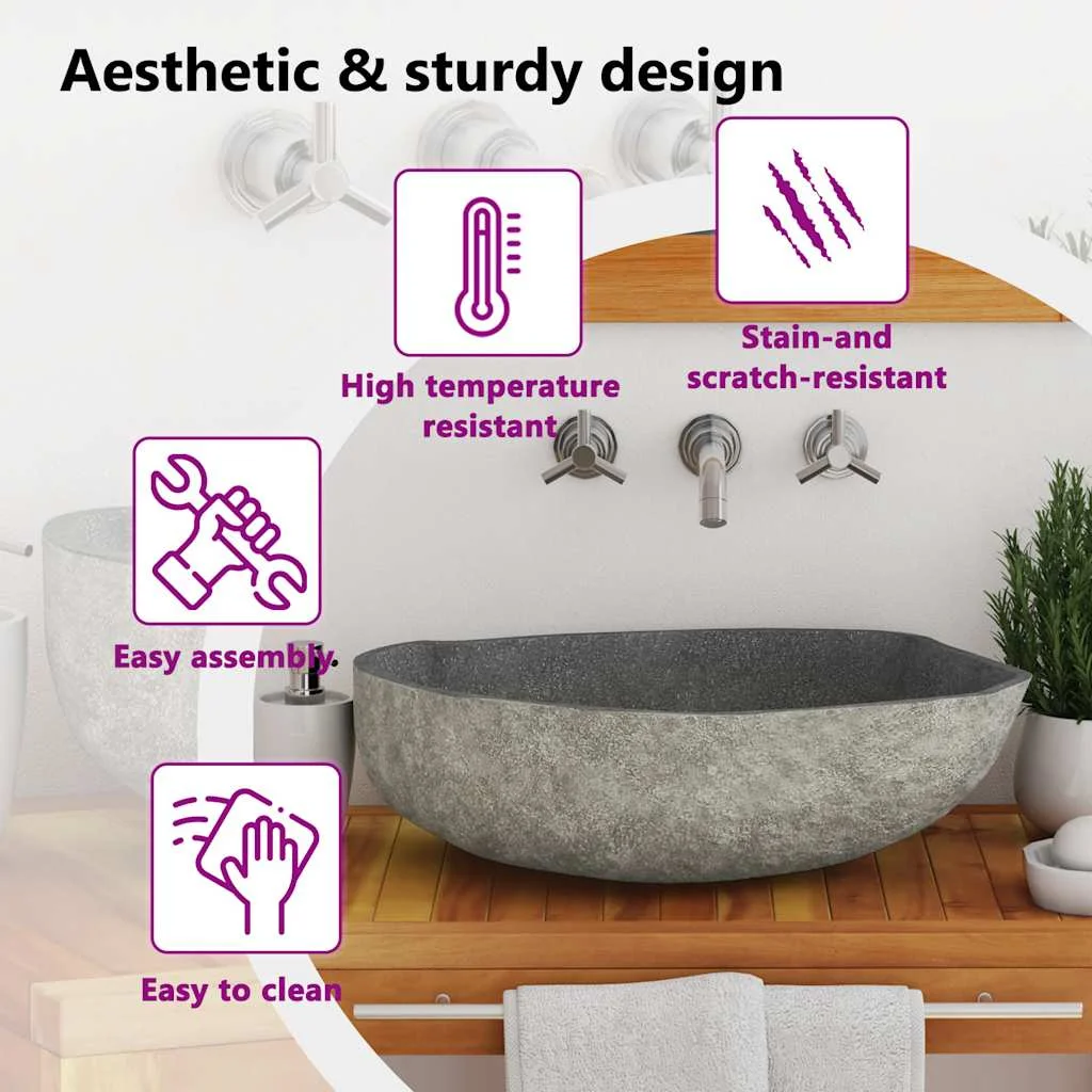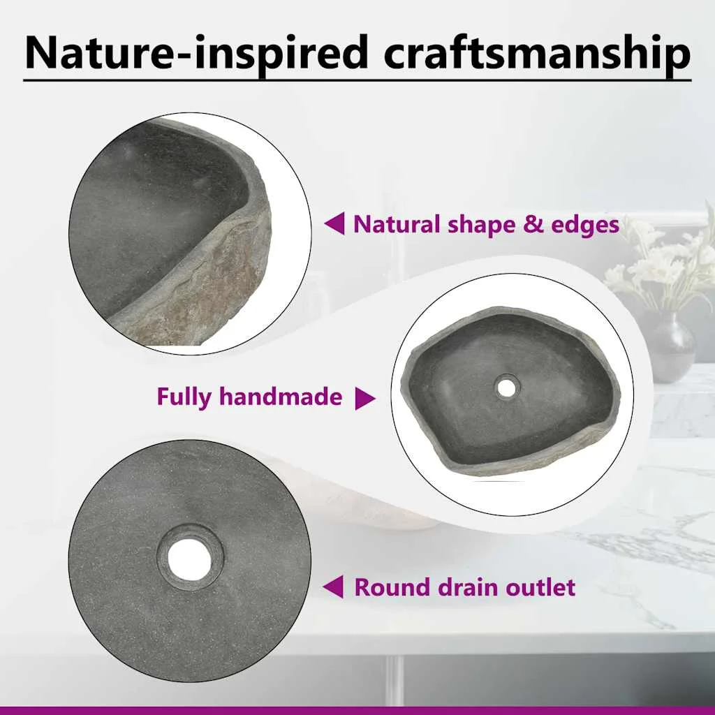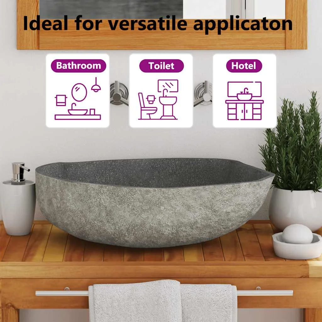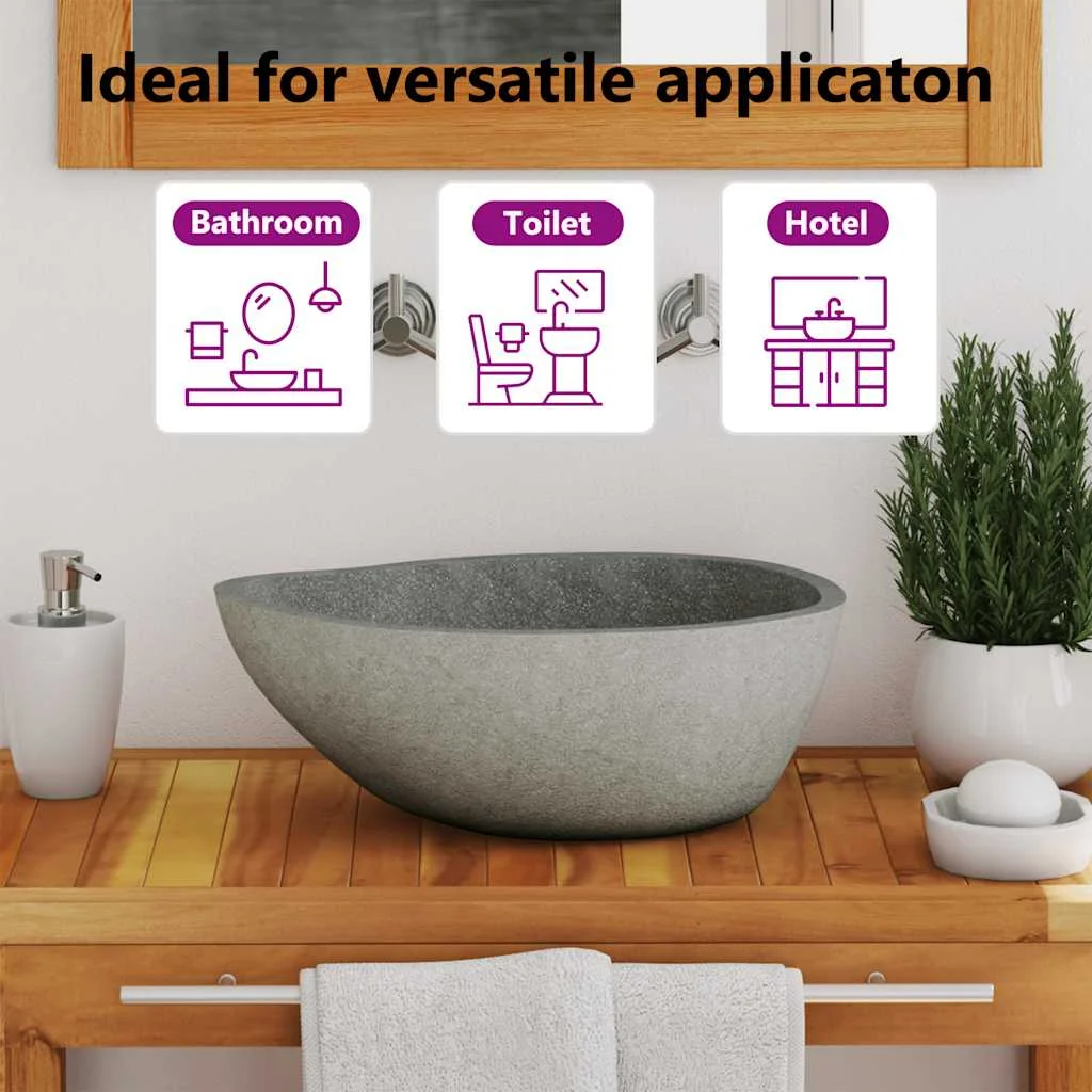 This oval-shaped wash basin, made of natural river stone, will make a stylish addition to any bathroom or washroom.