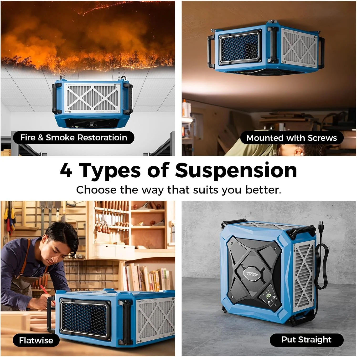 - Accessibility: Timer cycle controller, you can set fan to shut down automatically in 1-9 hours. �� IR remote system: There is no wireless interference, and the anti-interference ability is strong. �� With a hook and chain: Puricare 1080IG air filtration system is easy to move and can be hung from the ceiling in the shop or placed on a workbench.