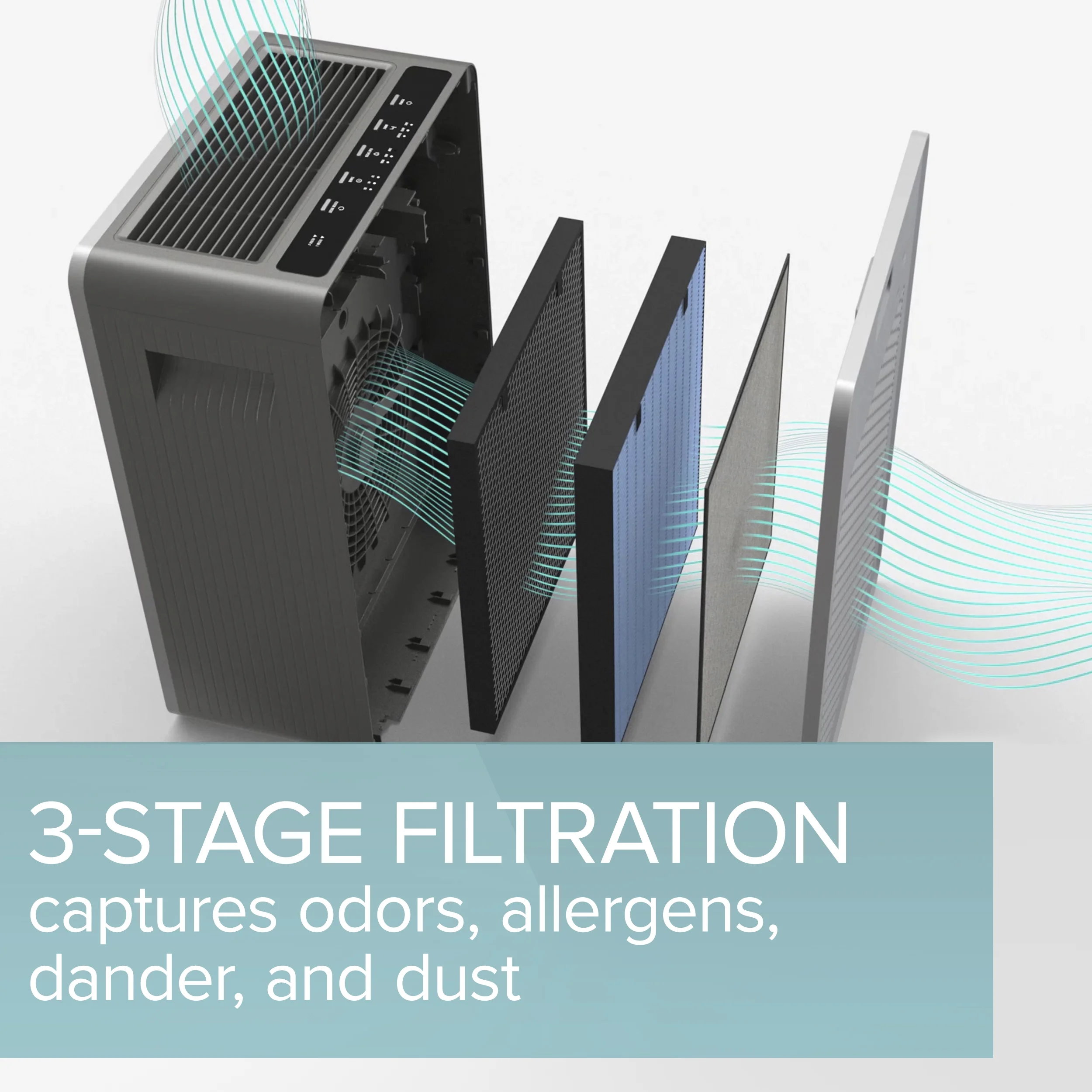 - 3 �C STAGE FILTRATION system includes a pre-filter, a 1�� thick activated carbon filter, and a High Efficiency Filter which captures 99.7% of microscopic particles on silent mode including dust, pollen, smoke, and pet dander. Great for homes with pets, babies, or young children. Most ideal for those who suffer from seasonal or non-seasonal allergies or those who just want fresh, clean air in their home.