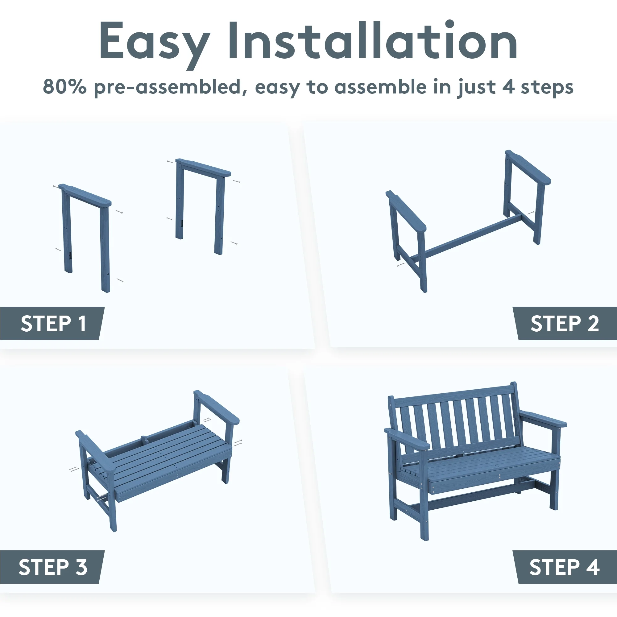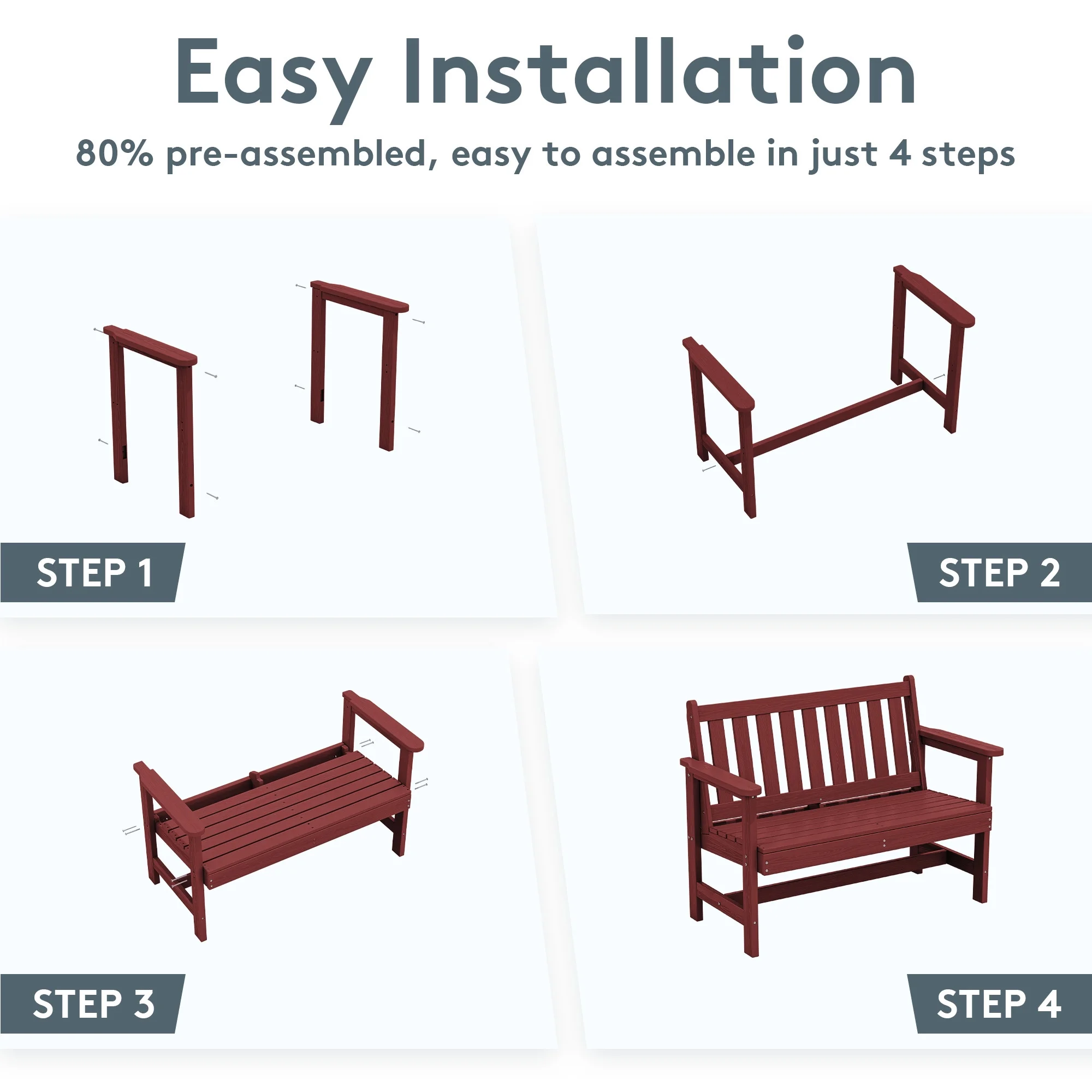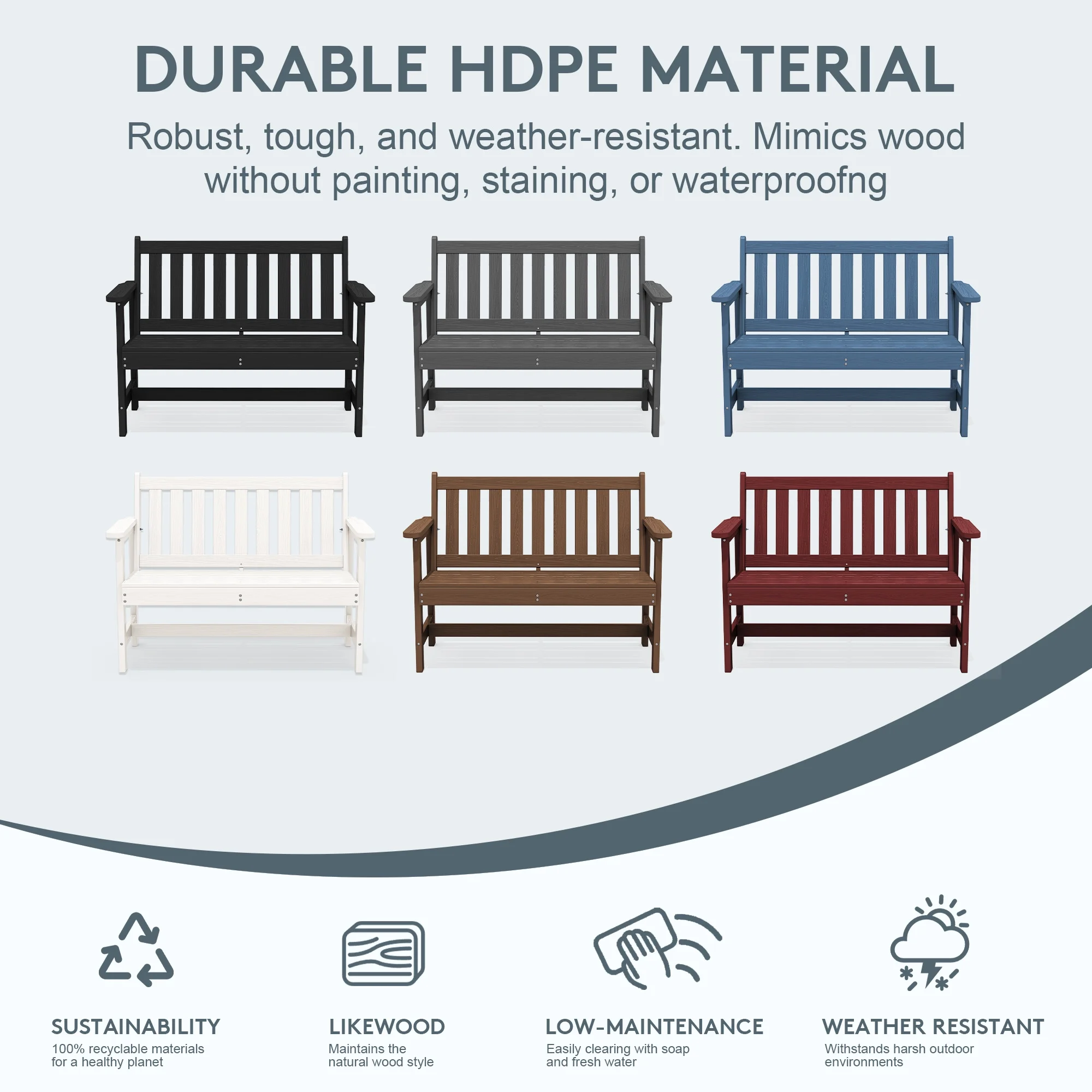 - 【Low Maintenance】The HDPE material of the bench is easy to clean with just a wipe or rinse, requiring minimal upkeep.