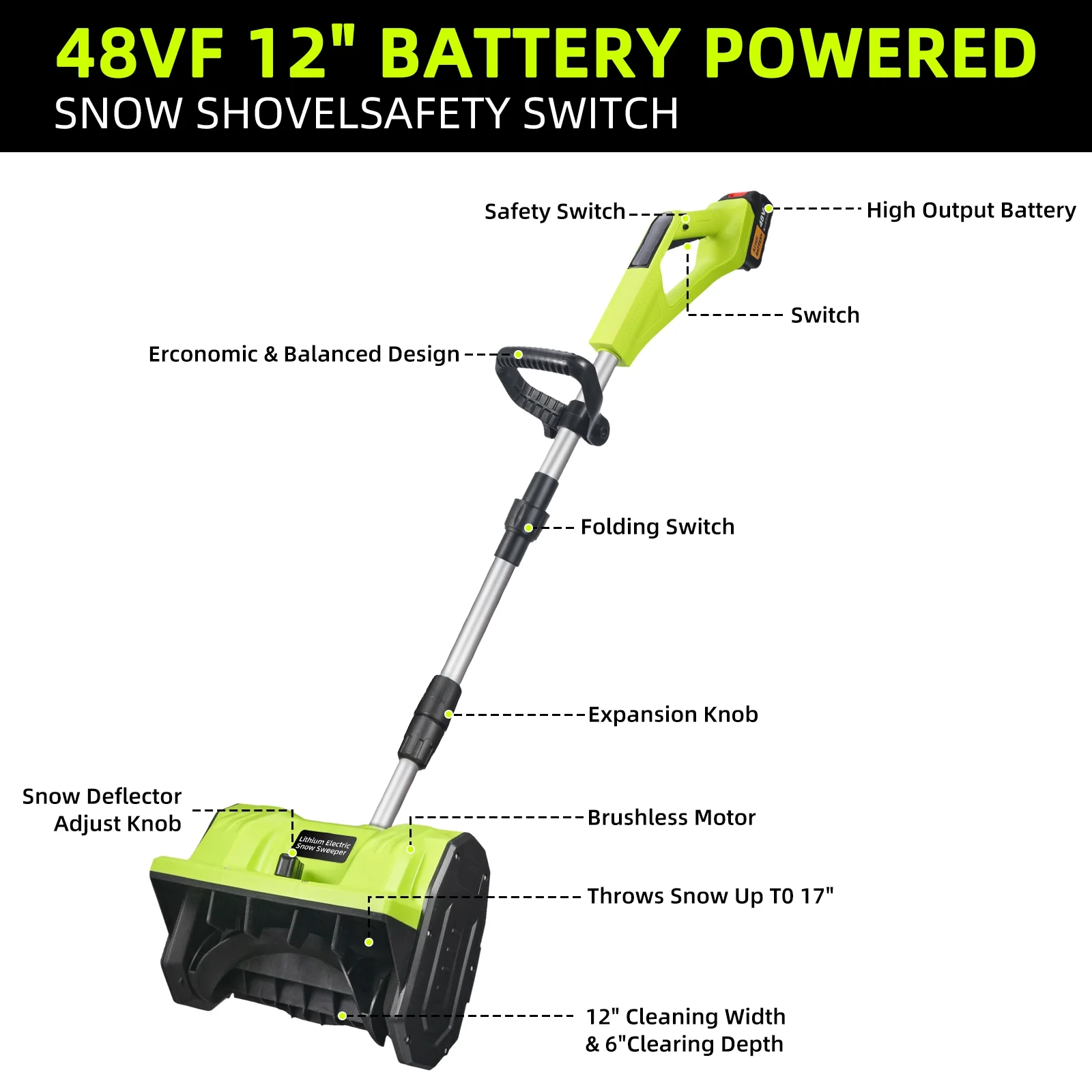 This electric snow shovel features a no-load speed ranging from 0 to 33000r/min, allowing for quick and effective snow removal. The drum length of 280mm ensures wide coverage, while the power supply of a 20-volt 3.0Ah lithium-ion battery offers reliable and long-lasting performance. With a cleaning width of 12 inches and a cleaning path of 12 inches wide and 5 inches deep, you can efficiently clear snow from your desired area. The throw distance of 25 feet enables you to move the snow away from your property with ease.