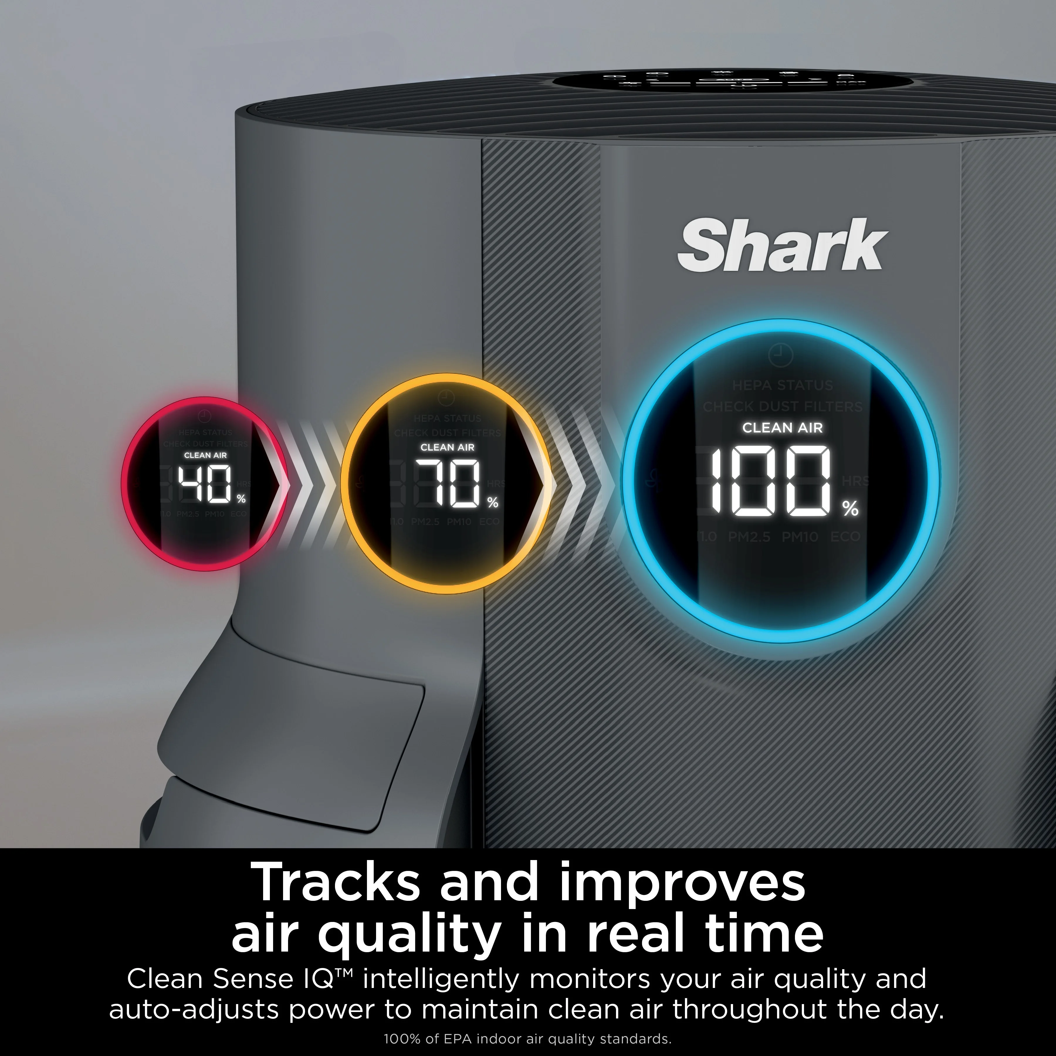 - AUTOMATICALLY ADJUSTS: Clean Sense IQ tracks air quality and constantly adjusts power to maintain clean air in your home. (Measures three particle sizes: PM1, PM2.5, and PM10). Results & updates are displayed in real-time on an LED screen