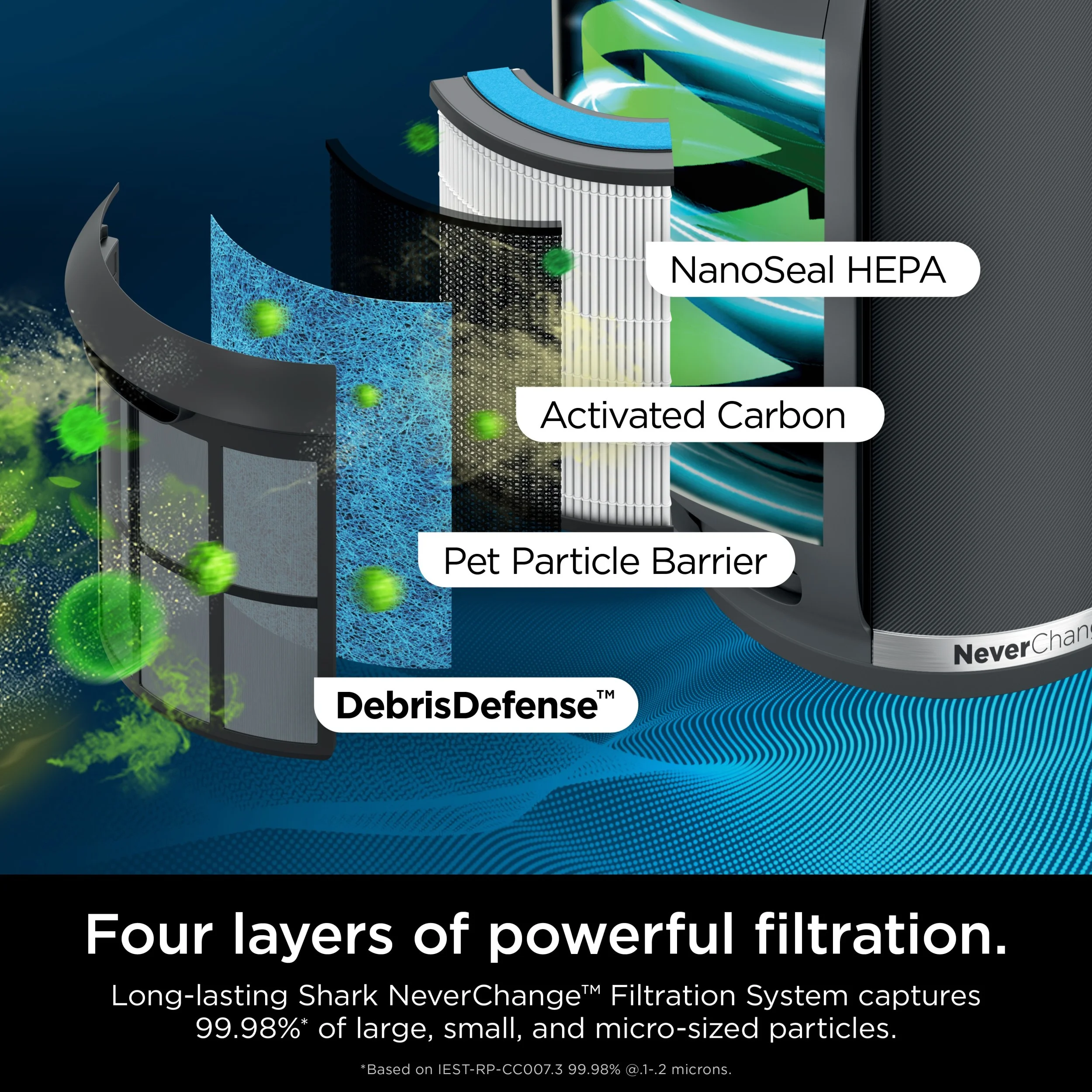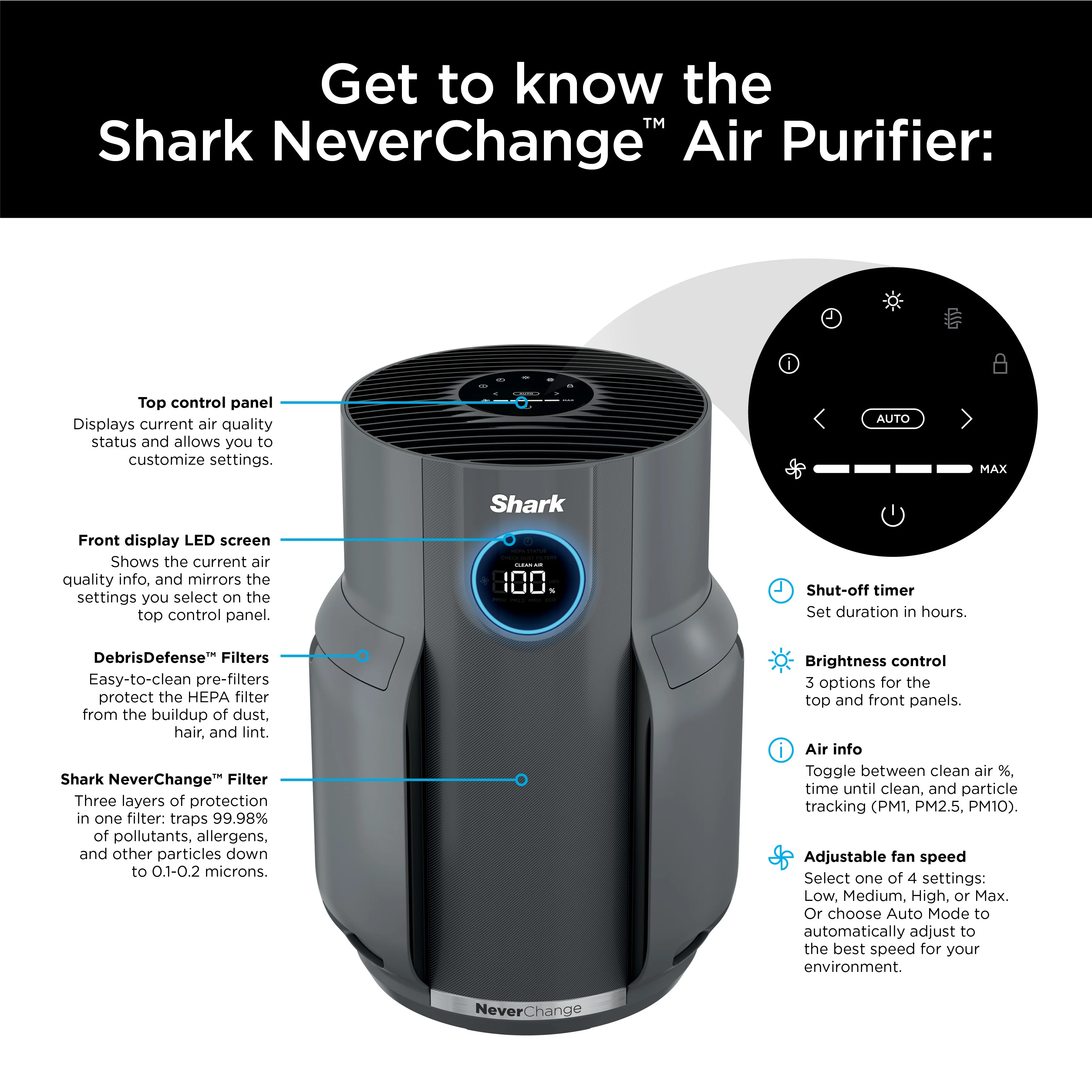 - WHATS INCLUDED: Shark NeverChange Air Purifier, Debris Defense Washable Filter & NeverChange HEPA filter