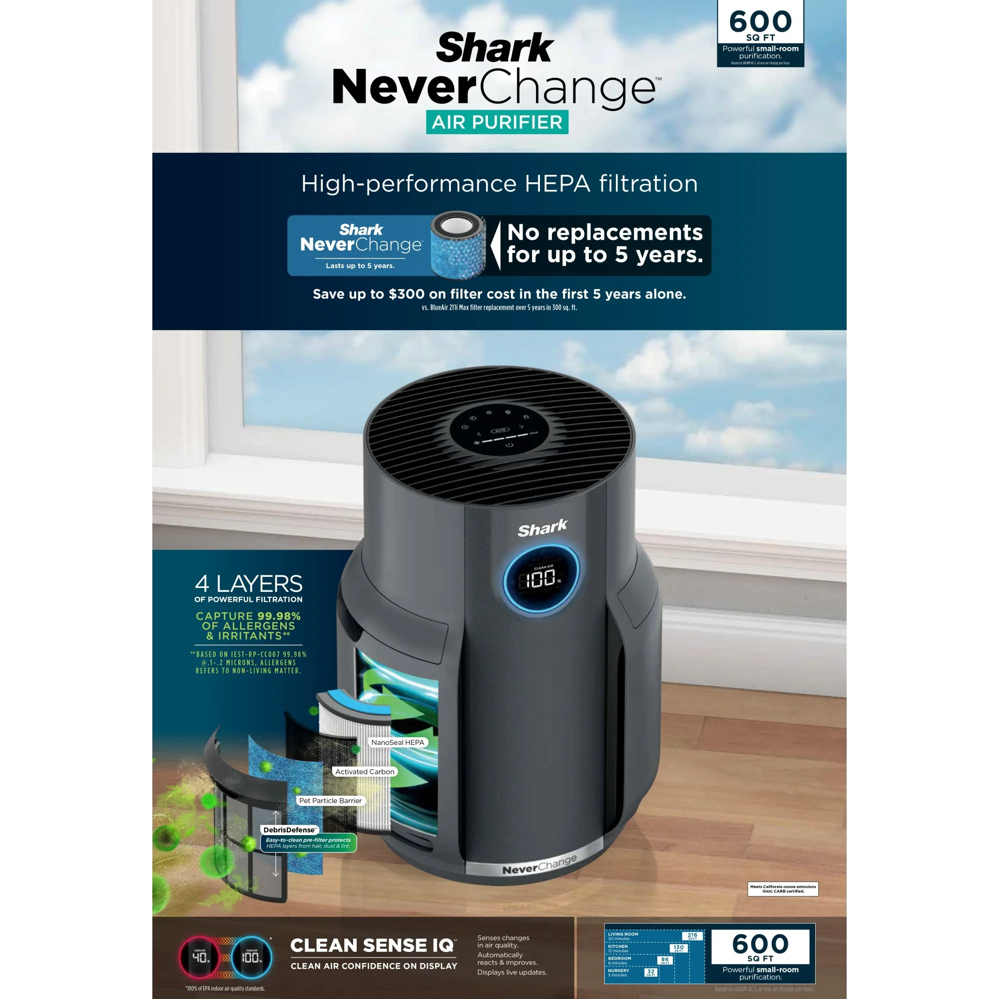 - $300+ IN FILTER REPLACEMENT SAVINGS: With NeverChange filtration, you won��t need replacement filters for up to 5 years. *Vs. cost of replacing filters on a competitor unit over 5-year period in 300 square foot space