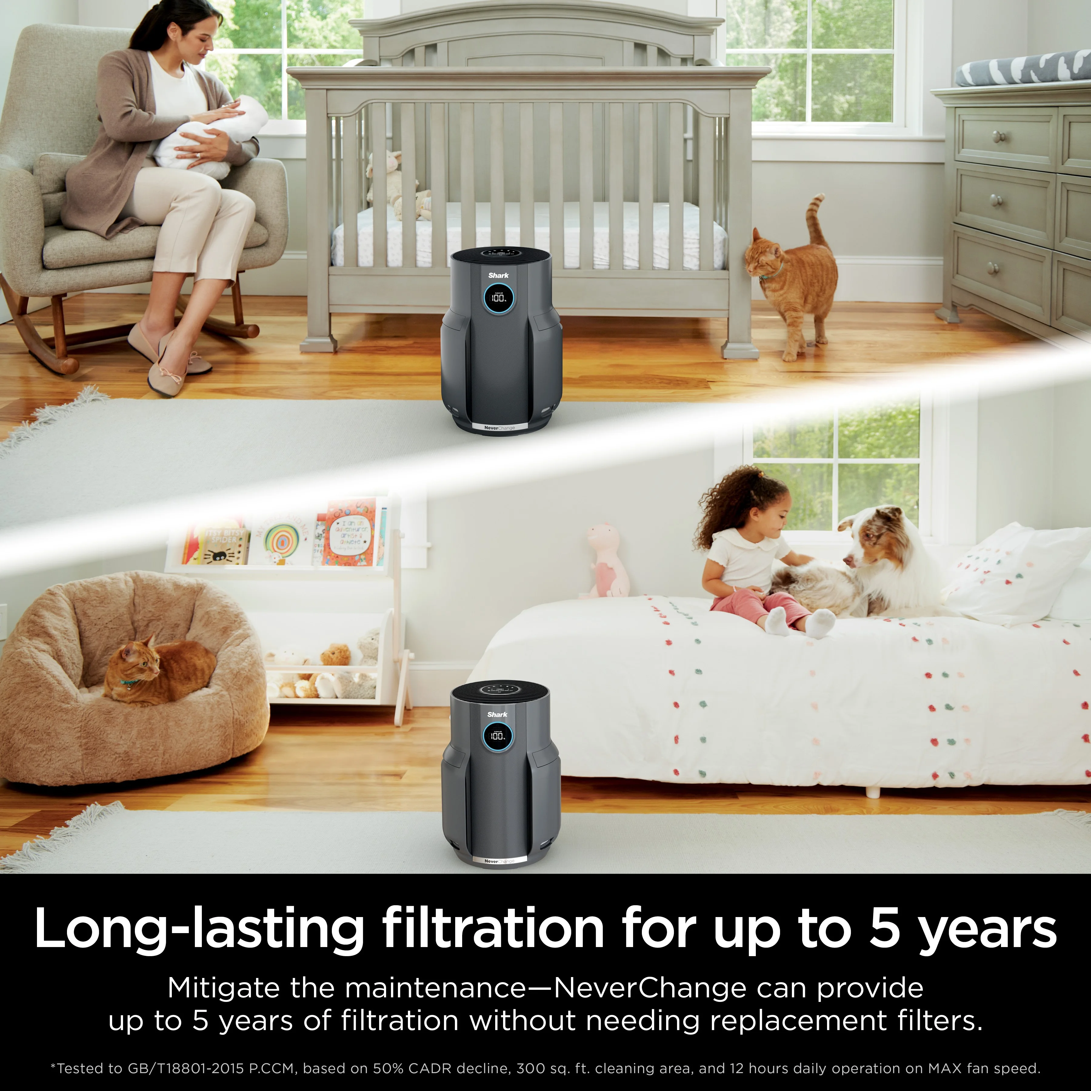 - NEVERCHANGE FILTRATION: HEPA filtration that won��t need replacement*. Debris Defense filter protects HEPA layers ,*for up to 5 years, Tested to GB/T18801-2015 P.CCM, based on 50% CADR declined, 300 SQFT, and 12 hrs daily operation on MAX fan speed