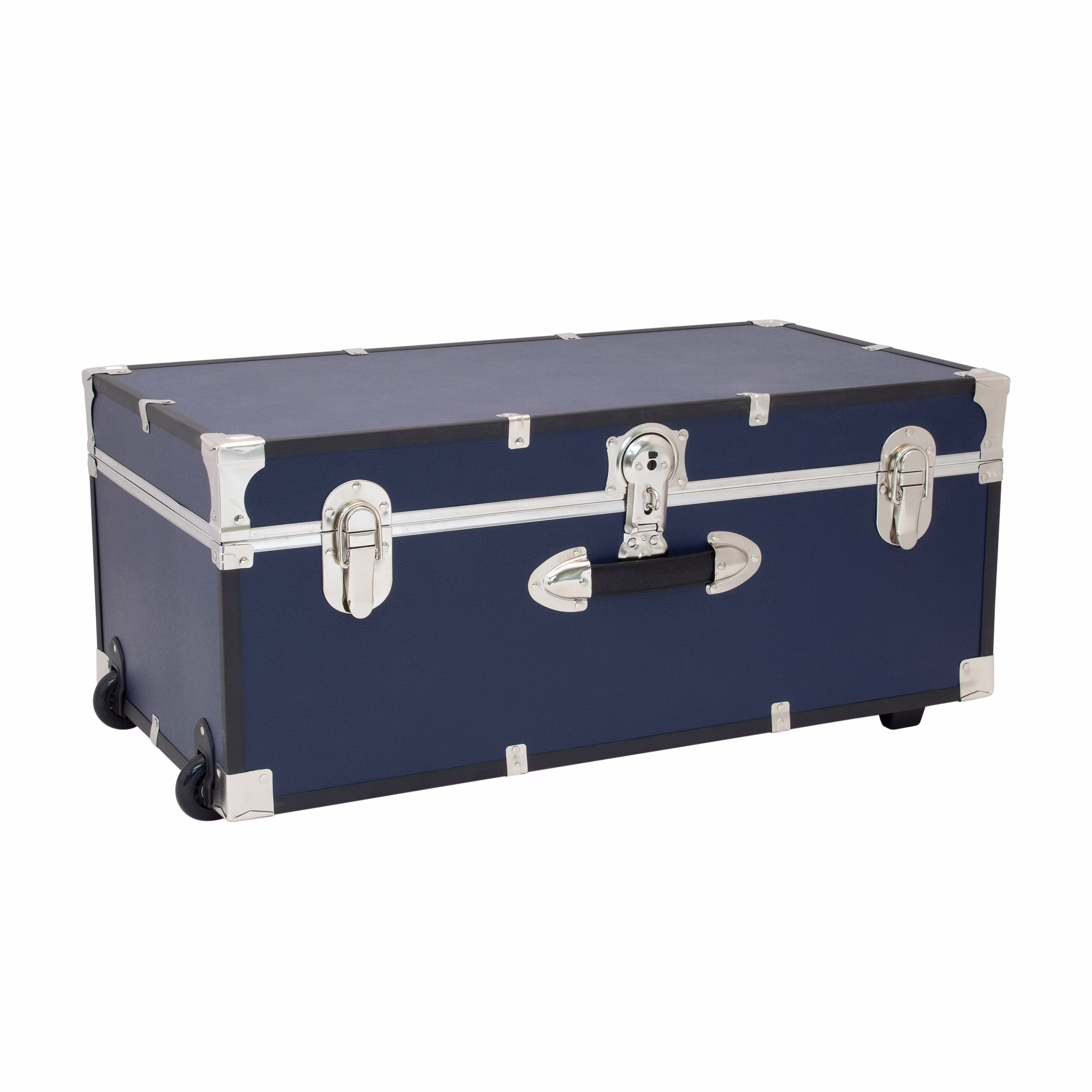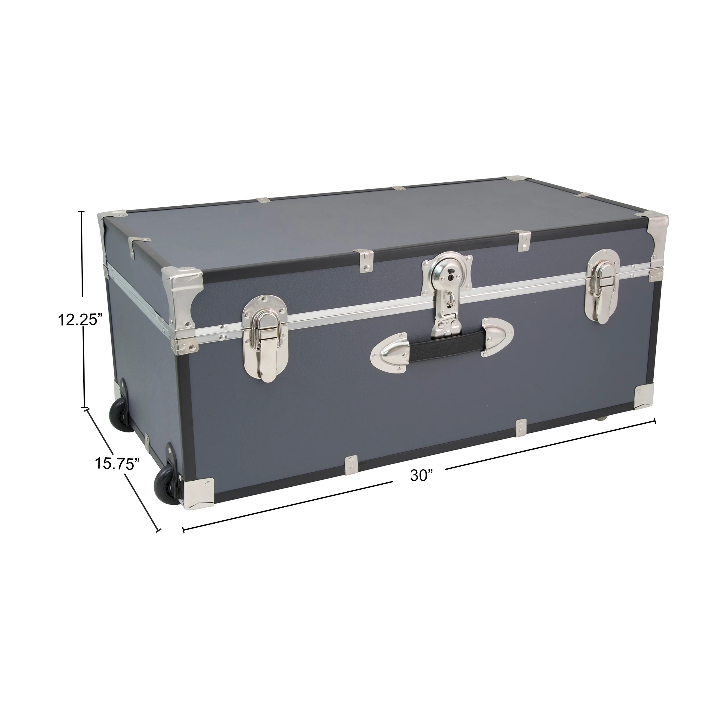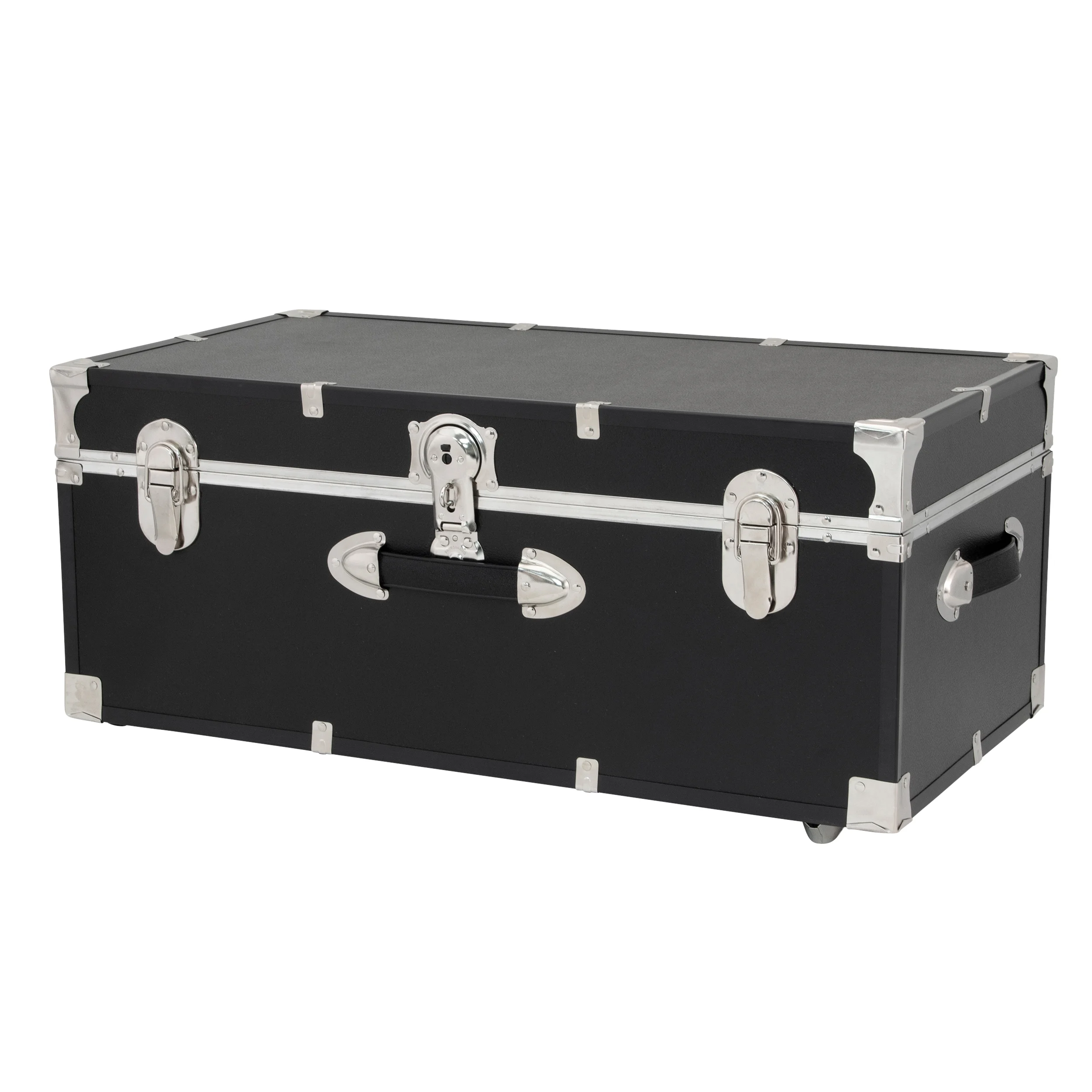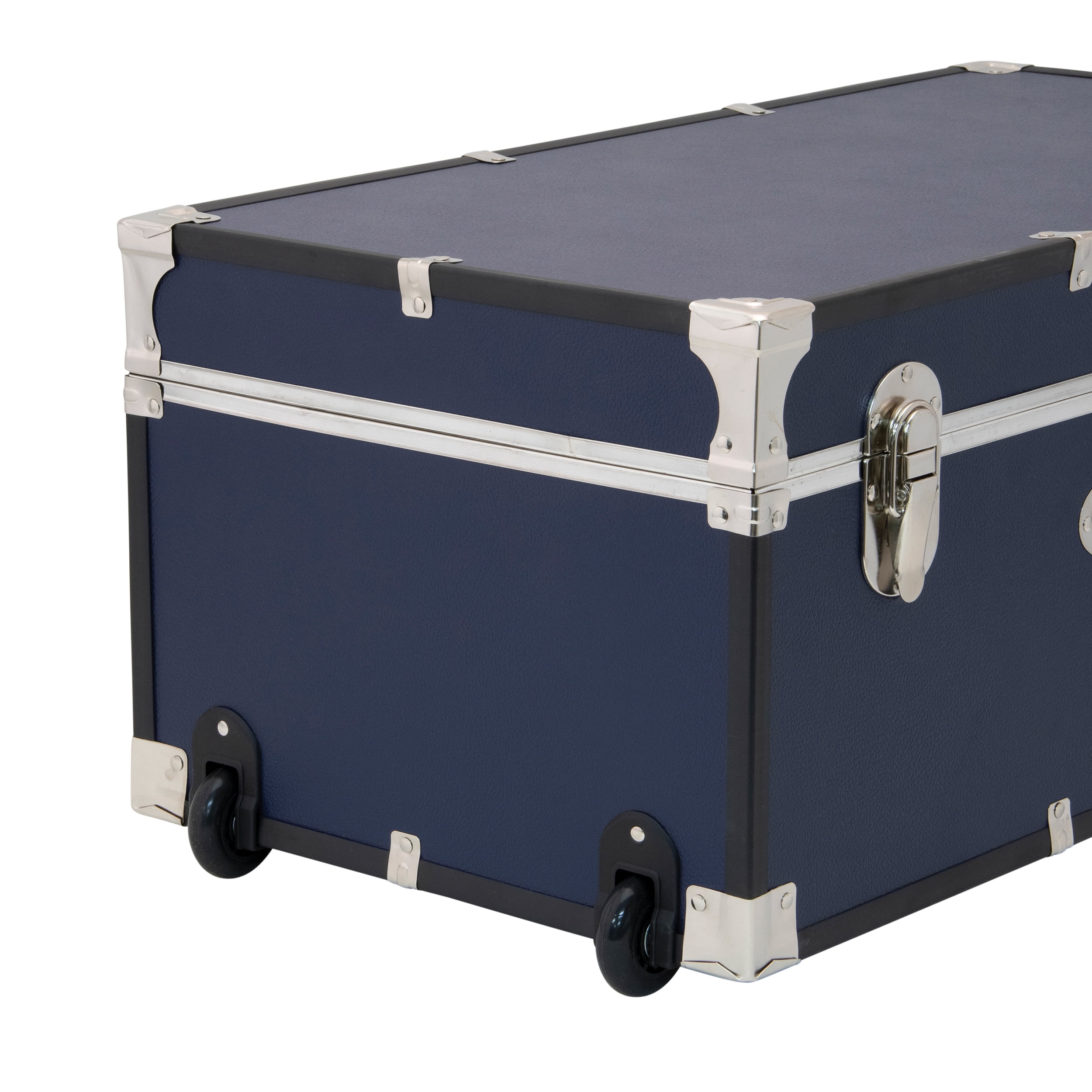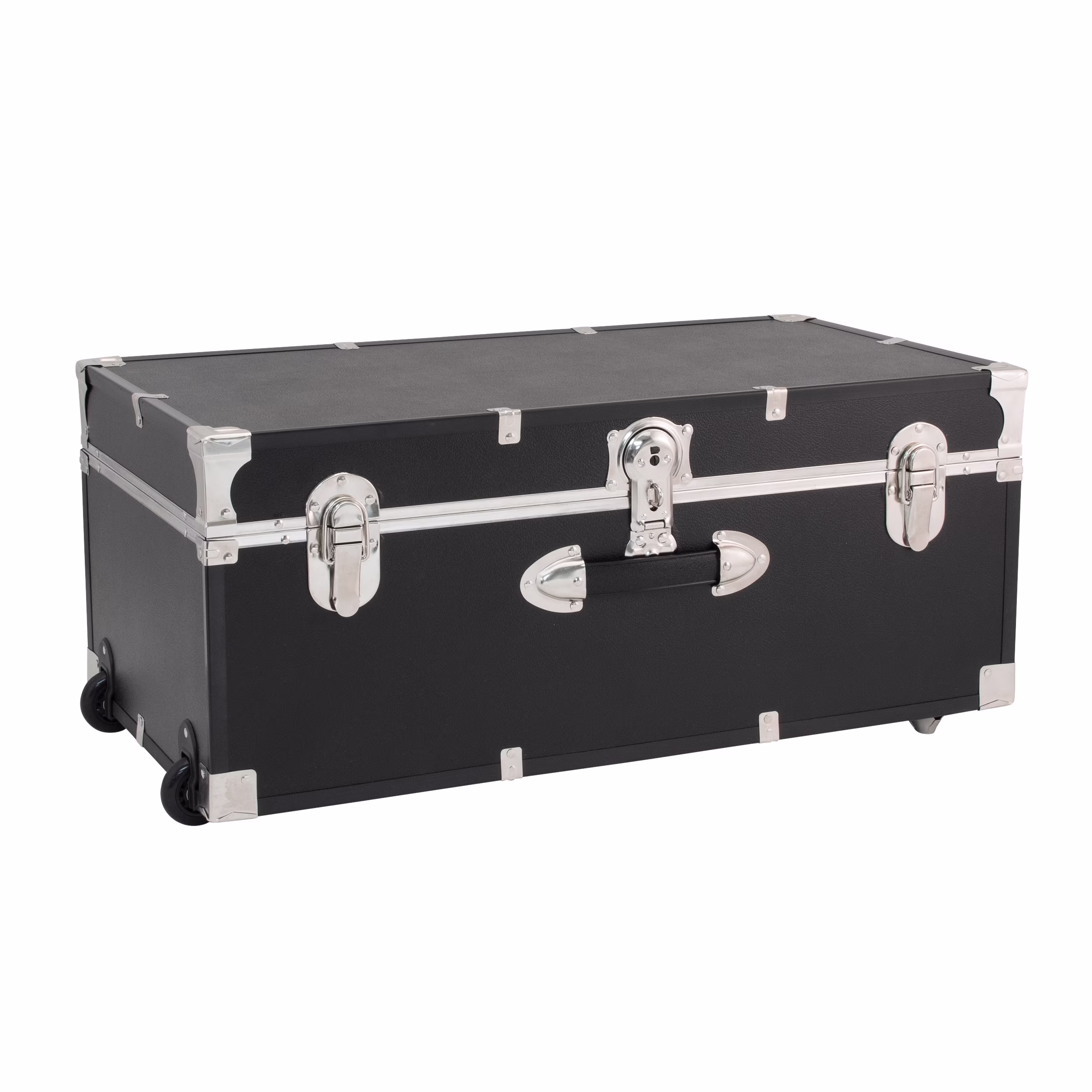 Expand your storage solutions with this Seward Collegiate Collection Footlocker Trunk with Wheels. Durable wooden construction, a heavy gauge vinyl covering and a paper-lined interior to protect contents make this trunk a reliable solution for all of your storage and organizational needs. Designed with durability in mind, the Seward Collegiate Collection Footlocker Trunk with Wheels is made with black high impact styrene bindings, nickel plated hardware and two durable recessed wheels. It also features an easy open push button key lock (includes two keys) and can also be locked with a padlock for added security.Constructed of durable wood and covered with heavy, easy-care vinyl