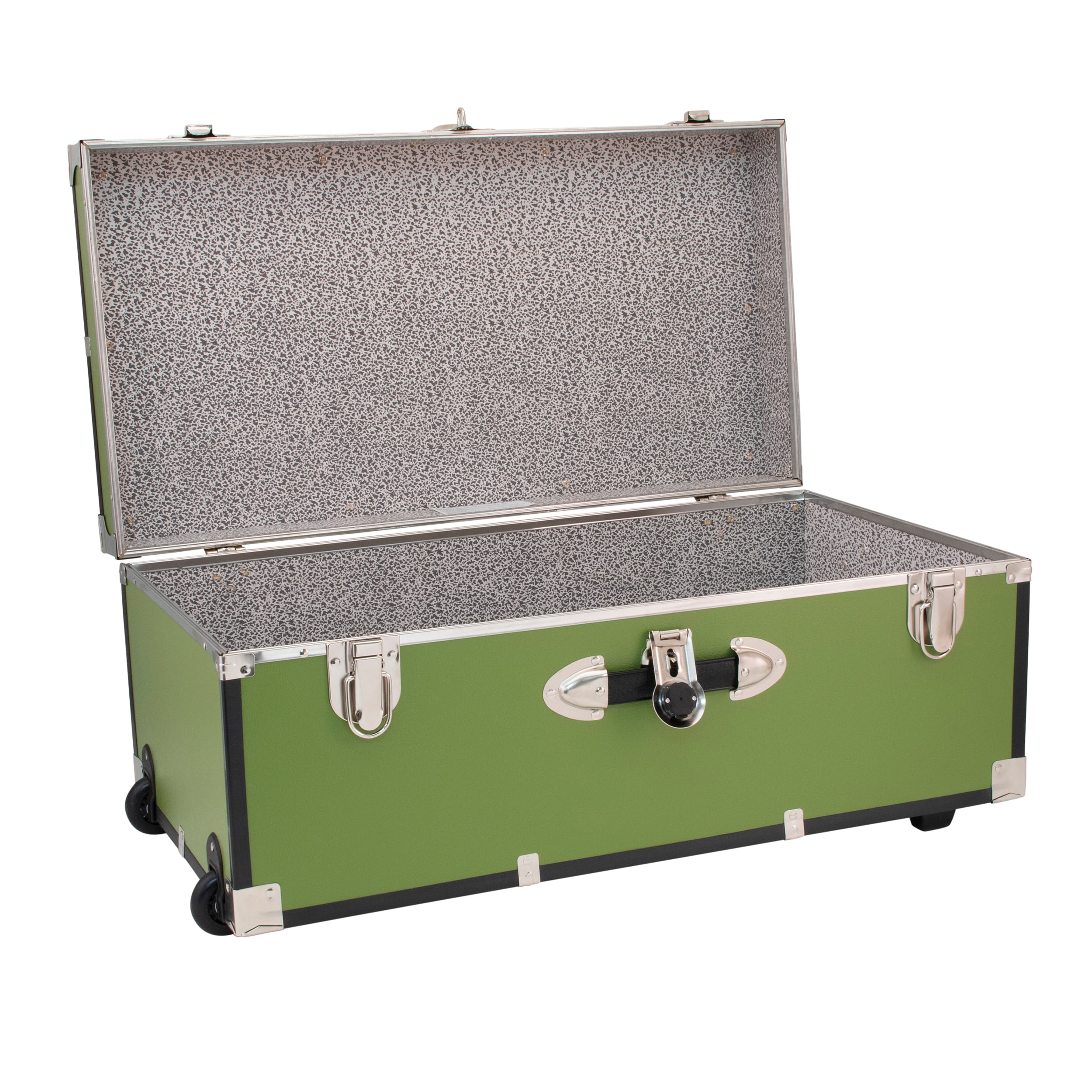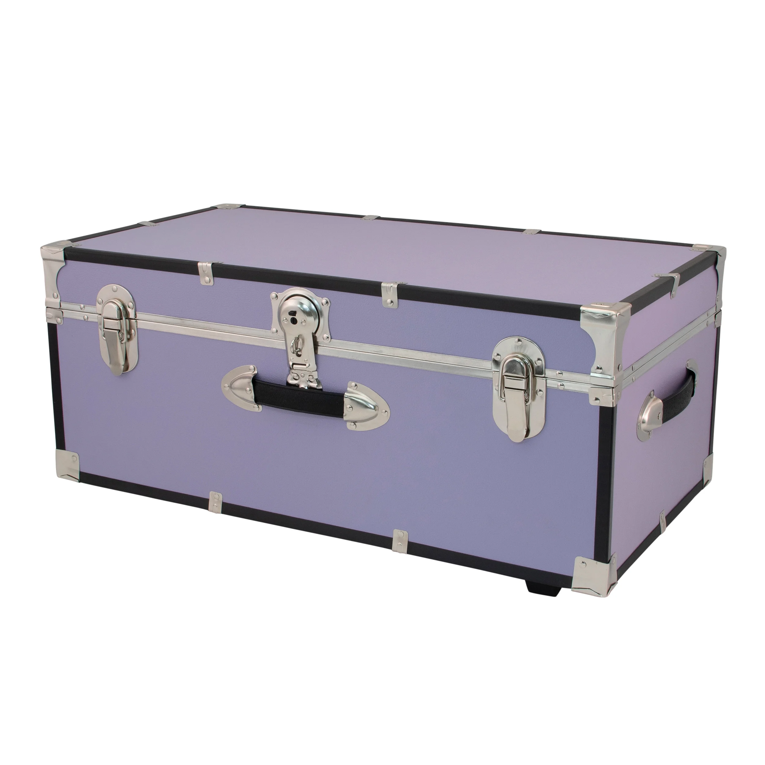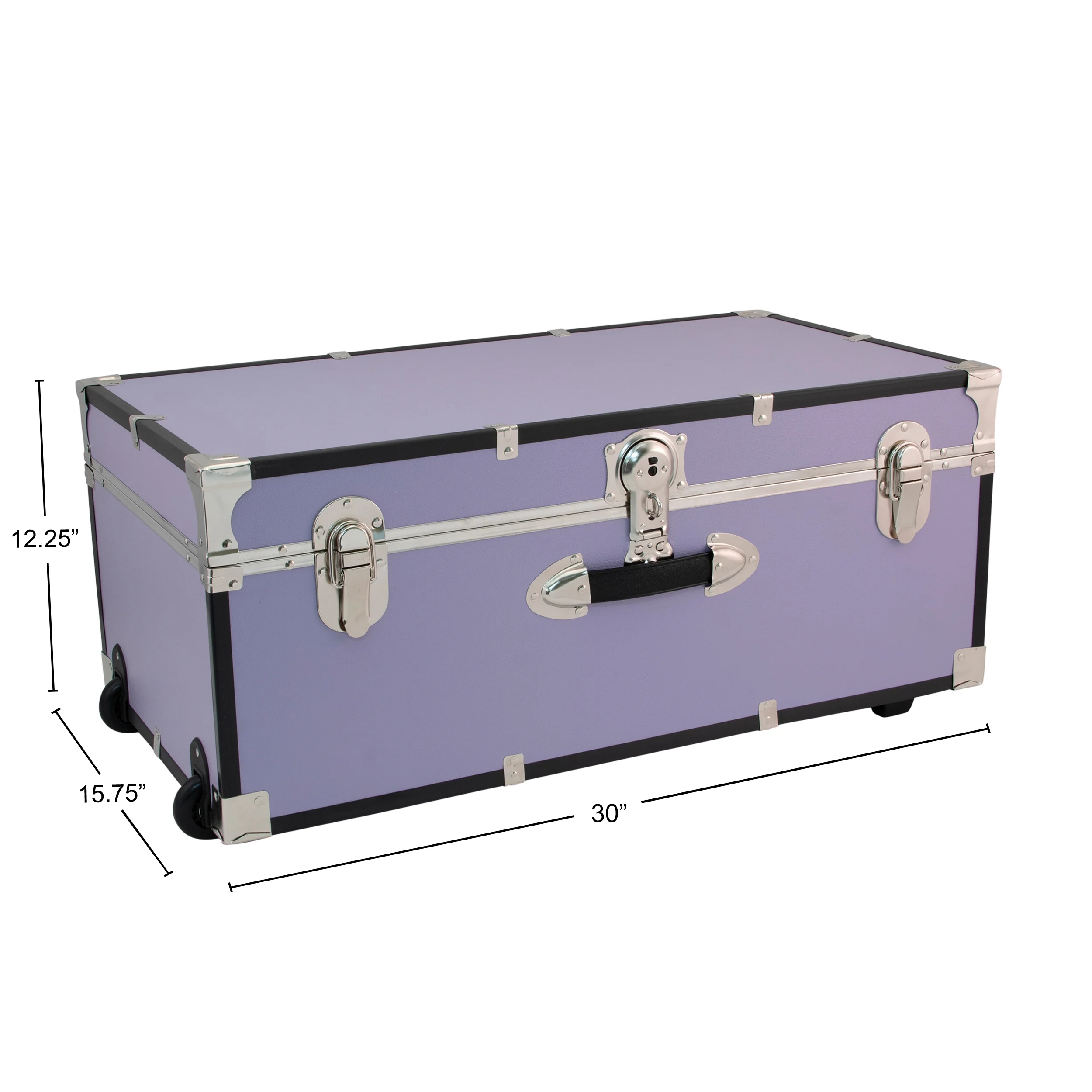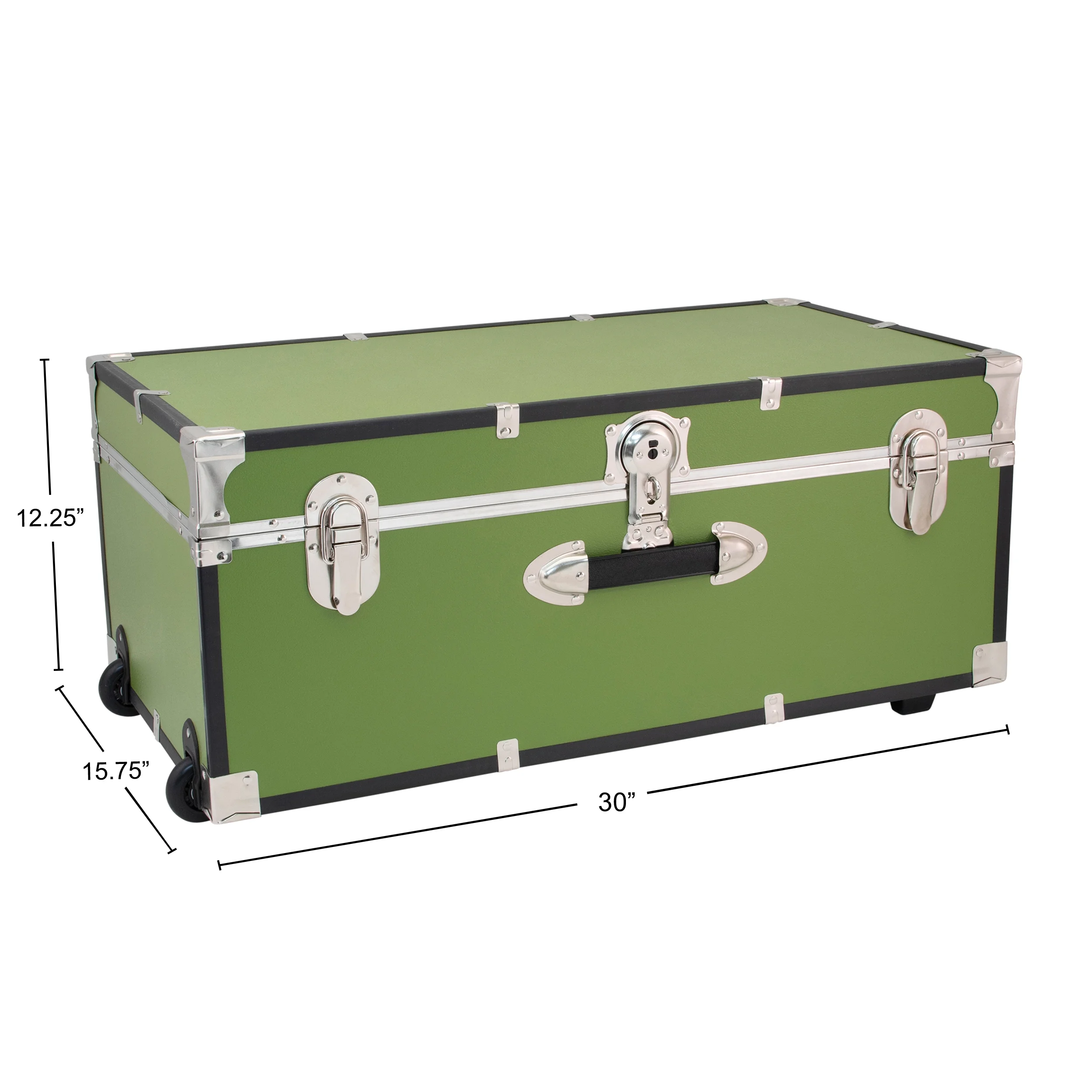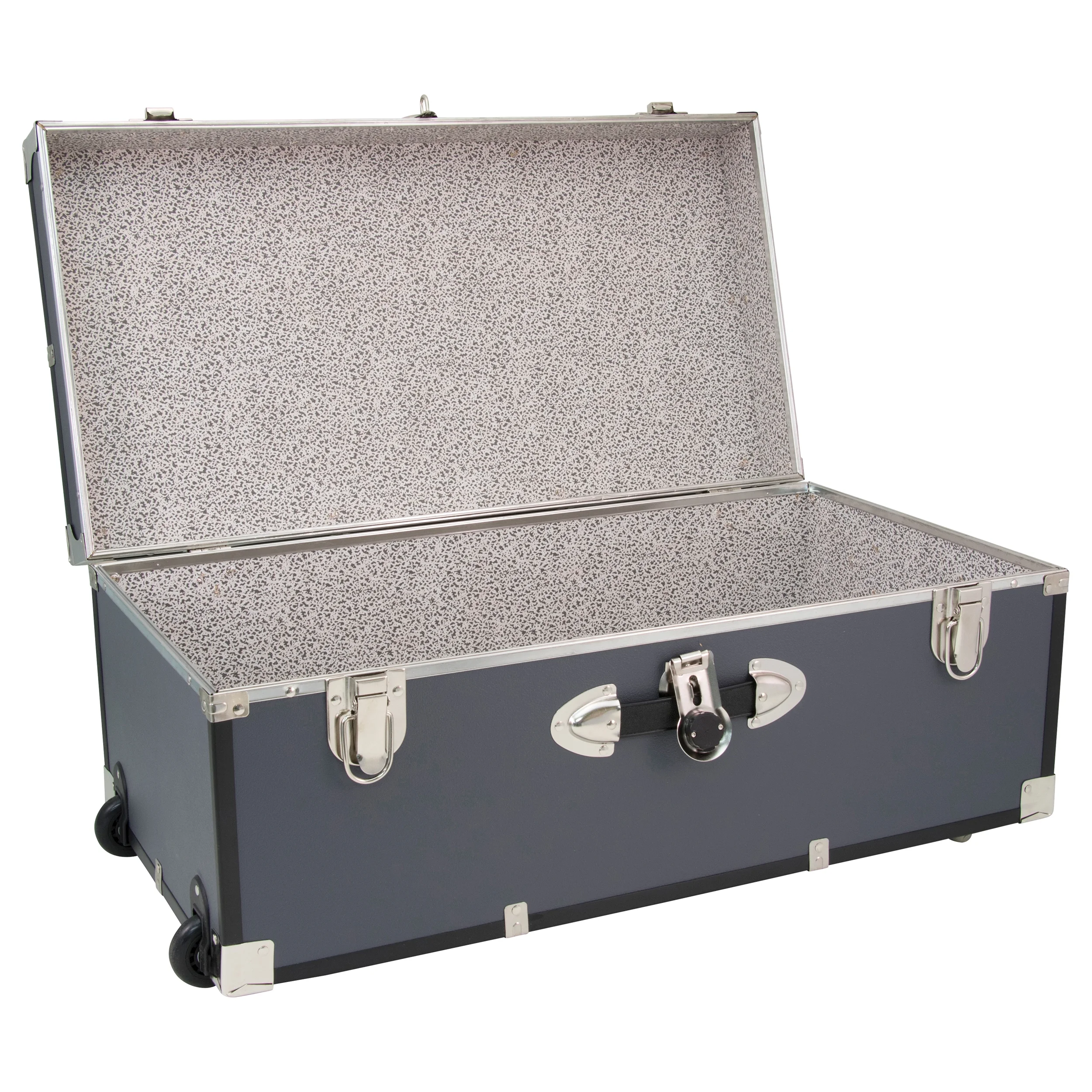 Expand your storage solutions with this Seward Collegiate Collection Footlocker Trunk with Wheels. Durable wooden construction, a heavy gauge vinyl covering and a paper-lined interior to protect contents make this trunk a reliable solution for all of your storage and organizational needs. Designed with durability in mind, the Seward Collegiate Collection Footlocker Trunk with Wheels is made with black high impact styrene bindings, nickel plated hardware and two durable recessed wheels. It also features an easy open push button key lock (includes two keys) and can also be locked with a padlock for added security.Constructed of durable wood and covered with heavy, easy-care vinyl